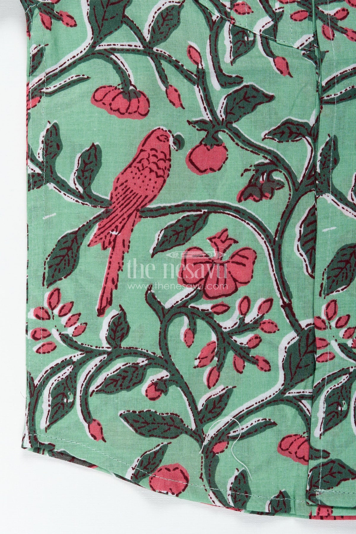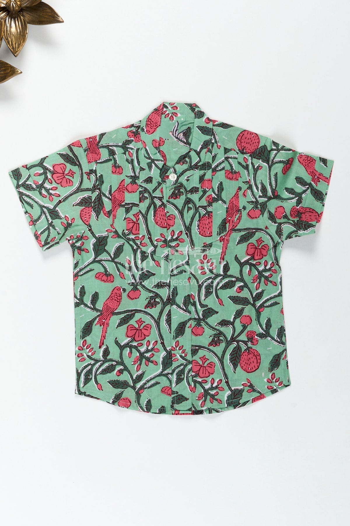 The Nesavu Boys Cotton Shirt Parrot and Botanical Print Boys Cotton Shirt Natureinspired Green Casual Wear Nesavu 16 (1Y) / Green BS276A-16 Nesavu Nature Inspired Green Cotton Shirt Boys Parrot Leaf Print Design Summer Days