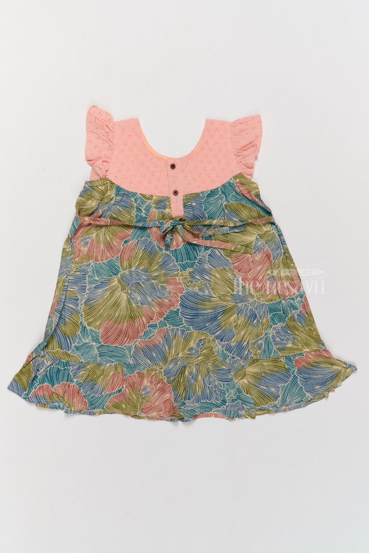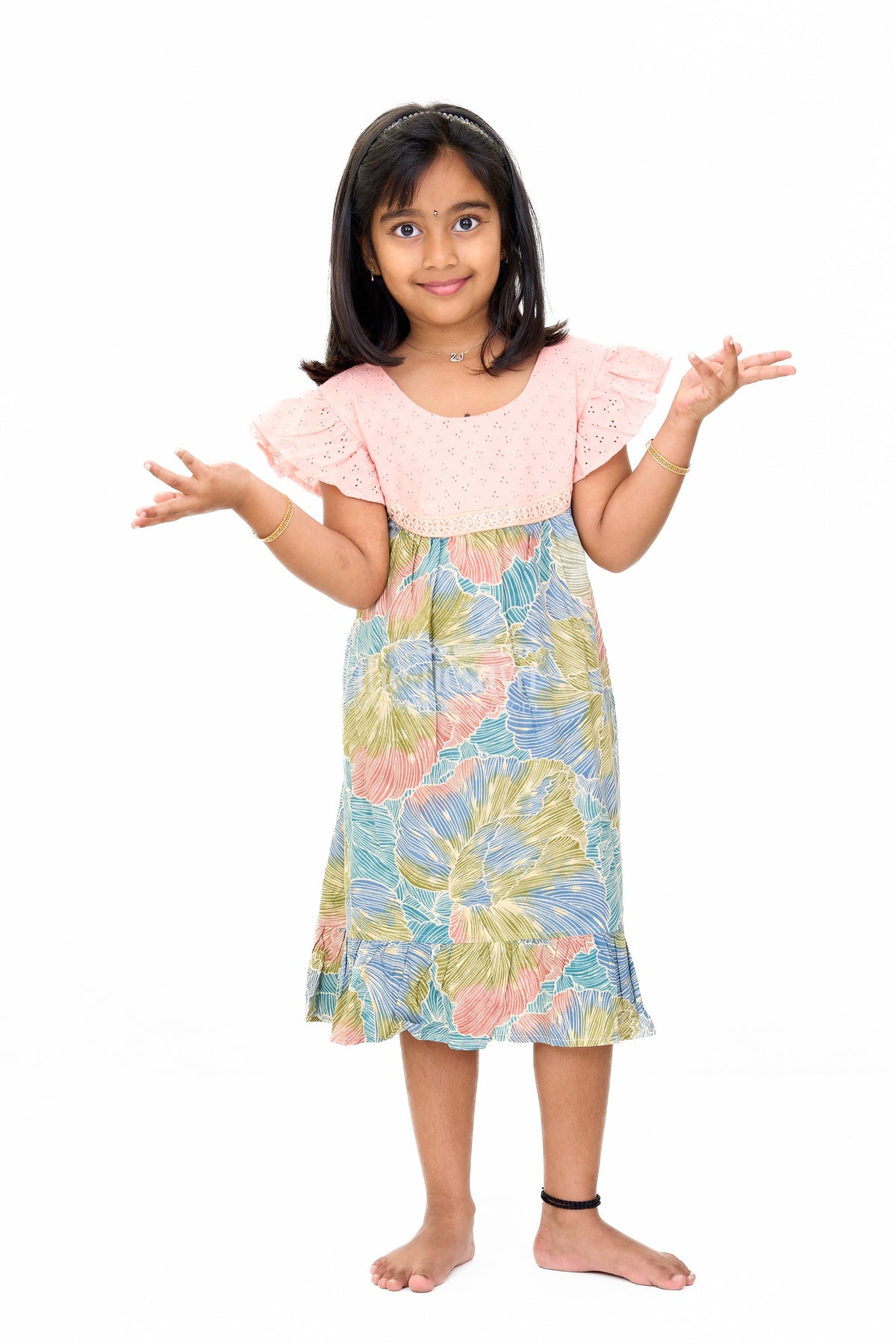 Let your child make a stylish statement with this Cotton New Dress, featuring a vibrant leaf pattern in shades of blue, green, and pink. Made from soft Rayon fabric, this dress ensures comfort without compromising on style. The delicate lace yoke adds a touch of elegance, while the flutter sleeves and ruffled hemline create a playful and youthful silhouette. Perfect for birthday parties or casual family outings, this dress is lightweight, breathable, and easy to wear. Its bold colors and charming design make it an instant favorite in any wardrobe.