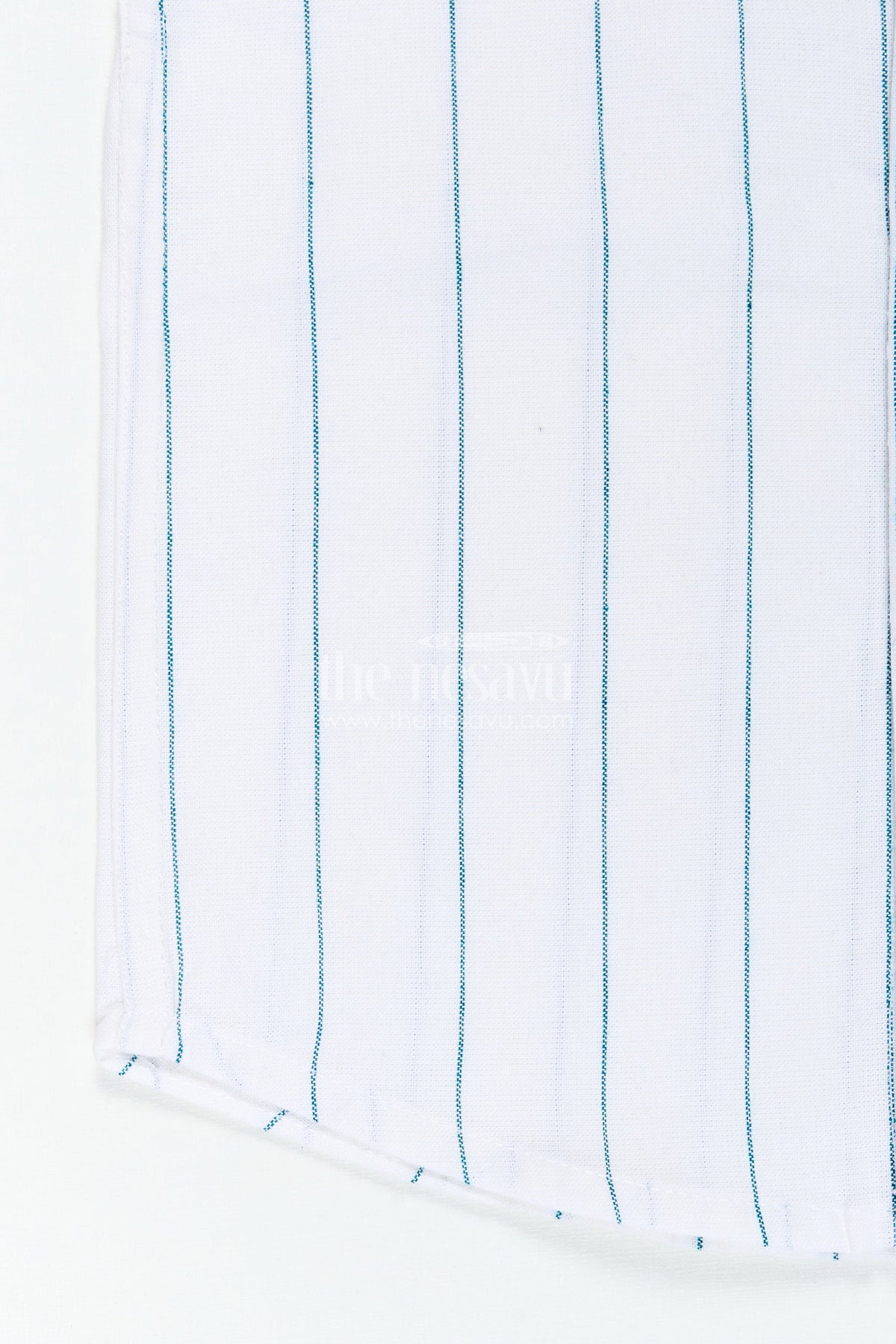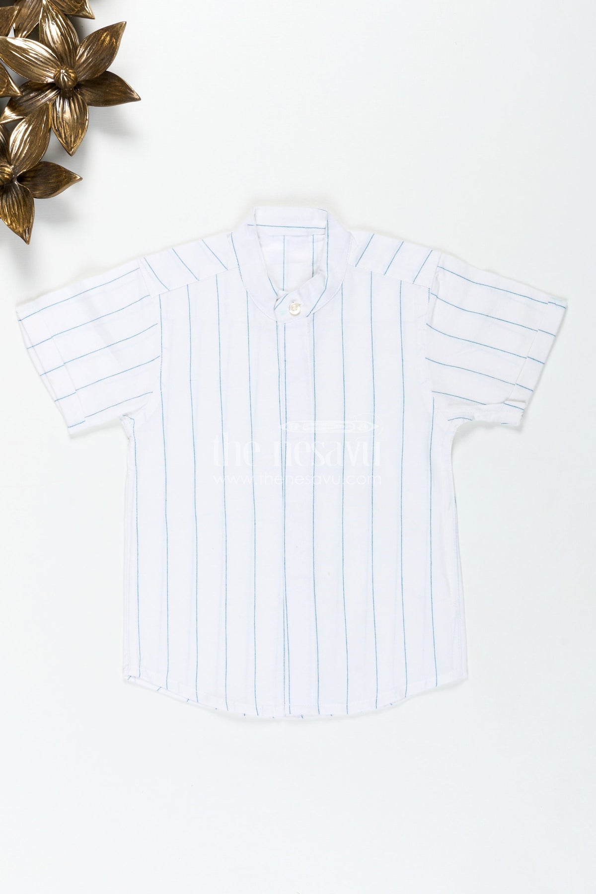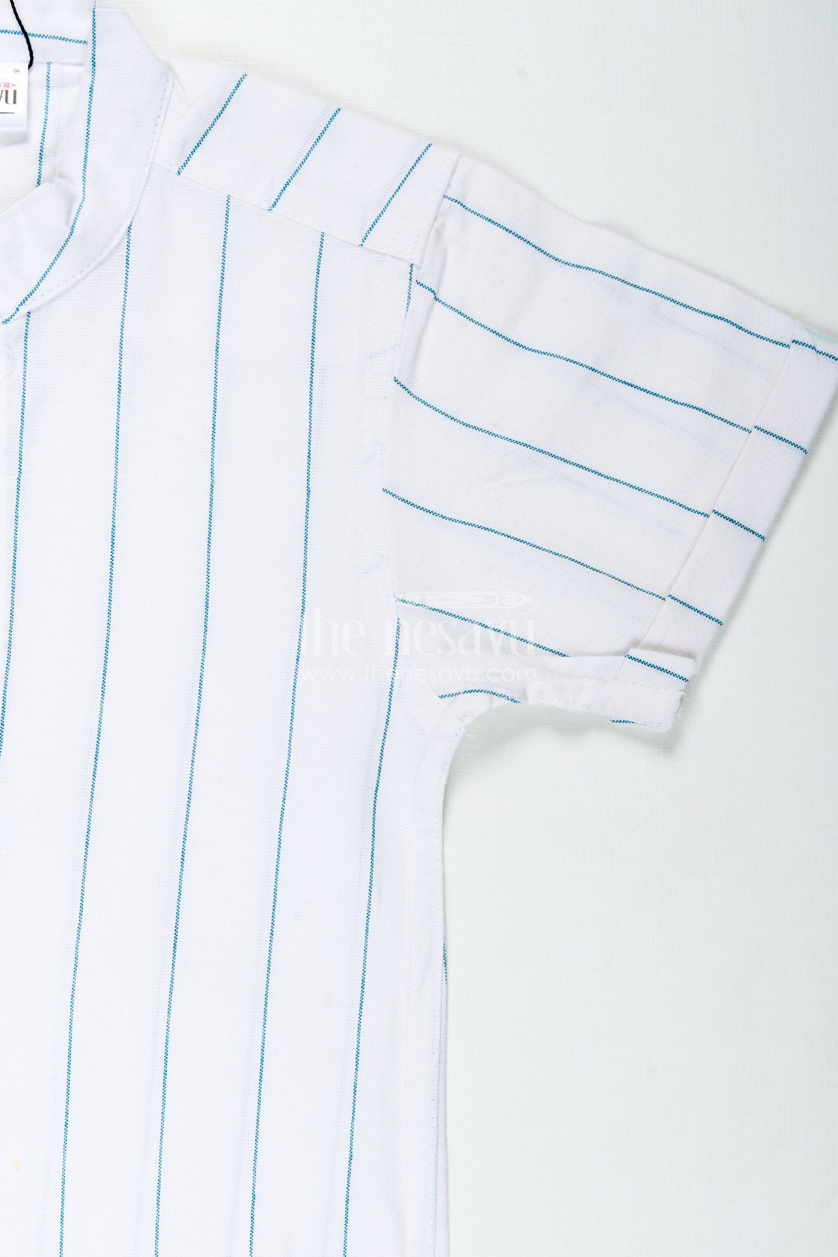 White Striped Shirt for Boys offers clean style and day-long comfort for your little one. Crafted from breathable cotton, this shirt features sleek blue vertical stripes on a white backdrop, creating a refined yet playful design. The fabric is soft against the skin and ideal for warm-weather wear, while the mandarin collar and short sleeves maintain a crisp and polished silhouette. Perfect for school, casual events, or family gatherings, this shirt easily pairs with trousers or jeans. Lightweight, stylish, and versatile—this is a wardrobe staple for every young boy.