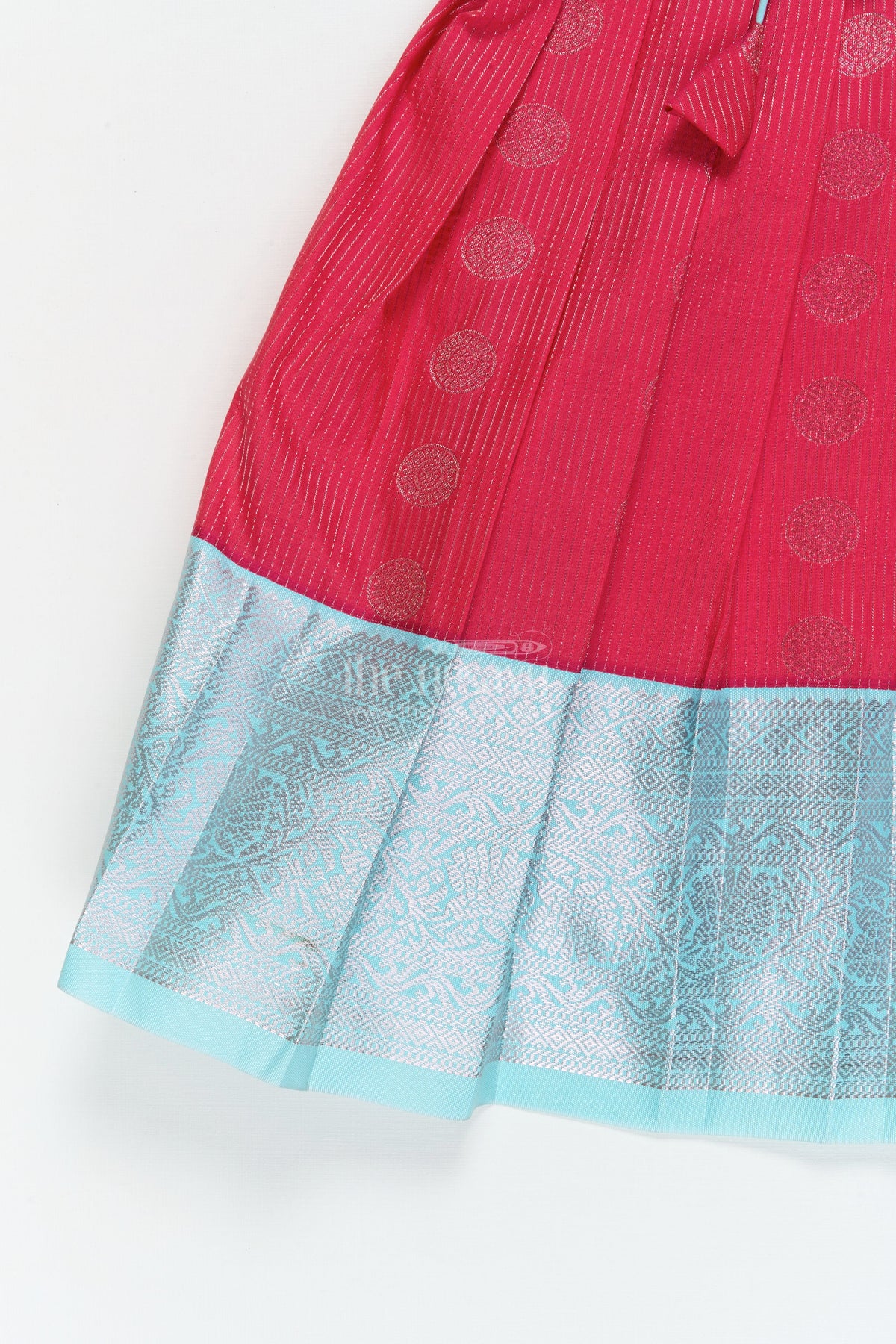 • Made from semi Kanchivaram silk, it features a zari-woven skirt with a graceful traditional border