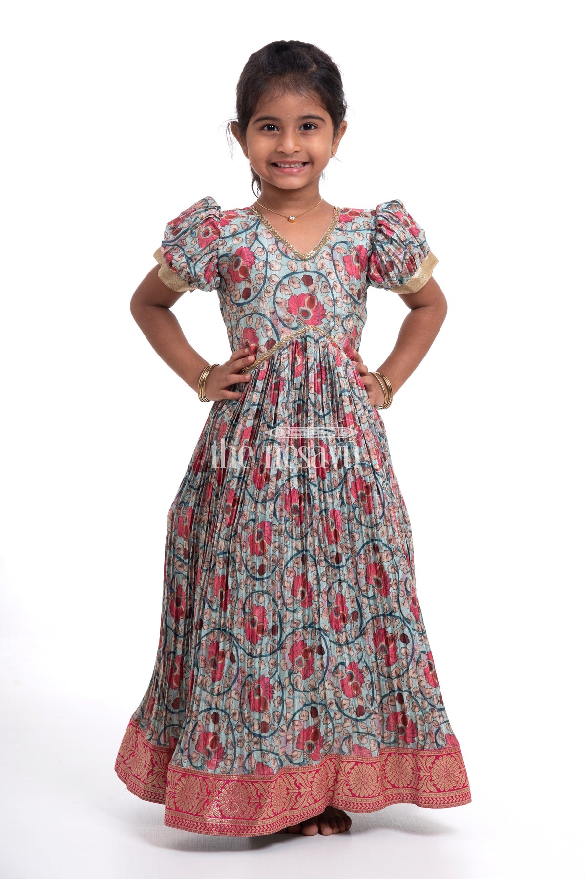 Dress your little girl in this Elegant Green Kalamkari Chinon Party Gown, perfect for festive occasions and celebrations. This beautiful gown features a traditional Kalamkari-inspired print on soft Chinon fabric, with a brocade attached border and embellished neckline and waistline. The Alia cut design ensures a comfortable fit while adding a touch of sophistication.