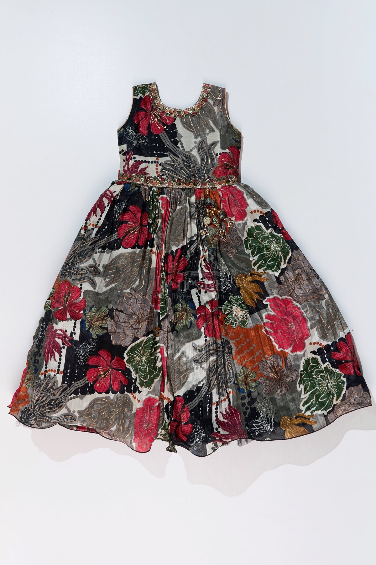 Let your little one shine in this stunning black sequin evening gown, designed for elegance and sophistication. Featuring a rich floral digital print on luxurious Chinon fabric, this gown is accentuated with shimmering sequin details for a glamorous look. The sleeveless design and flowing silhouette ensure comfort and style, while the embroidered waist belt adds a touch of refinement. Perfect for weddings, parties, or evening events, this gown guarantees a regal and stylish appearance.