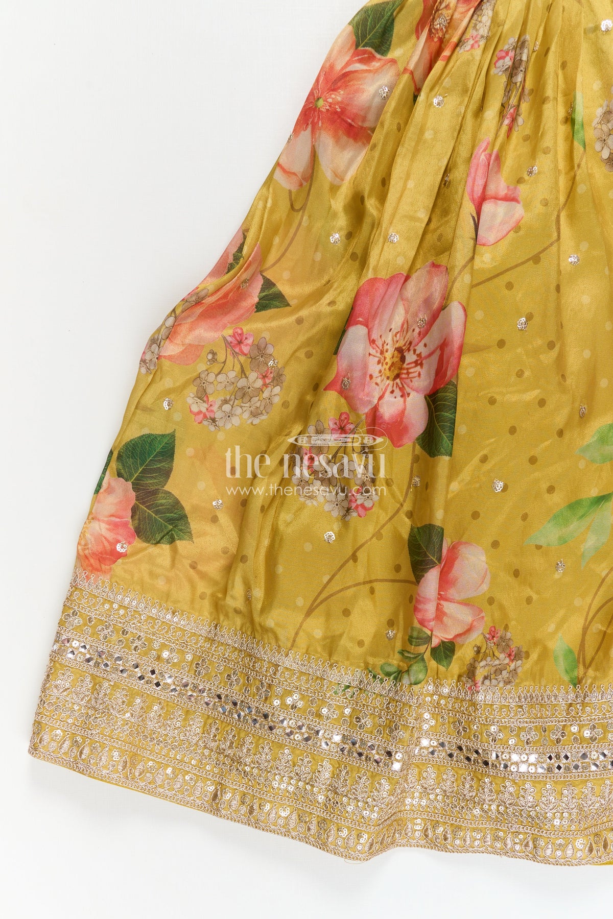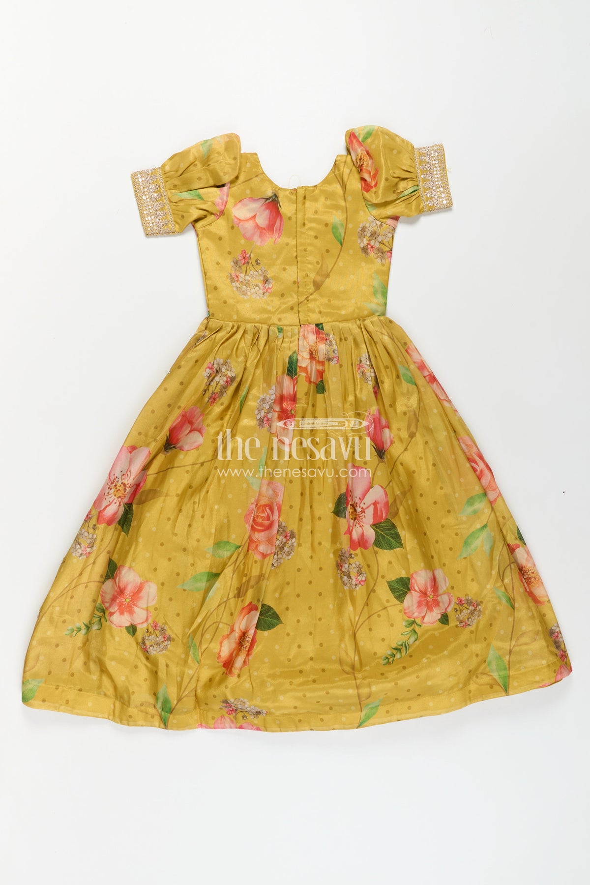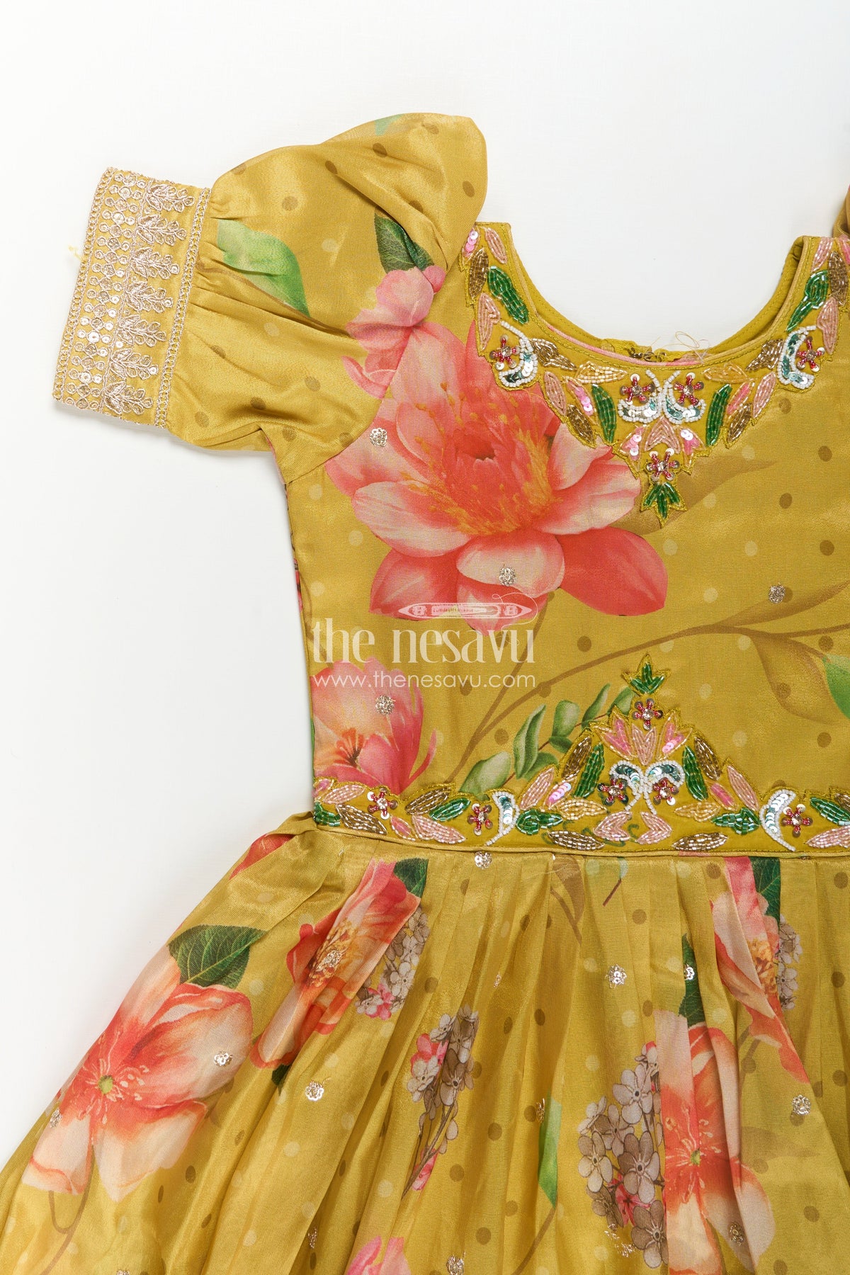 Turn special occasions into magical moments with this stunning party anarkali dress made for young girls who adore elegance. Crafted in luxurious blend chinon silk, the dress features a radiant yellow base enhanced with large floral digital prints in rose pink, coral, and soft ivory. The bodice showcases delicate embroidery near the neckline and waist, while the puff sleeves with golden brocade cuffs add traditional richness. The full-length flared skirt is adorned with a lavish embroidered sequin border that glimmers with every step. Ideal for weddings, receptions, and cultural celebrations, this gown-style anarkali dress is designed to offer both visual grandeur and lasting comfort.