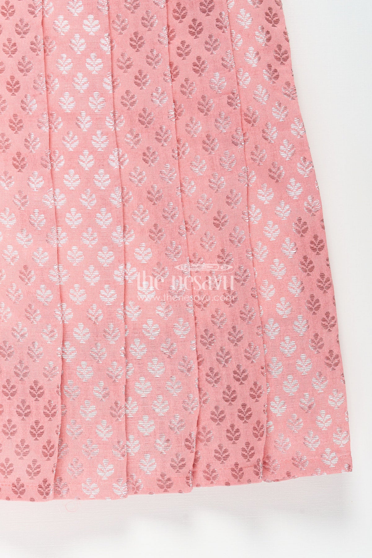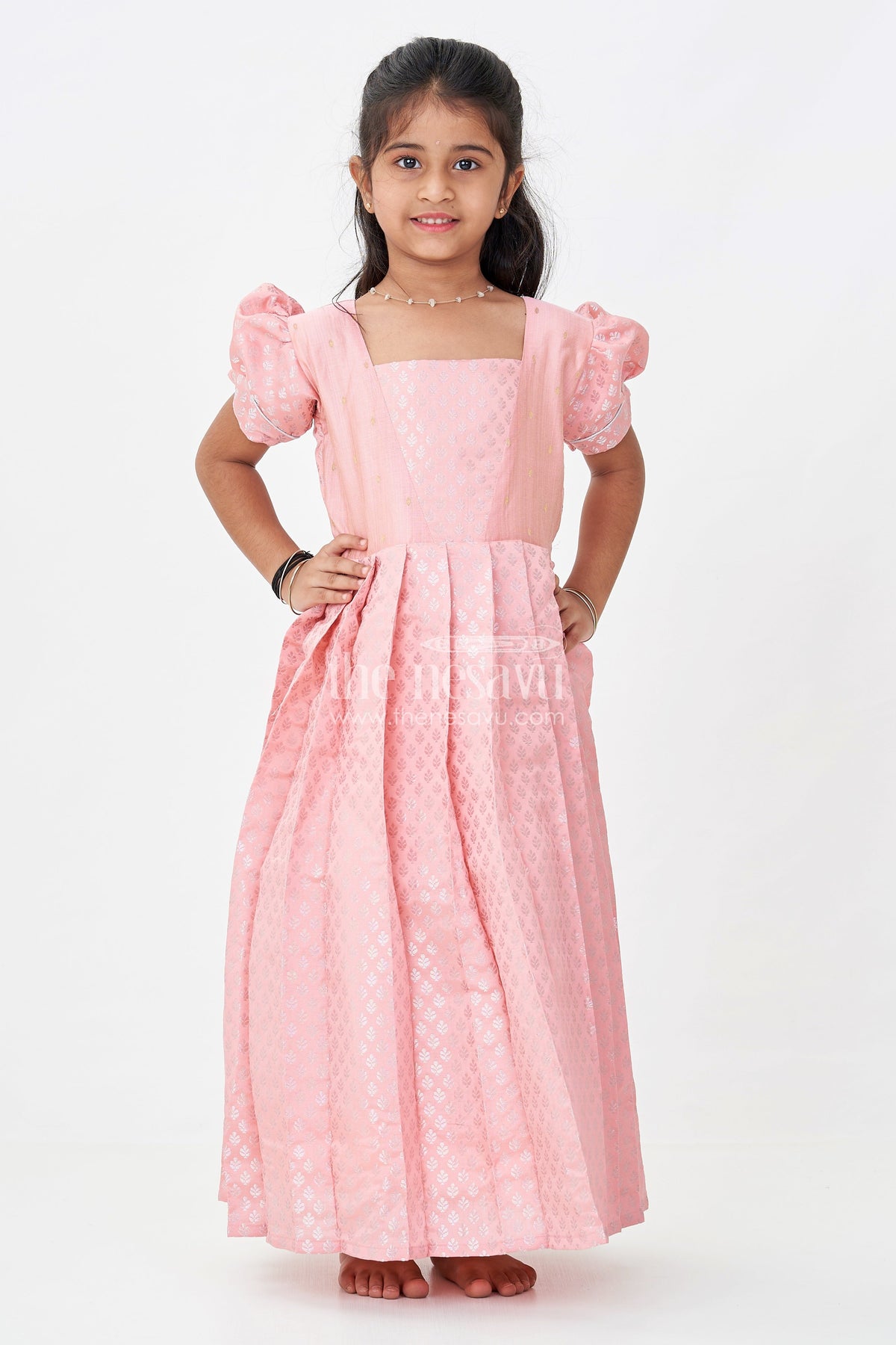 This pink party wear gown in semi banaras silk delivers a harmonious blend of rich texture and delicate design. Showcasing a muted peach-pink hue, the frock features intricately woven floral motifs all over, including the pleated skirt and bodice panel. Puff sleeves add a traditional silhouette, while the subtle shimmer from the banaras weave gives it a festive glow. Ideal for weddings, family functions, and cultural celebrations, this gown offers breathability, comfort, and an elevated ethnic charm. A wardrobe essential for young girls who love elegance with a touch of tradition.