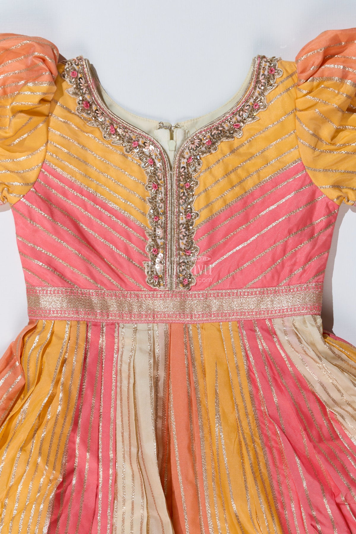 This stunning yellow gown is designed to make your little one shine at any festive occasion. Crafted from luxurious Banarasi Kali jacquard silk blend fabric, this gown features a beautiful mix of vibrant yellow, pink, and gold hues in a mesmerizing geometric pattern. The intricately embellished neckline adds a regal touch, while the puffed sleeves enhance its elegance. The flared silhouette allows for graceful movement, making it an excellent choice for weddings, cultural functions, and birthday celebrations. Designed for both comfort and style, this gown includes a back zip closure for easy dressing, ensuring a hassle-free and elegant look.