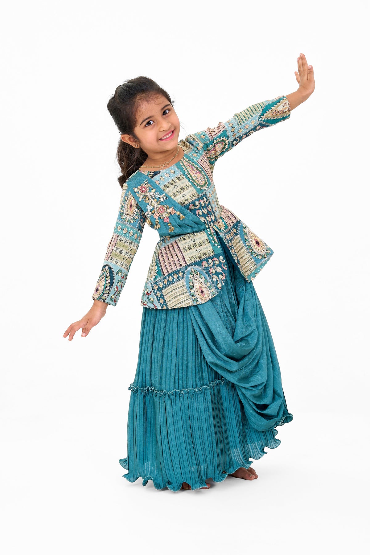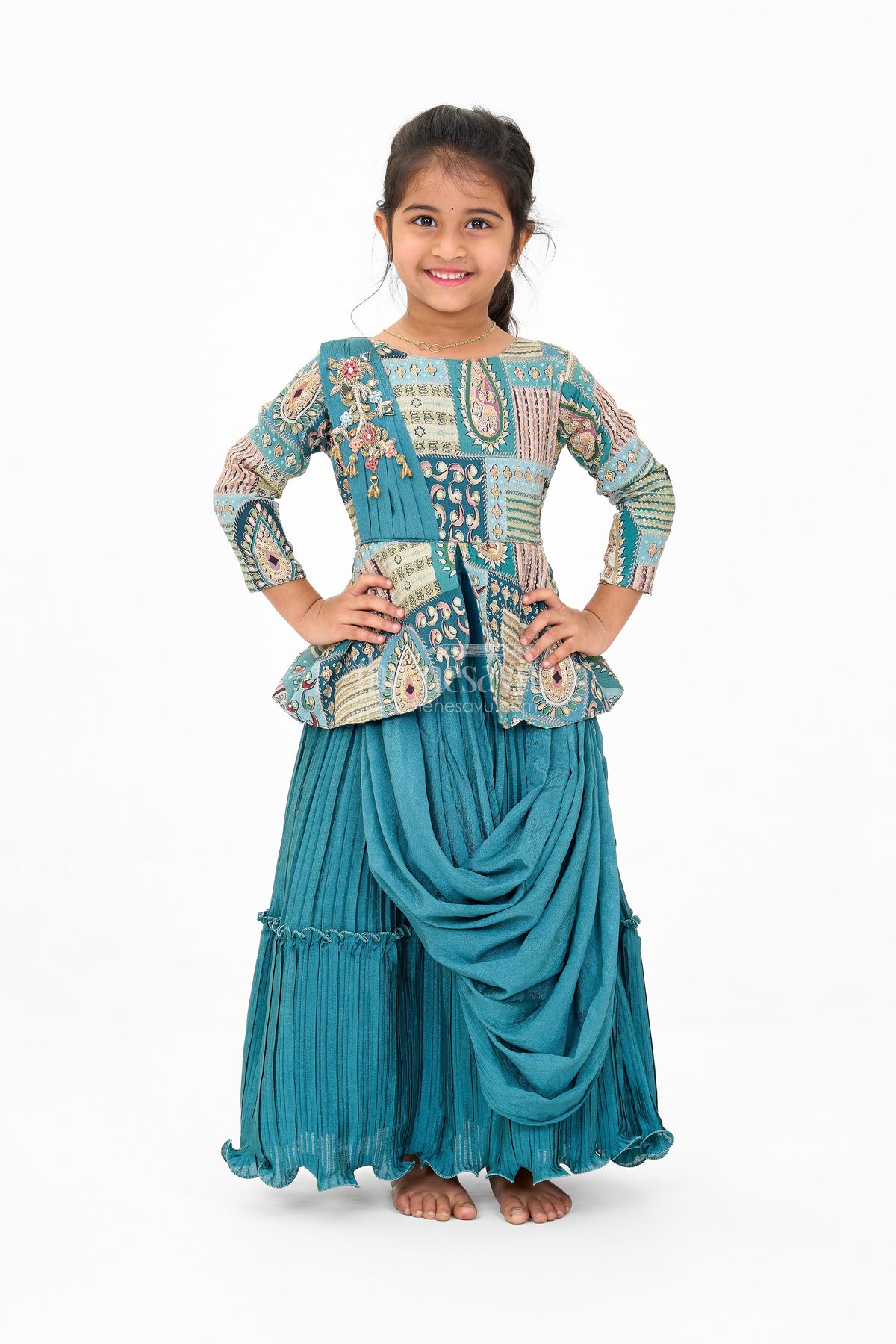 This elegant girls silk gown is crafted from luxurious gold tissue silk that glistens with a soft sheen, creating a captivating look for special occasions. The gown features structured pleats that offer a voluminous silhouette, adding a regal touch to the overall design. Highlighting the waist is an intricately embroidered floral waistband that brings a splash of vibrant color. The puff sleeves provide a nostalgic charm, while the rich red border at the hem contrasts beautifully with the gold fabric, adding a traditional yet striking detail. Perfect for weddings or cultural celebrations, this gown combines timeless design with contemporary flair.