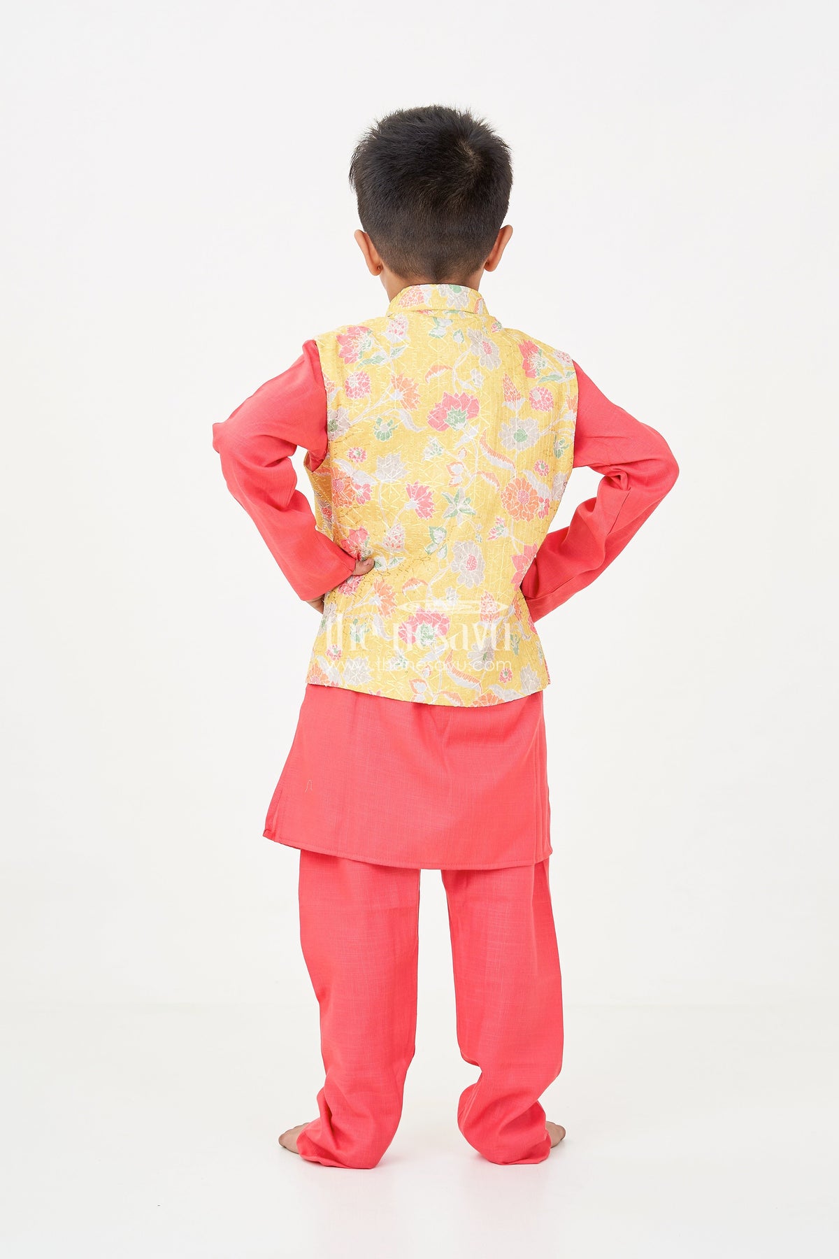Red kurtha gets a festive makeover with this Nesavu boys jacket set that combines bold colors and celebratory vibes. The set features a solid red kurta and pants made from a soft silk blend, paired with a multicolor printed jacket detailed in floral patterns and subtle shimmer. The vibrant yellow base of the jacket creates a stunning contrast, while traditional buttons add a classic finish. Perfect for birthdays, weddings, or traditional functions, this outfit blends ethnic charm with youthful energy and comfort.