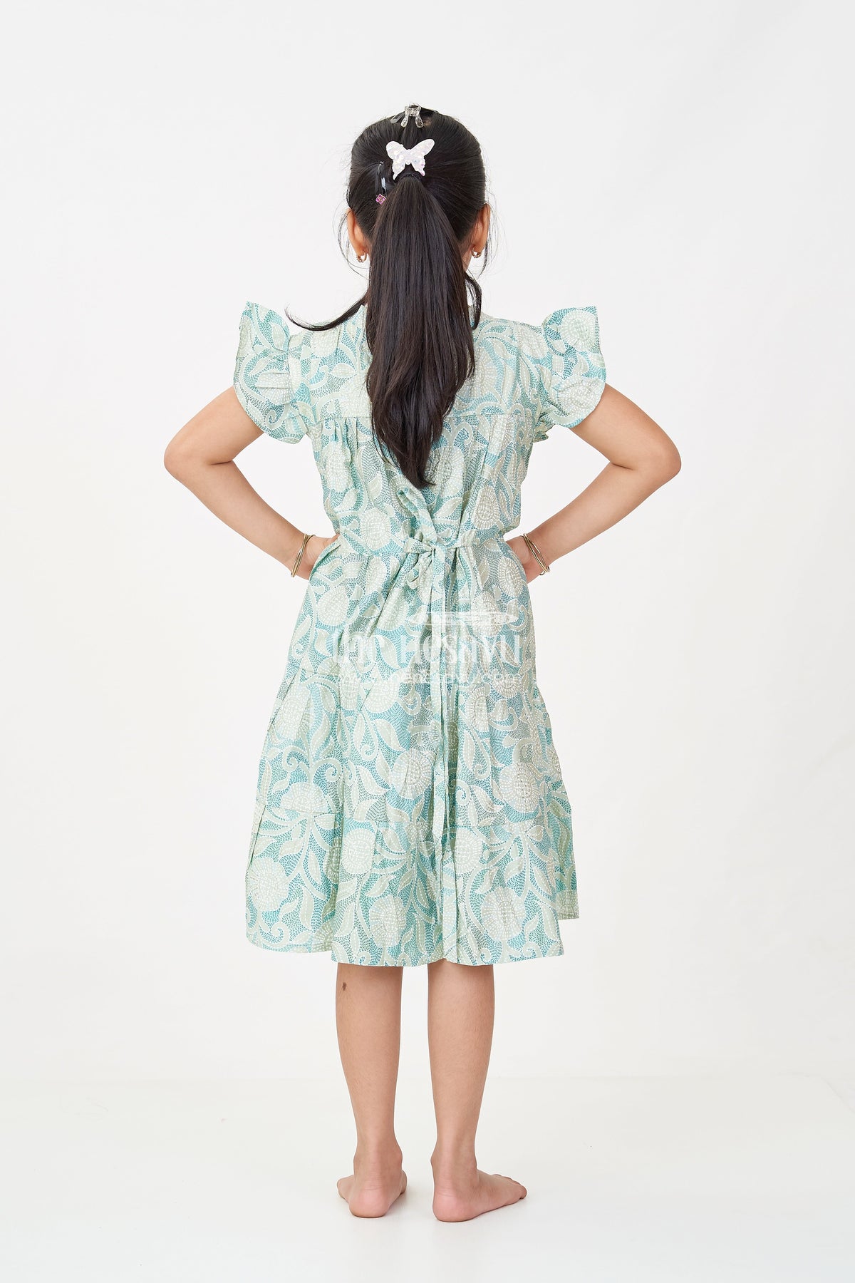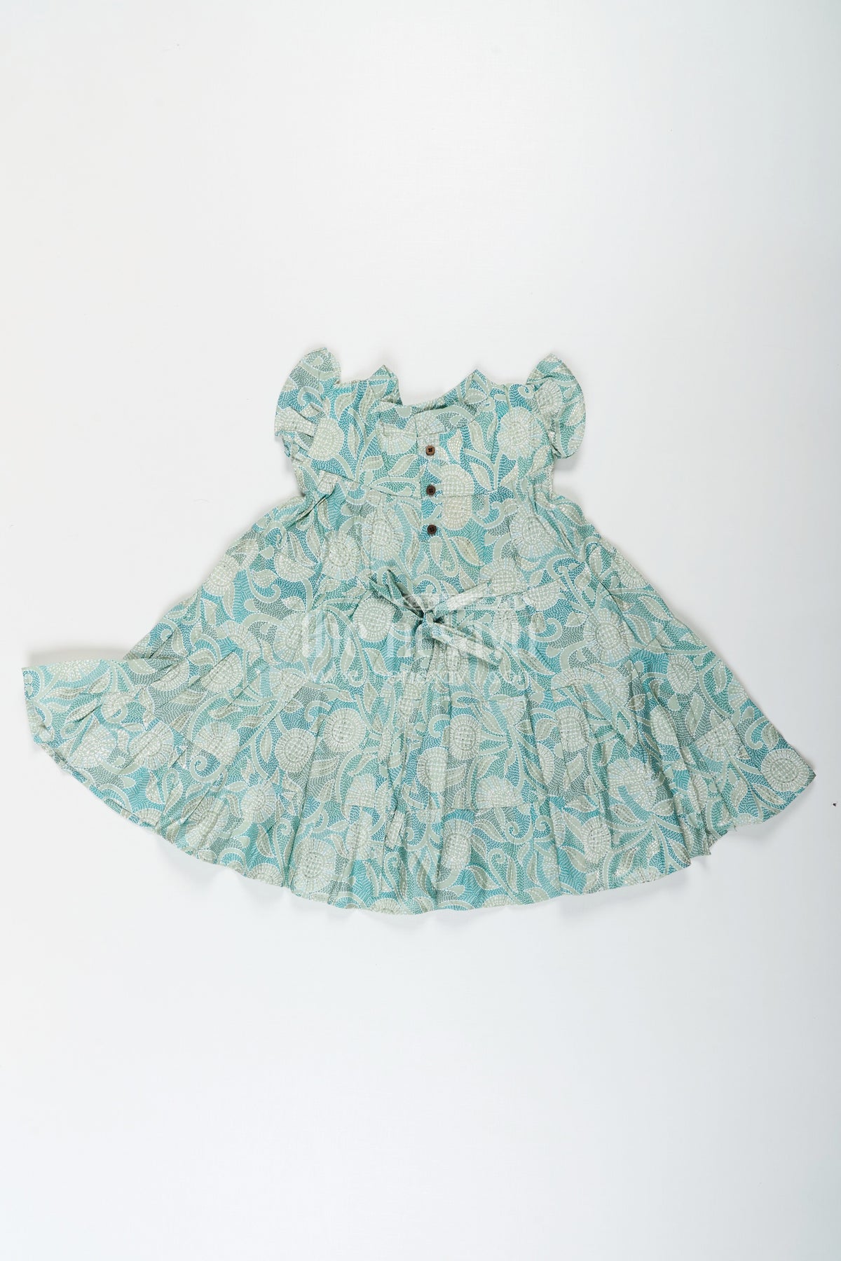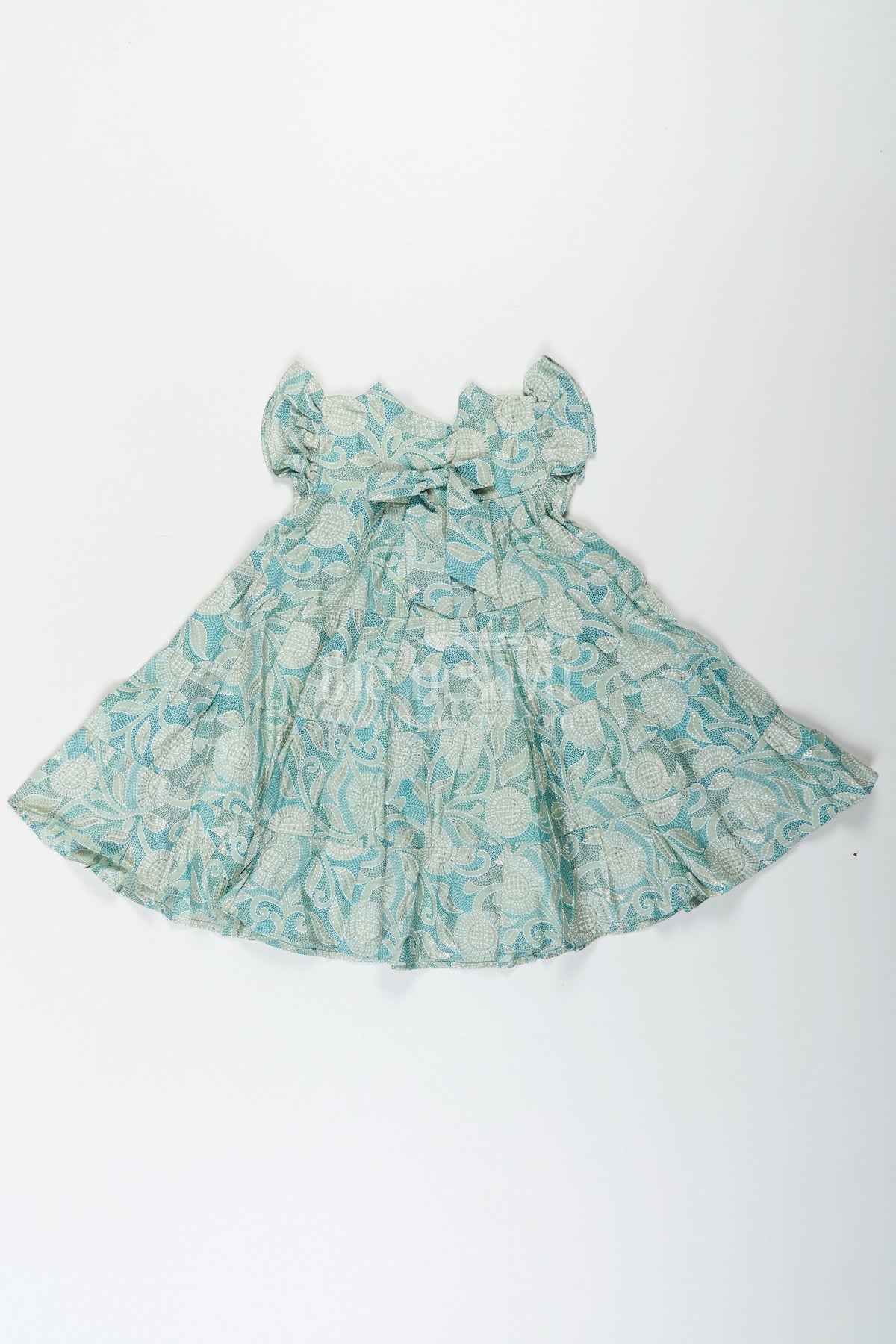 Designed for comfort with a hint of tradition, this casual frock for baby features a delicate kantha stitch-style digital print in shades of blue and beige. Crafted in soft modal silk with kantha style fabric, the dress has flutter sleeves and a layered skirt that offers a breezy, relaxed silhouette. The front bow adds a sweet finish to the bodice. Whether worn for day-to-day activities or casual family gatherings, this frock is a charming and comfortable addition to your little one's wardrobe.