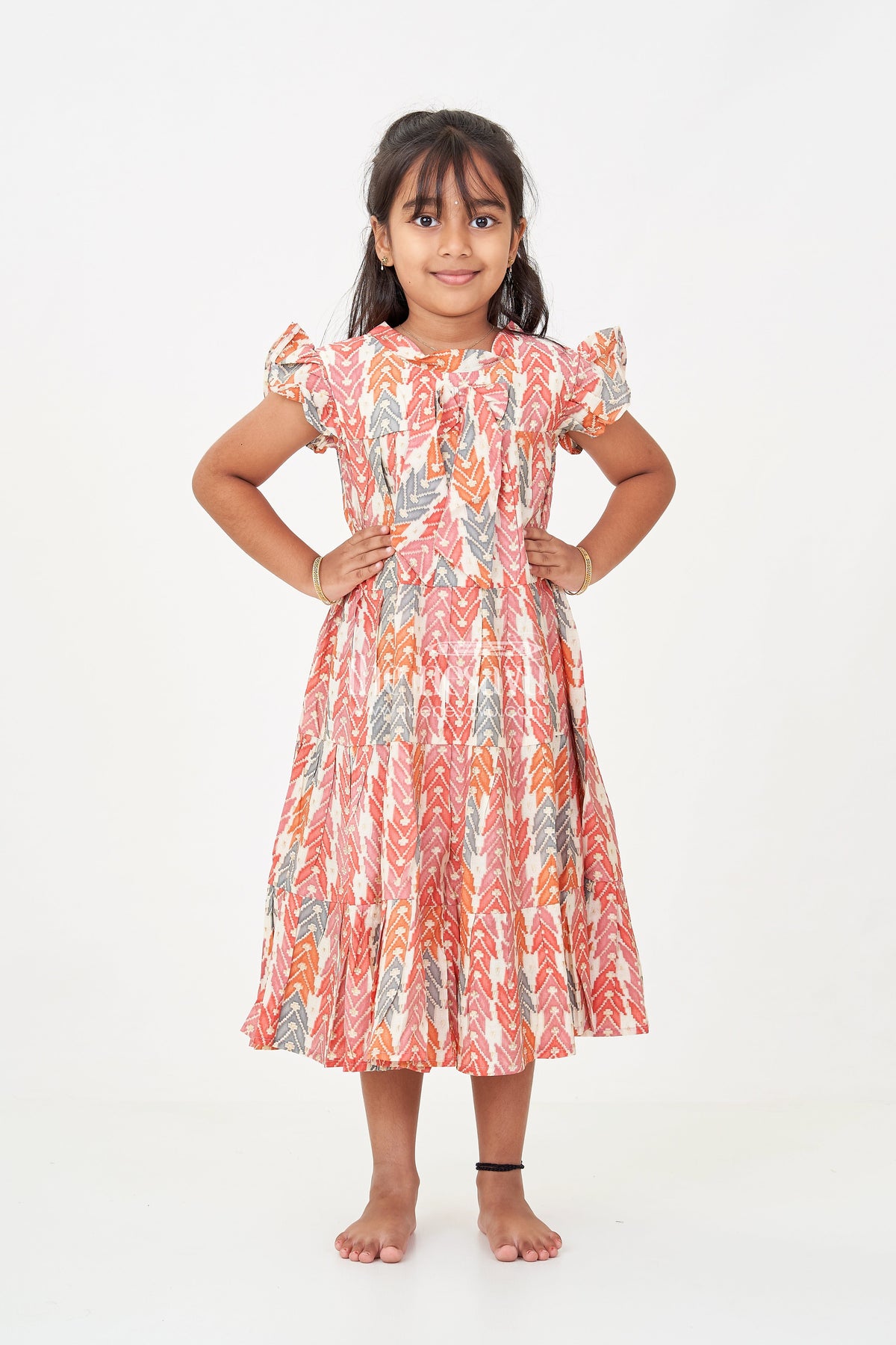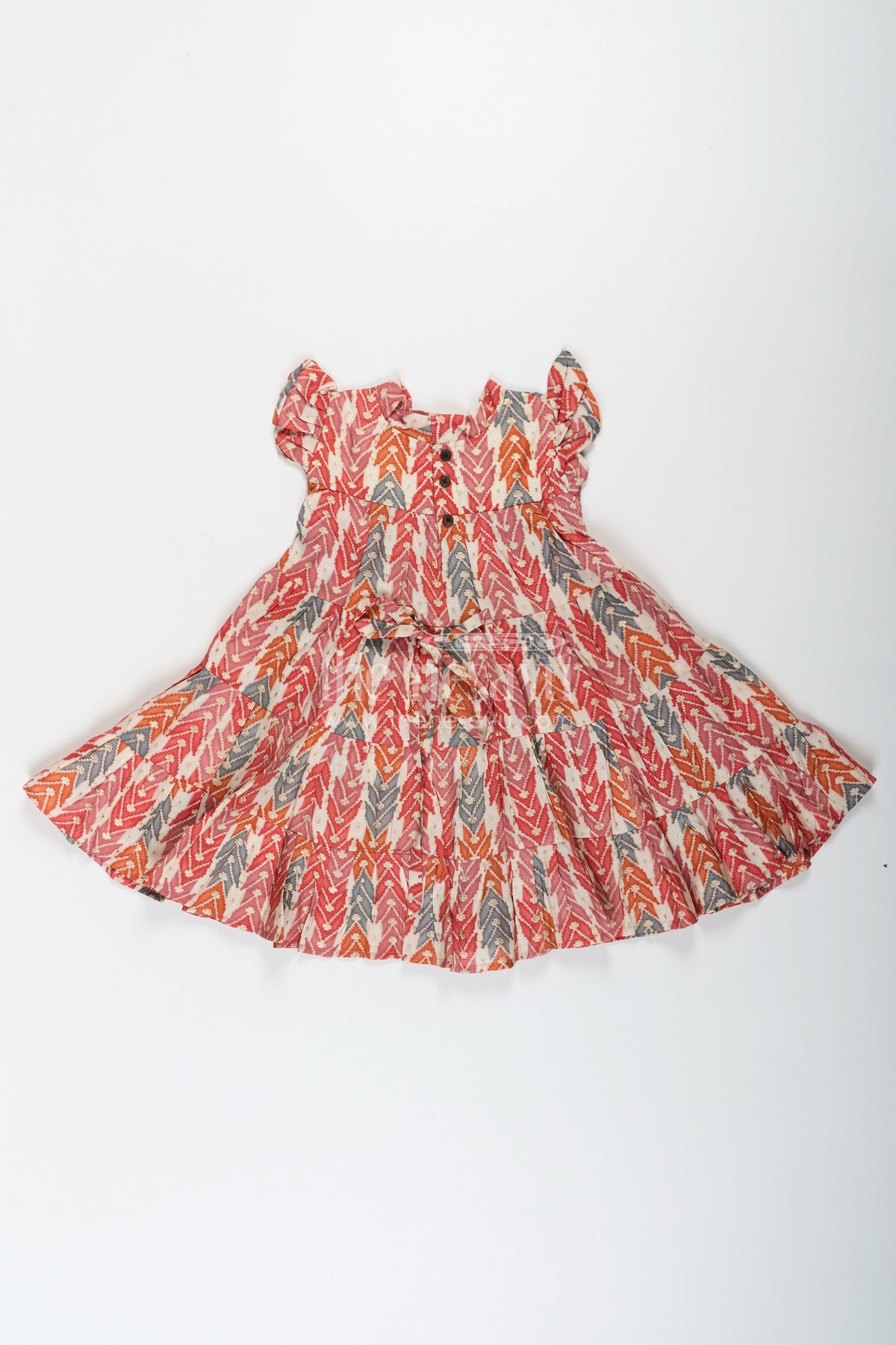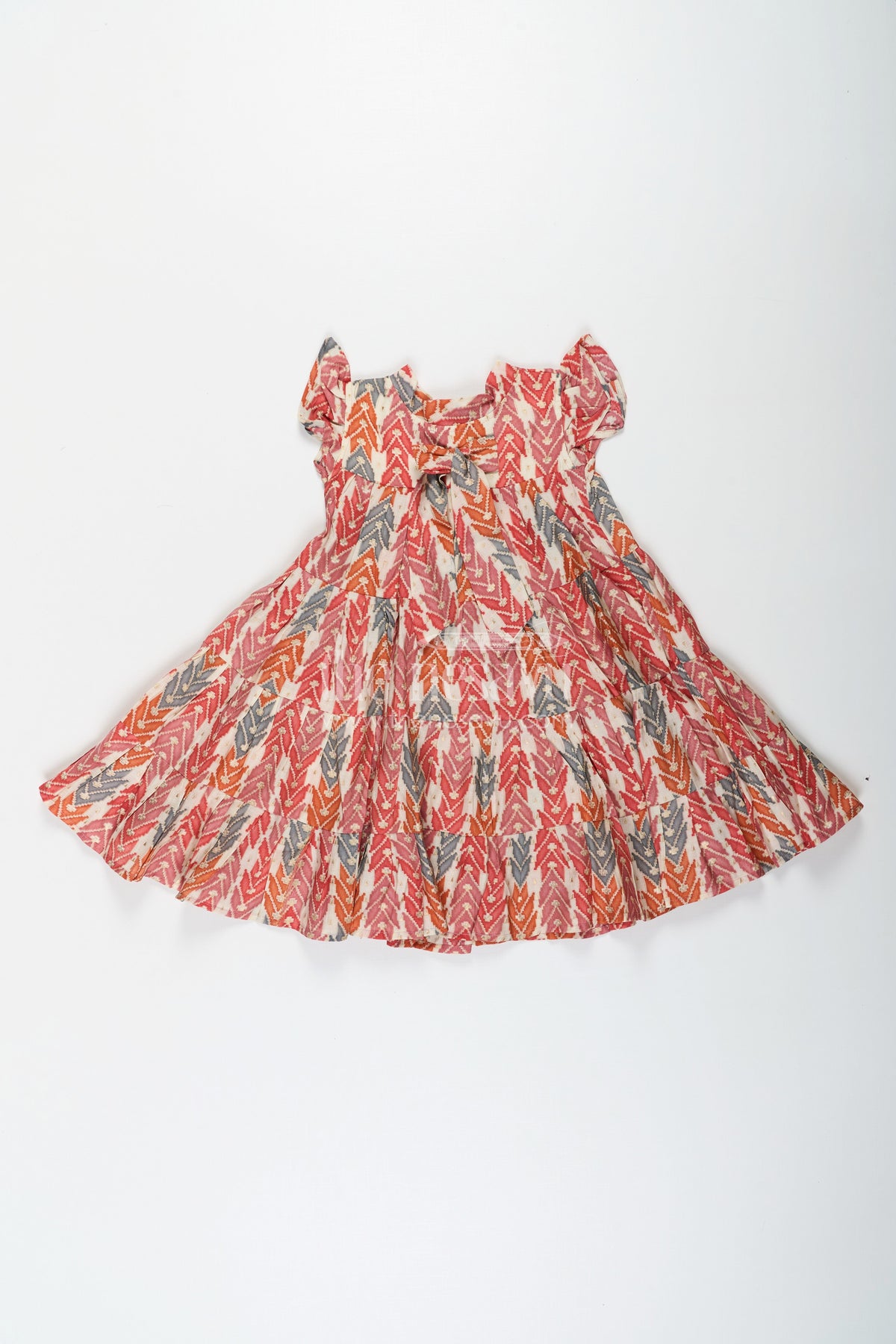 Bright and lively, this checks frock is perfect for adding bold energy to your child’s wardrobe. Crafted from breathable modal silk fabric, the dress features a multicolor geometric digital print in earthy tones of red, orange, and grey. The tiered layers and playful bow at the chest add a fun twist to its classic silhouette, while the flutter sleeves offer comfort and mobility. This frock is ideal for casual days, picnics, and playdates, making it a versatile must-have for any little fashionista.