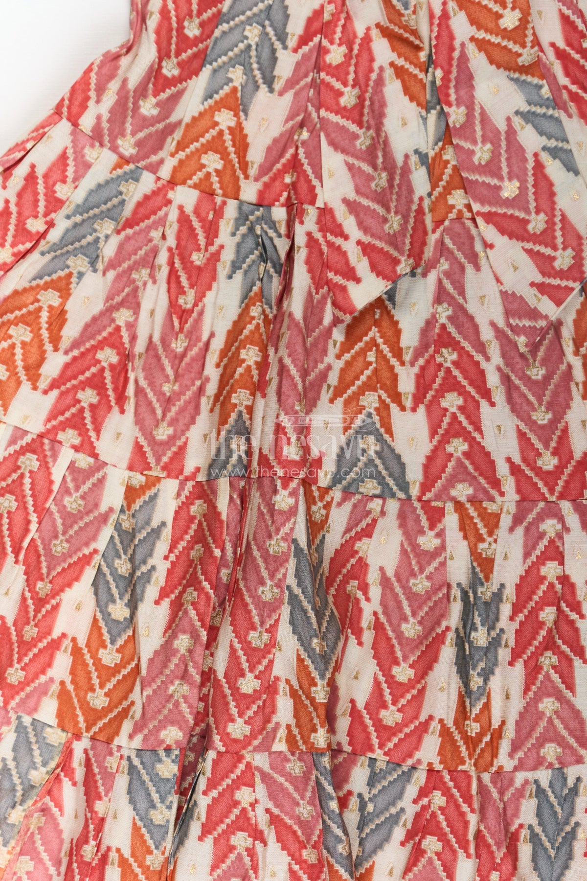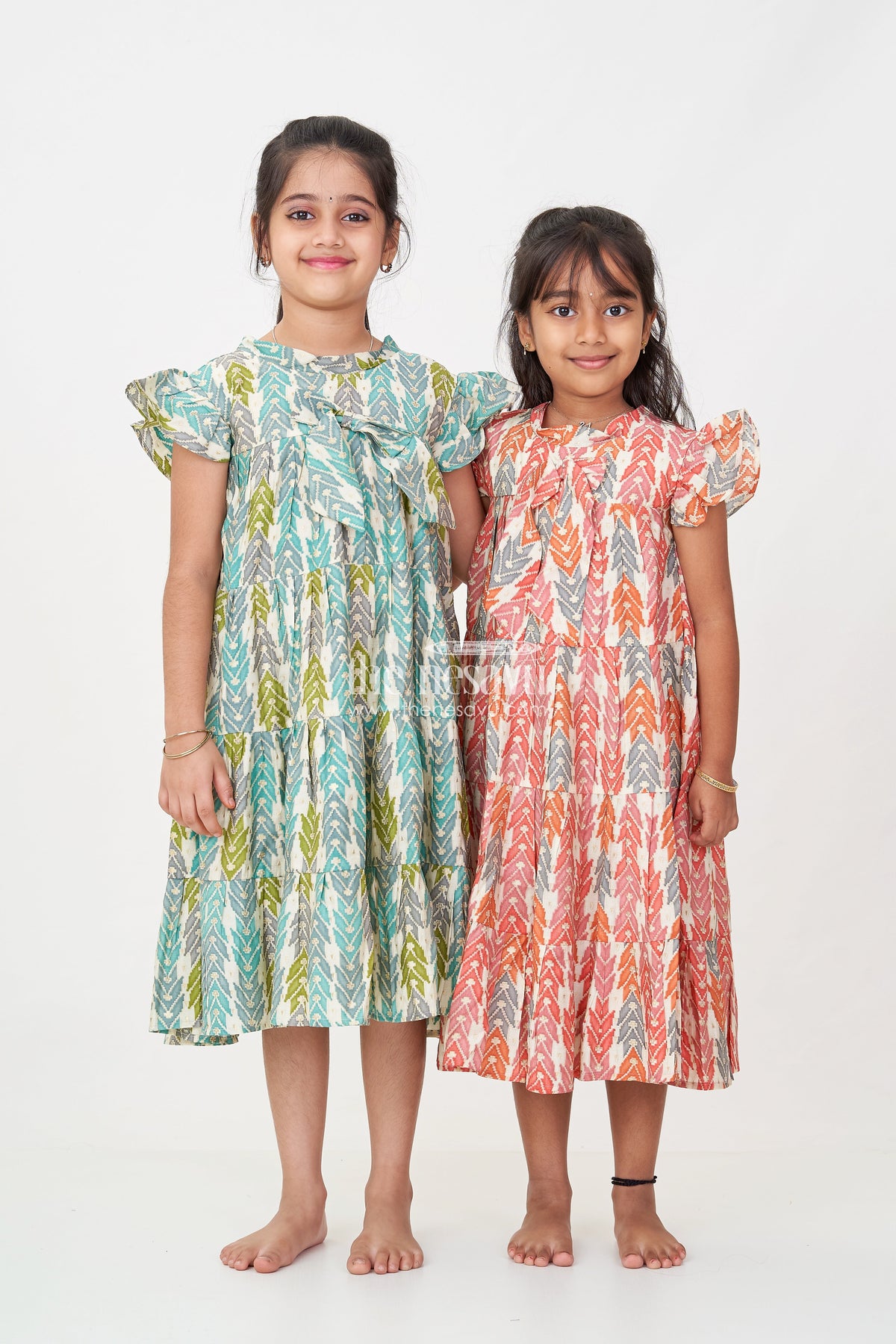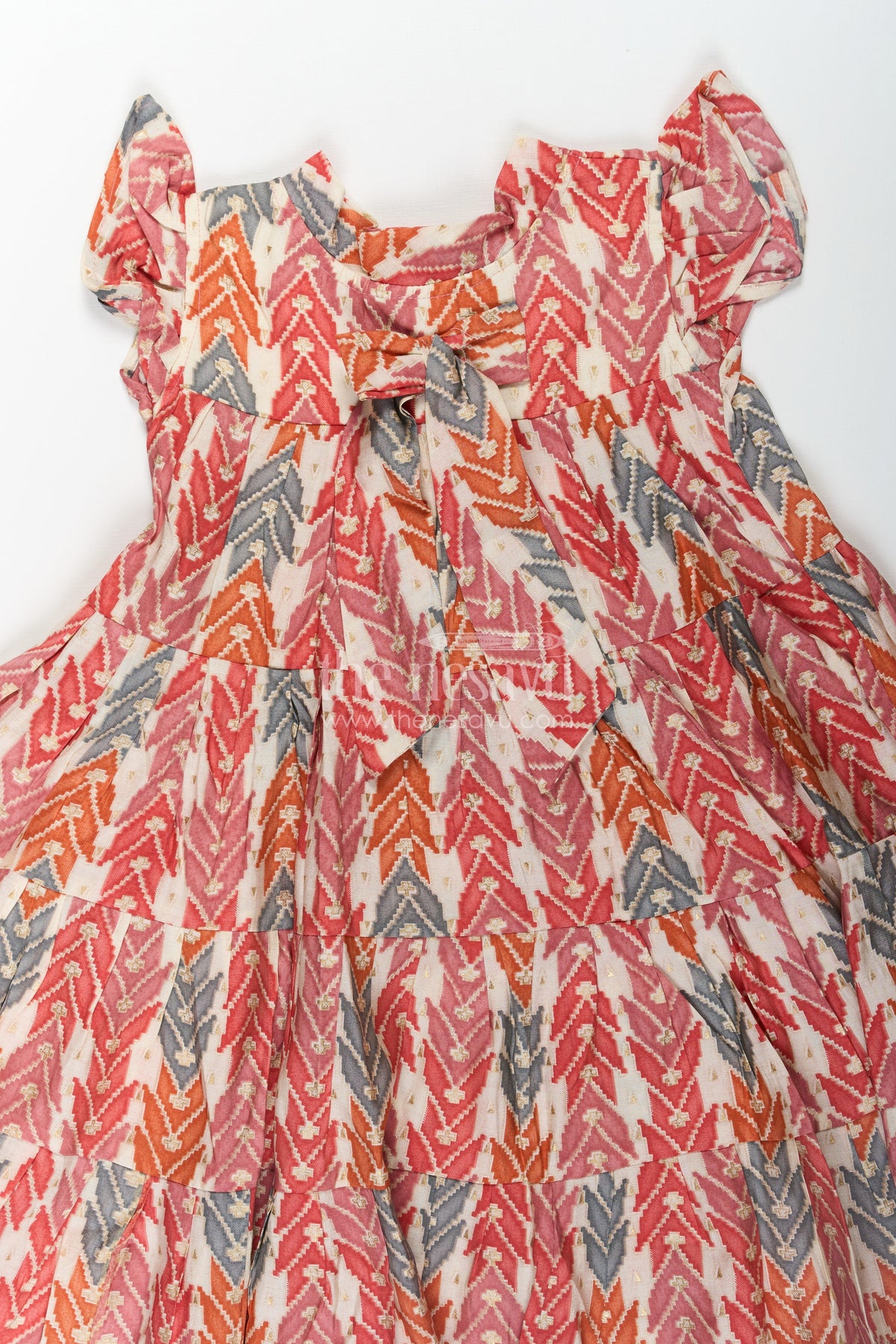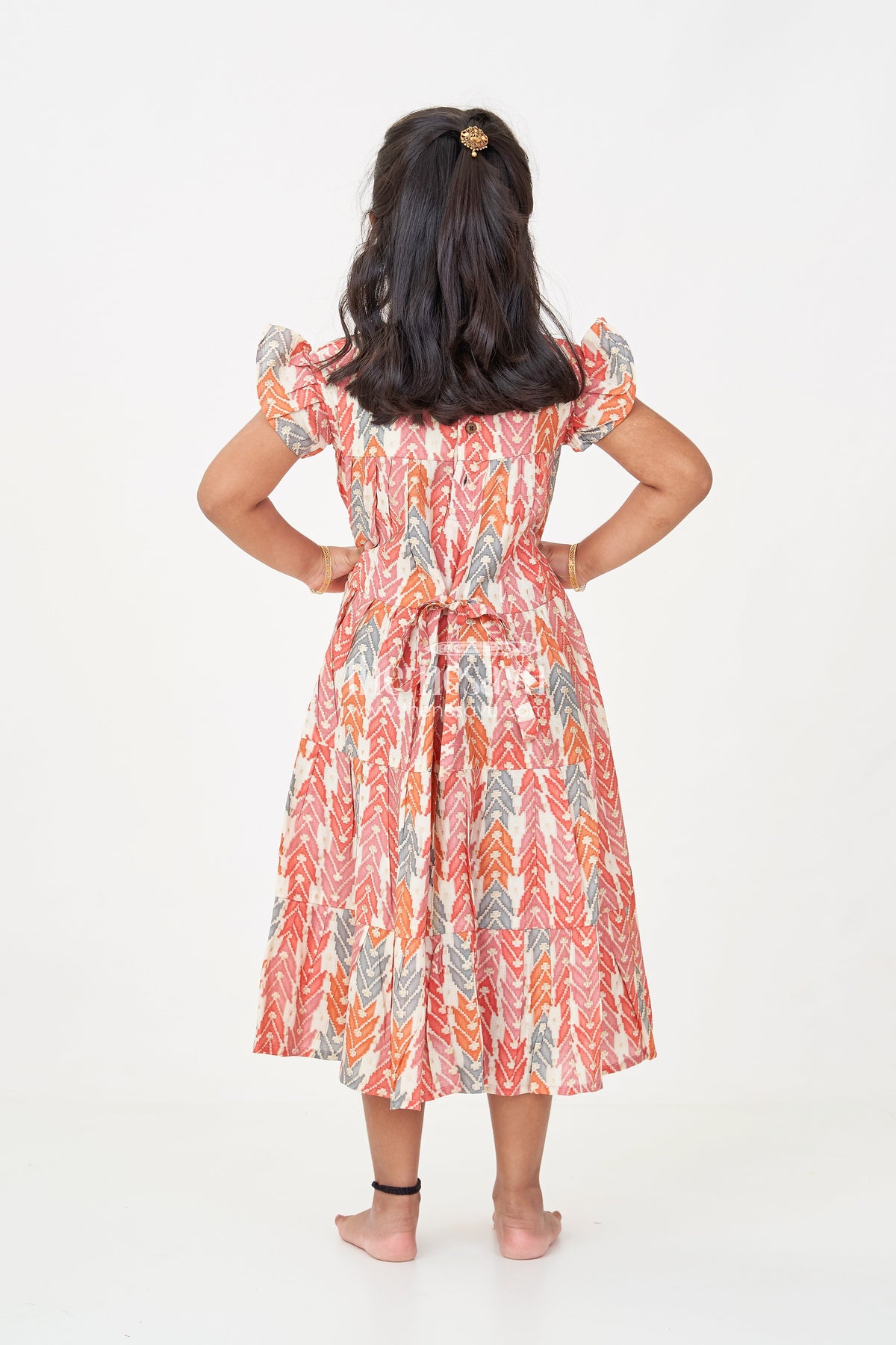 Bright and lively, this checks frock is perfect for adding bold energy to your child’s wardrobe. Crafted from breathable modal silk fabric, the dress features a multicolor geometric digital print in earthy tones of red, orange, and grey. The tiered layers and playful bow at the chest add a fun twist to its classic silhouette, while the flutter sleeves offer comfort and mobility. This frock is ideal for casual days, picnics, and playdates, making it a versatile must-have for any little fashionista.