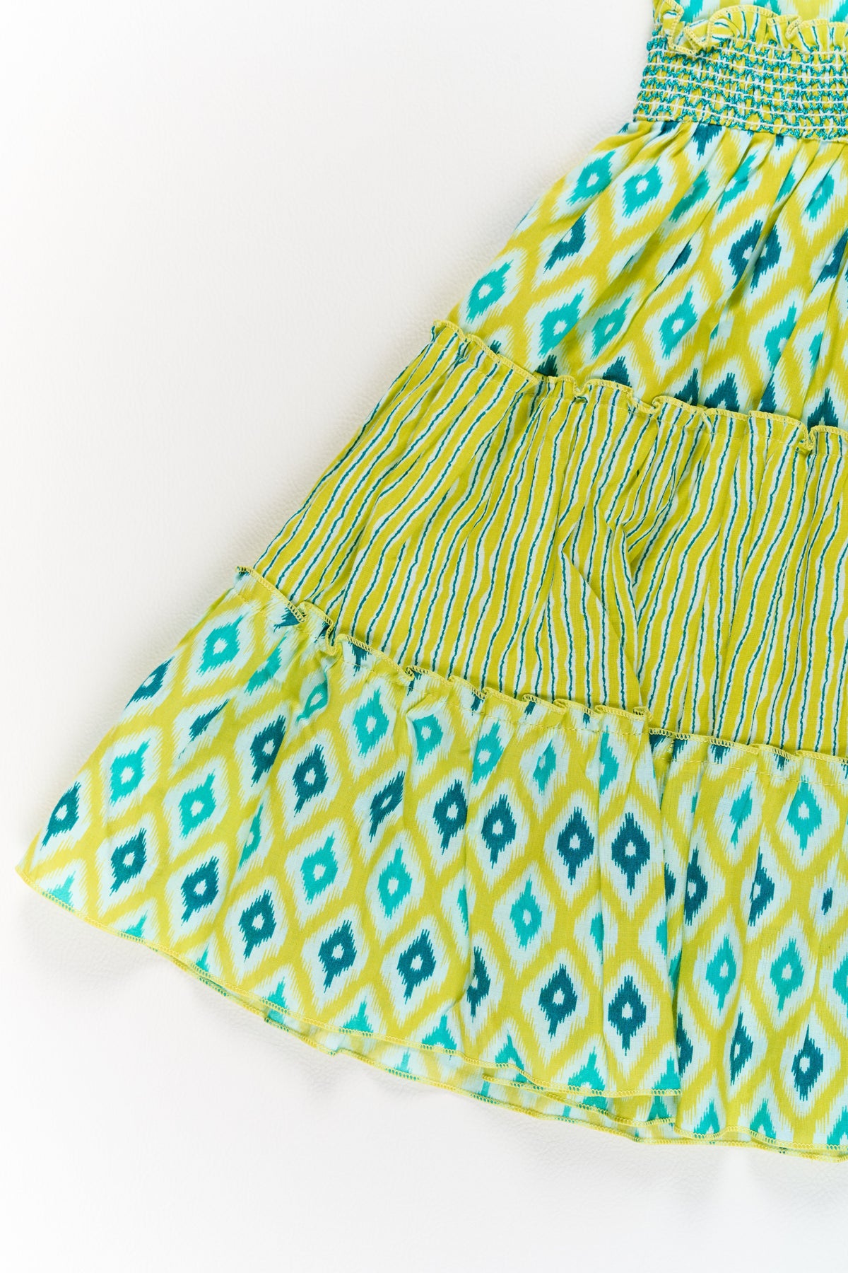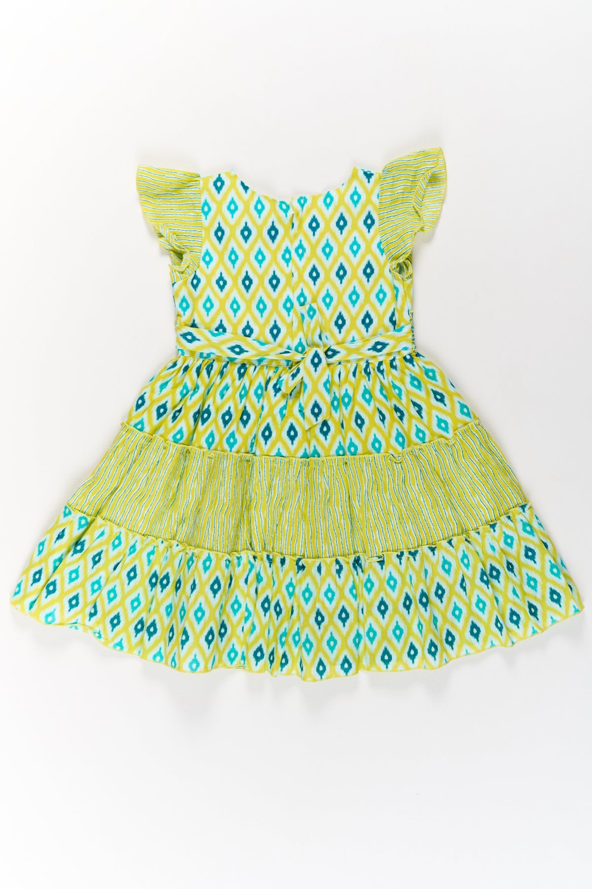 Brighten her day with this vibrant cotton dress for girls, designed with an eye-catching ikat print in yellow and green tones. Made from premium cotton, this frock features a smocked bodice for a snug yet flexible fit and playful ruffled cap sleeves for a stylish edge. The tiered skirt offers a delightful flow, perfect for twirling, while the breathable fabric keeps her comfortable throughout the day. Ideal for festive gatherings, family events, or summer outings, this dress brings together tradition and modernity in one charming package.