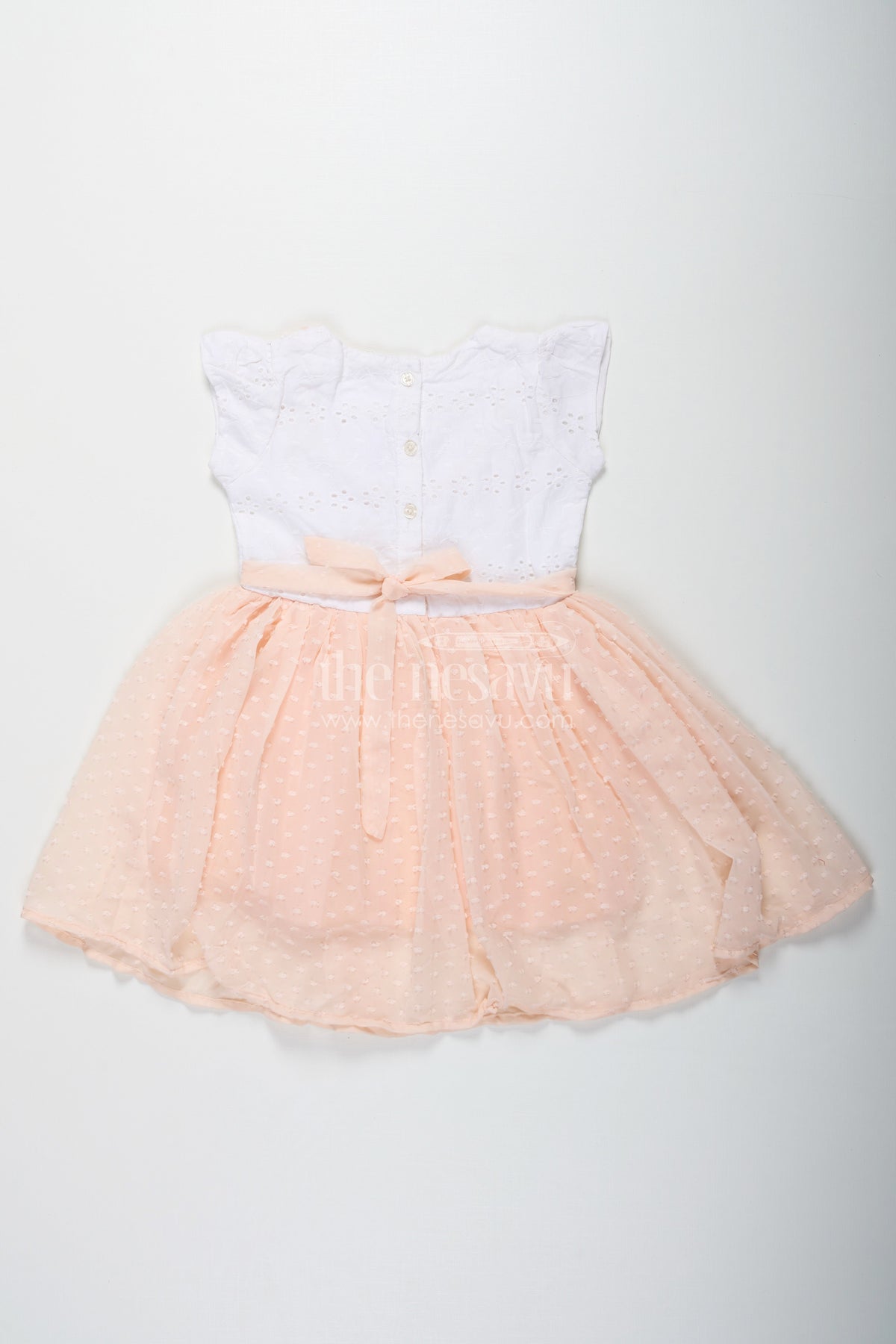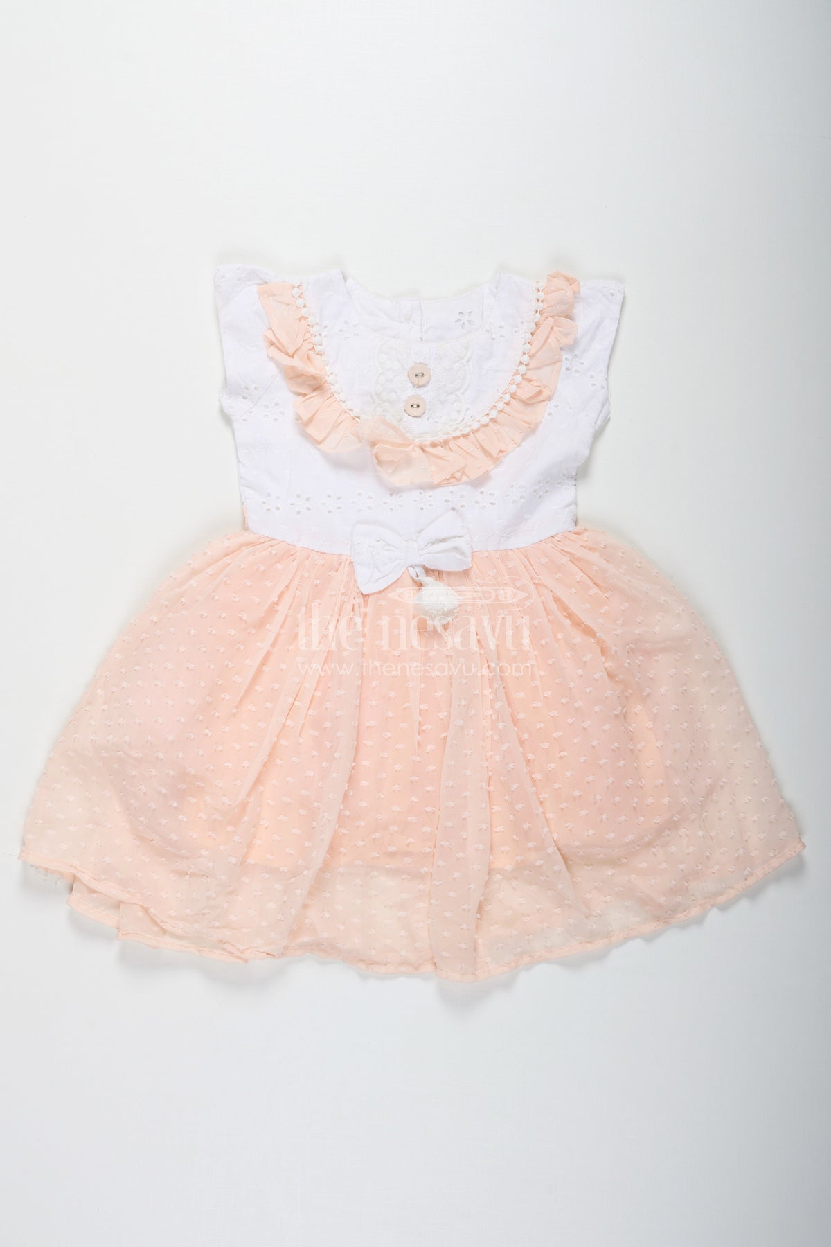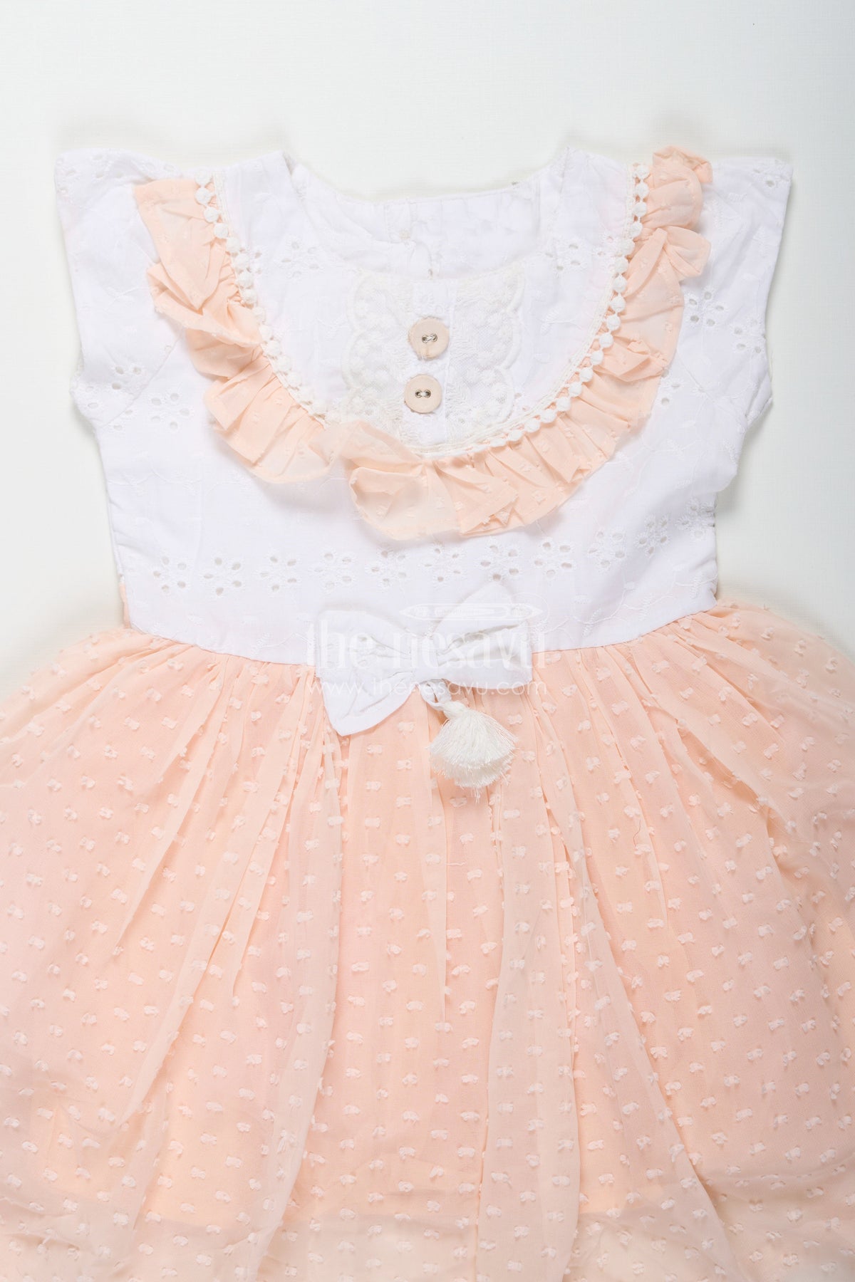 Frock suit for wedding is redefined in this peach-toned dress that combines elegance with softness for baby girls. The top features a white Hakoba lace-embroidered yoke adorned with delicate frills and buttons, while the bottom flares into a flowy georgette skirt with subtle polka detailing. A centered bow with tassels adds a sweet finishing touch. This dress is perfect for weddings, birthday parties, and formal events, offering both style and comfort. The lightweight fabric ensures ease of movement, making it ideal for active little ones who love to twirl.