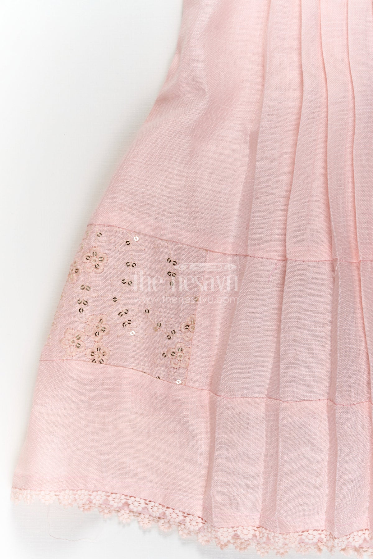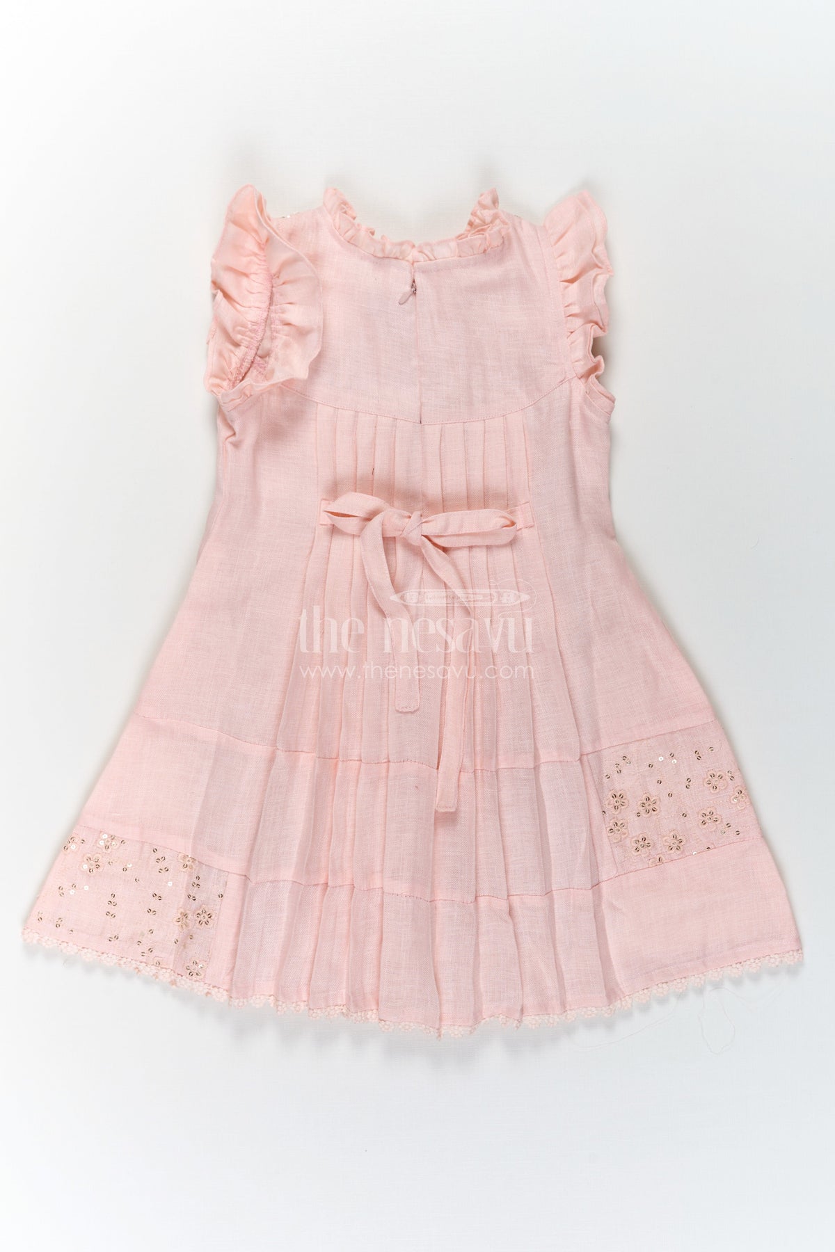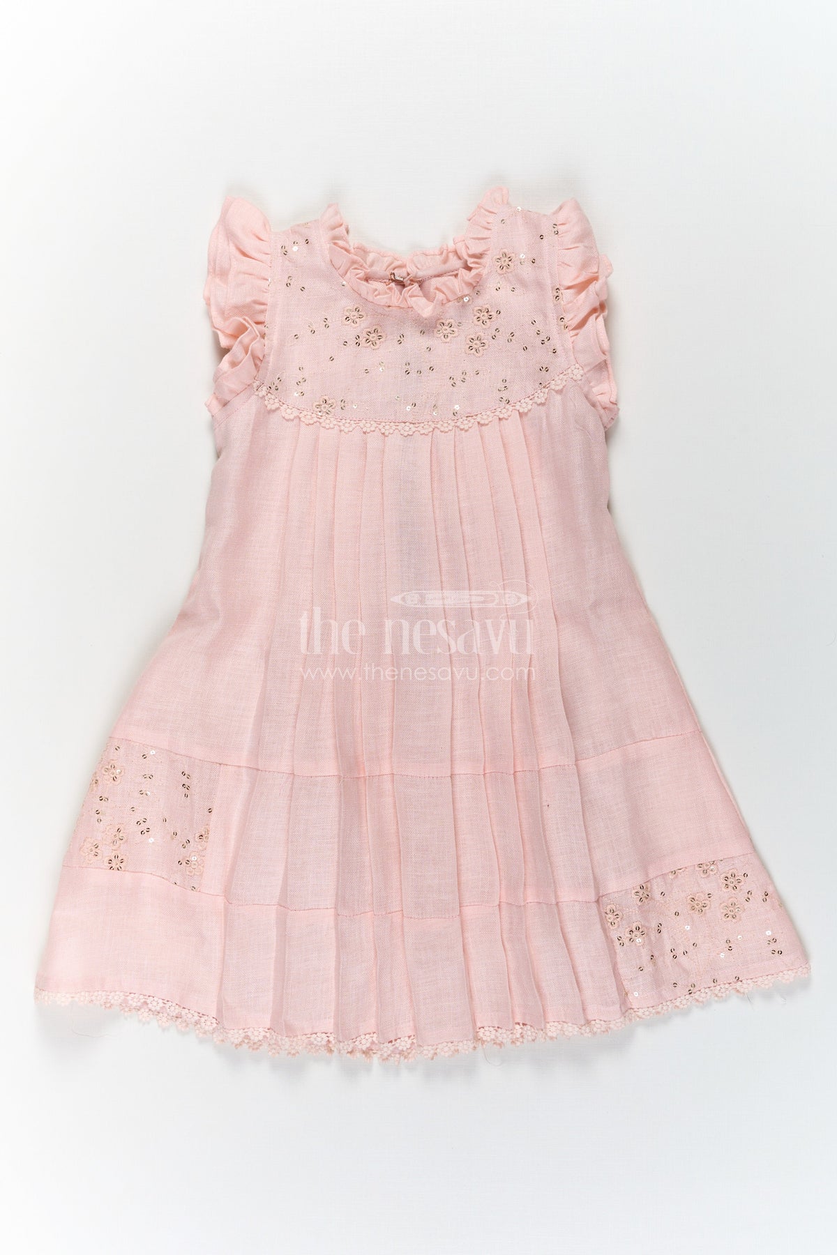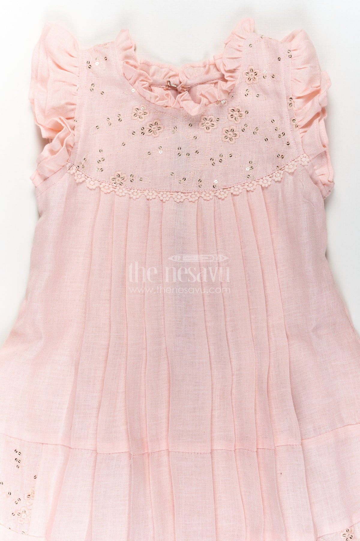 This adorable bacchon ki cotton frock is designed for elegance and ease. Made from soft flax cotton, the frock features a delicately embroidered yoke with floral motifs and subtle sequin highlights. The gentle peach tone and frill sleeves offer a charming and refined silhouette, while pleated detailing adds flow and grace. Perfect for casual festivities, school functions, or as a chic everyday option for little ones who love stylish comfort.