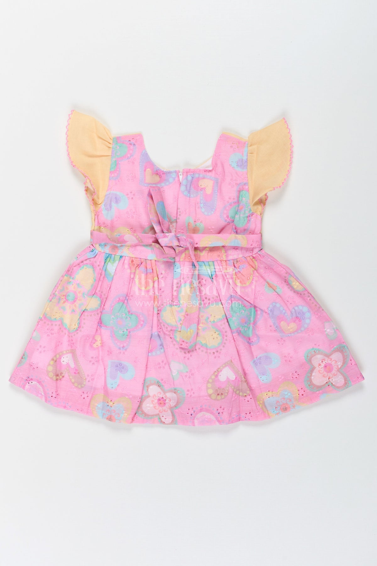 The belt frock is a cheerful, everyday outfit designed to bring a smile to your little one’s face. Crafted with a soft green cotton bodice and adorned with a colorful floral emoji applique, this frock features a charming pink skirt filled with whimsical heart and floral patterns enhanced by hakoba embroidery. The attached belt detail adds a polished touch while offering a flattering fit. The flutter sleeves with lace trim bring playful movement and style, perfect for active kids. Whether it’s for a casual outing or a fun gathering, this frock combines adorable details with breathable comfort that lasts all day.