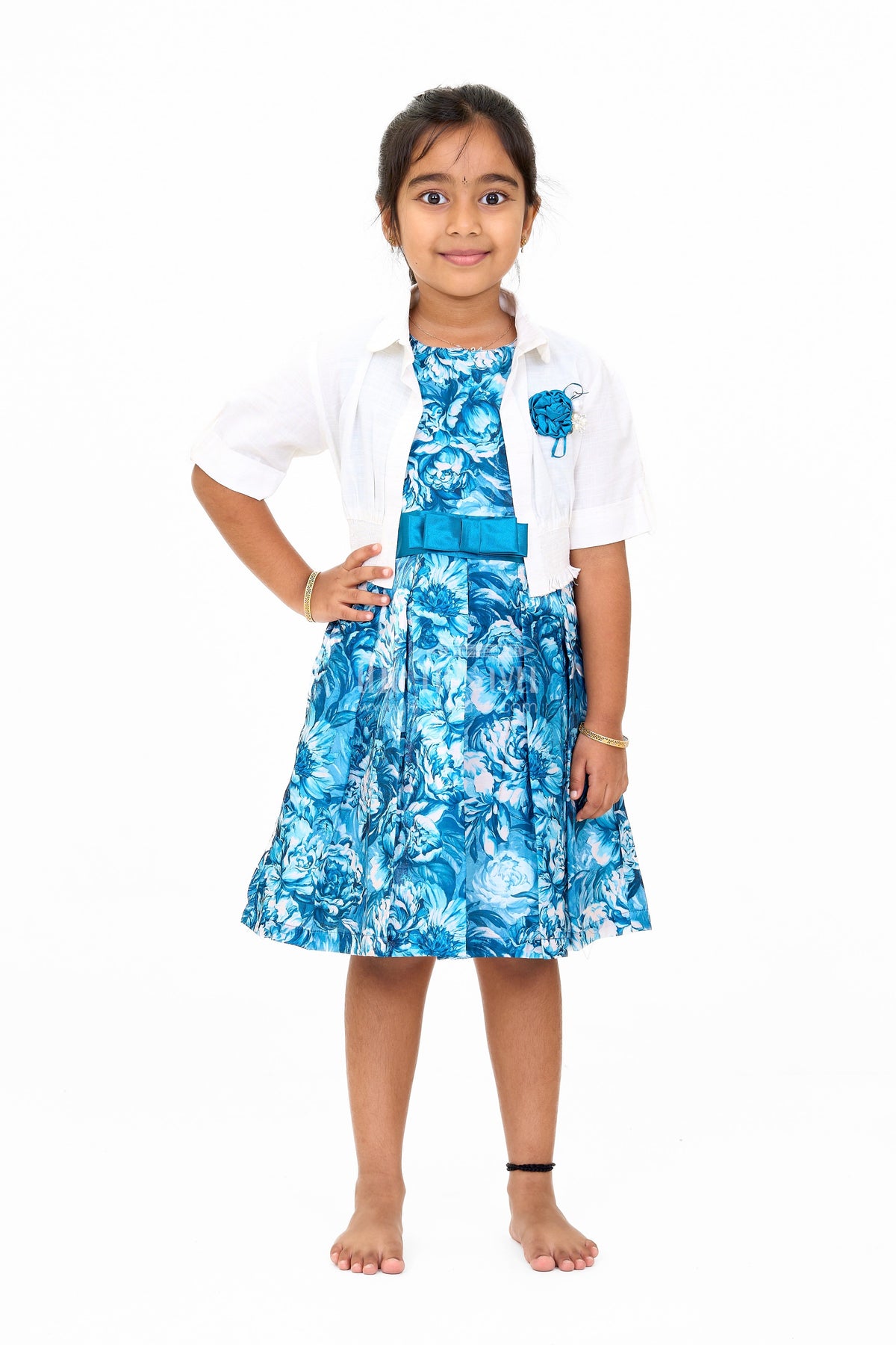 This girls chiffon Easter dress is an exquisite blend of elegance and charm, perfect for festive celebrations and special occasions. The dress features a vibrant blue floral satin skirt with a flowy silhouette, complemented by a fitted bodice and a satin waistband for a polished look. The accompanying cream cropped shrug, adorned with a rolled-up sleeve design and a floral brooch, adds a sophisticated touch to the outfit. The lightweight chiffon overlay ensures comfort and ease of movement, making this dress a perfect choice for Easter gatherings or birthday parties. Crafted with attention to detail, this dress promises to make your little one stand out in style.