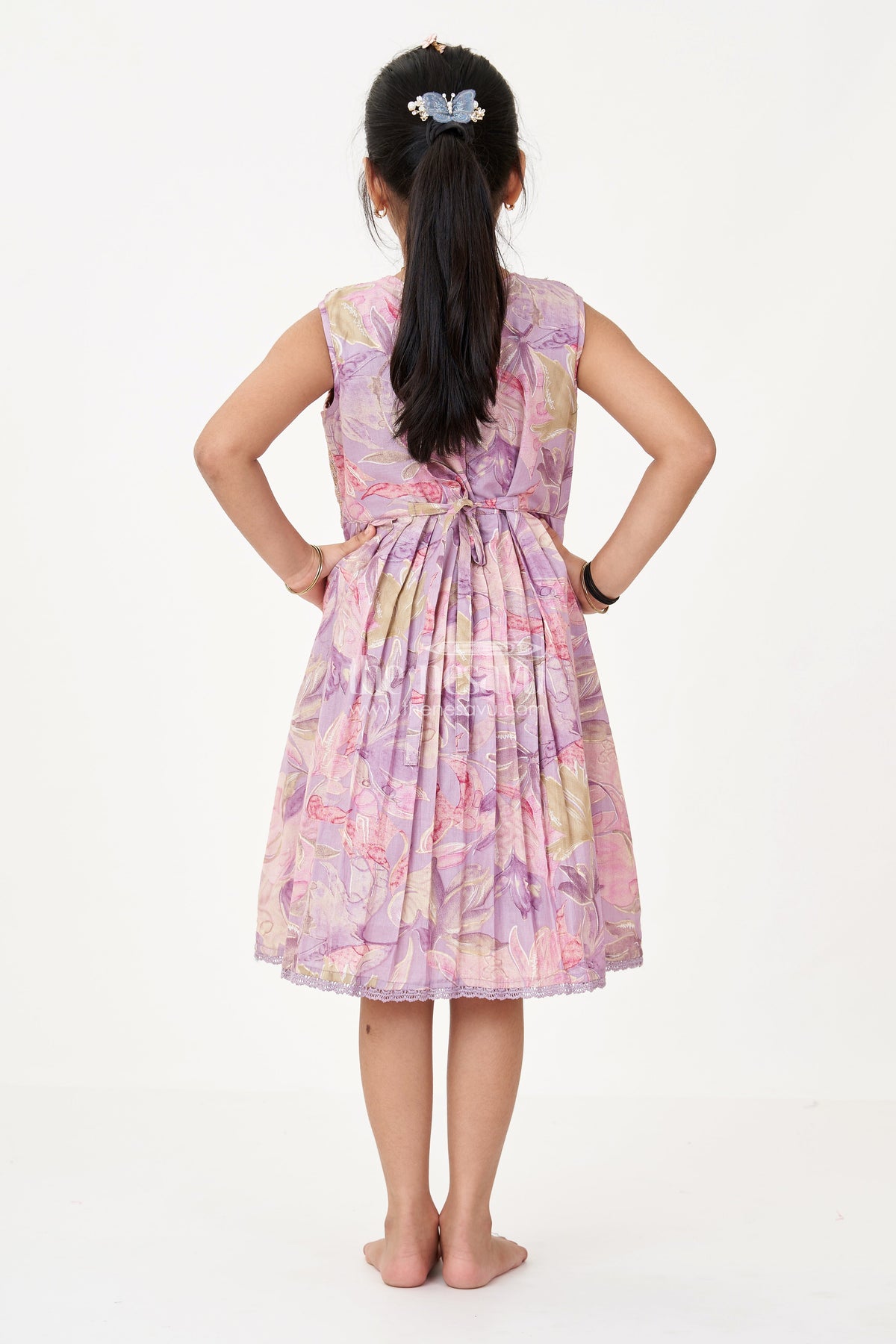 Brighten up your little girl’s wardrobe with this charming colour full frock, a perfect combination of elegance and modern style. The sequin-embroidered yoke adds a hint of sparkle, making it an ideal choice for parties and festive occasions. The pleated skirt features a floral print in soft hues, giving it a lively yet sophisticated appeal. The sleeveless design with a lace-up front provides a stylish touch while ensuring comfort. Made from breathable cotton, this frock is lightweight and airy, perfect for warm-weather outings. Whether it's a birthday celebration or a casual day out, this dress will keep your child looking stylish and feeling comfortable.