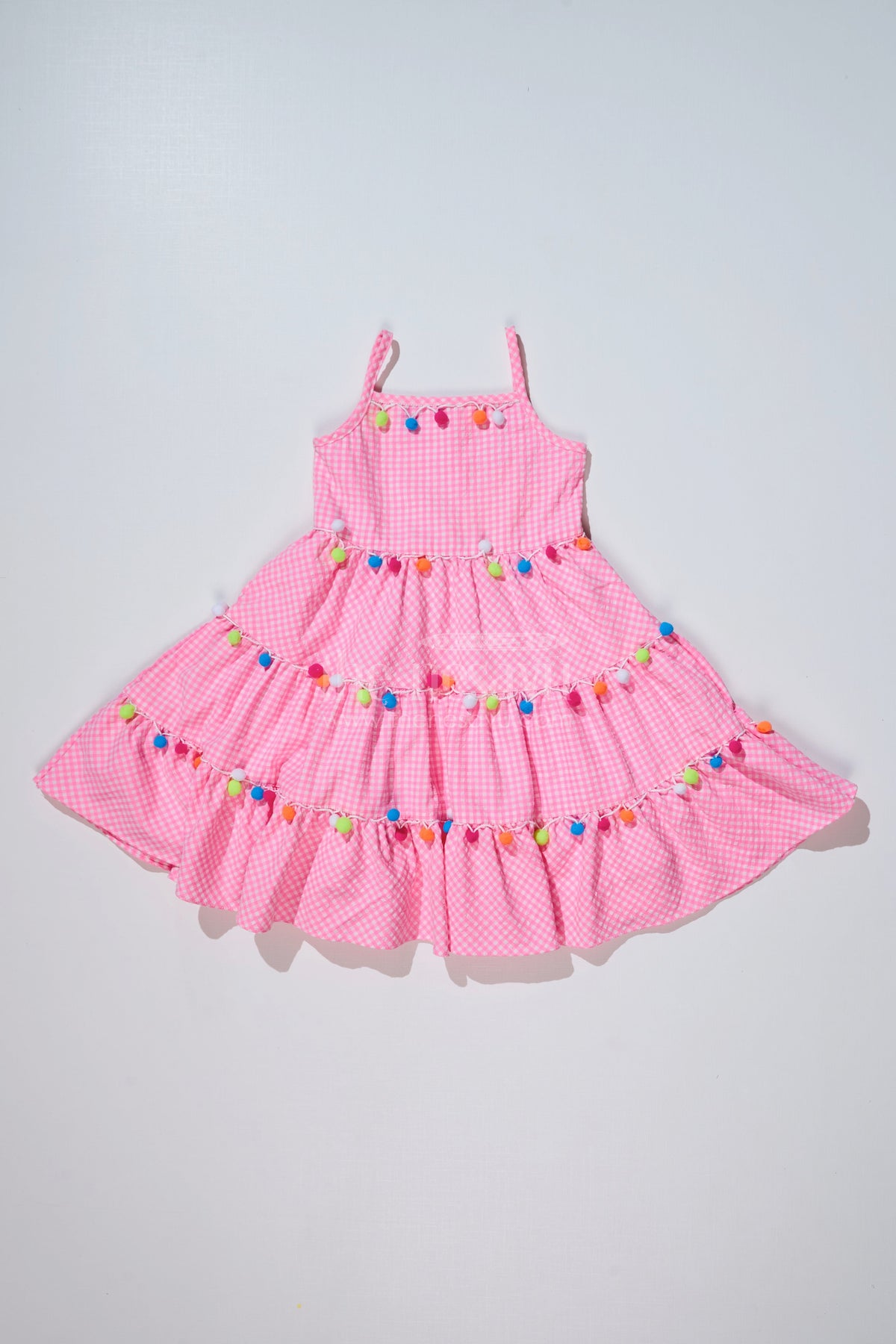 Upgrade your little girl’s wardrobe with this latest frock, designed to add fun and style to any occasion. Made from breathable cotton fabric, this sleeveless frock features a pink gingham print that brings a charming, classic appeal. The highlight of this dress is the colorful pom-pom embellishments that run along the tiered ruffles, adding a playful and festive touch. The lightweight cotton ensures comfort, making it ideal for everyday outings, picnics, and family events. Let your little one pair this dress with cute sandals or sneakers for a cheerful, casual look.