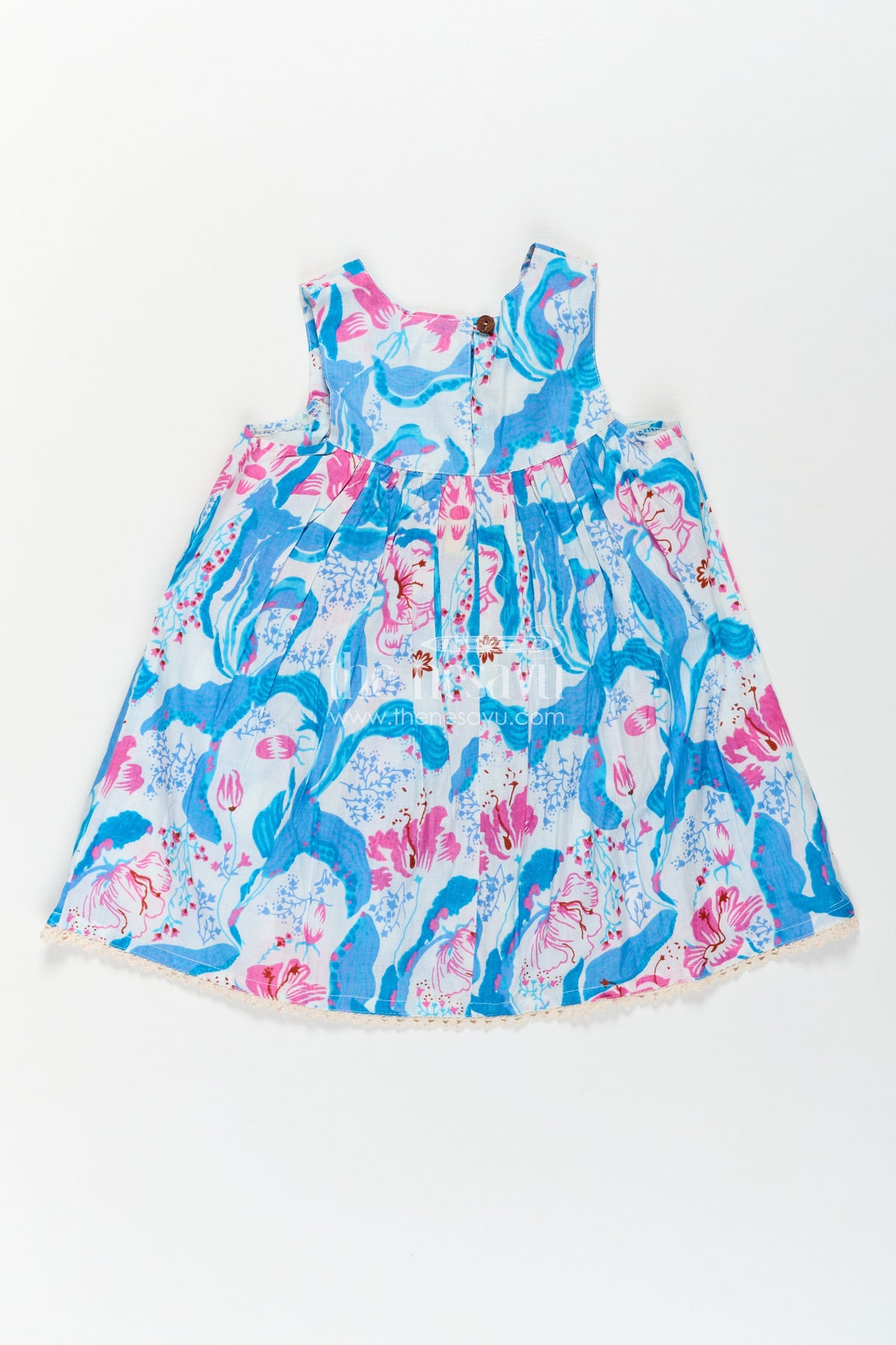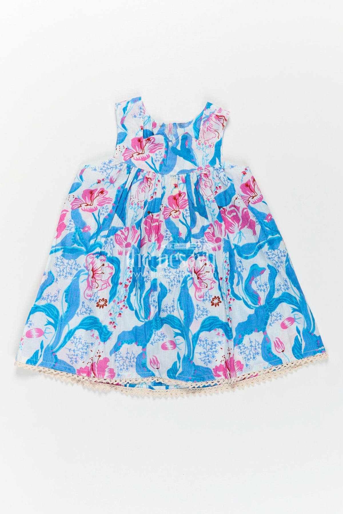 Simple design of frock gets a modern refresh with this lovely cotton piece featuring a soft floral print in blue and pink. The sleeveless cut and A-line structure give it a timeless appeal, while the floral digital print adds a lively pop of nature-inspired colors. Ideal for summer days and relaxed settings, this frock offers breathable comfort and effortless wear. Lace trim at the hem lends a delicate finish, and the pleated waist enhances the silhouette. Whether at home or out and about, this frock is a go-to for understated style with a touch of color.