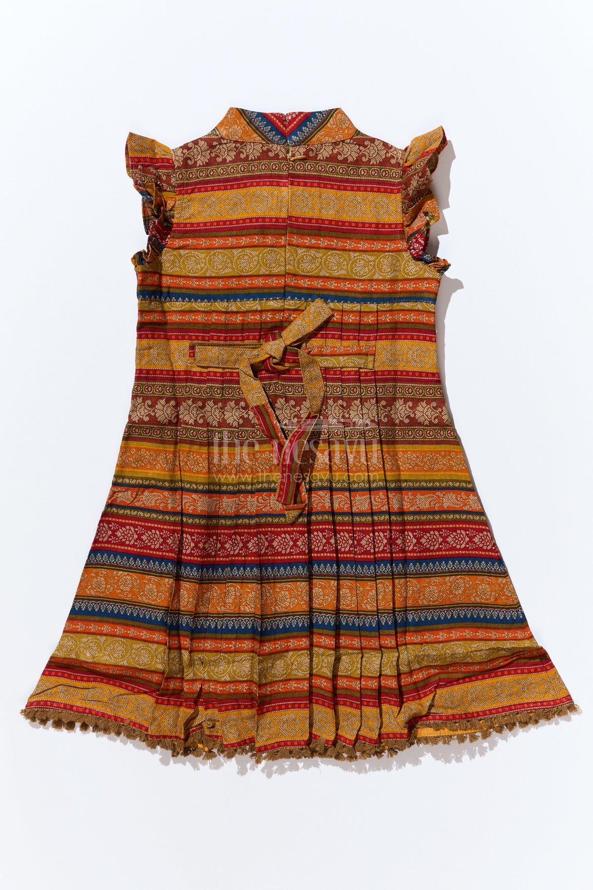 Add charm to your little one’s wardrobe with this cute cotton frock, featuring a vibrant ethnic print on soft rayon fabric. Designed for both comfort and style, this frock comes with delicate ruffle sleeves and a classic tie-up bow at the neckline, adding a vintage touch. The pleated flared skirt enhances movement, making it a great choice for casual outings, cultural events, or festive occasions. Lightweight and breathable, this frock ensures all-day comfort, making it a must-have for playful and stylish looks.