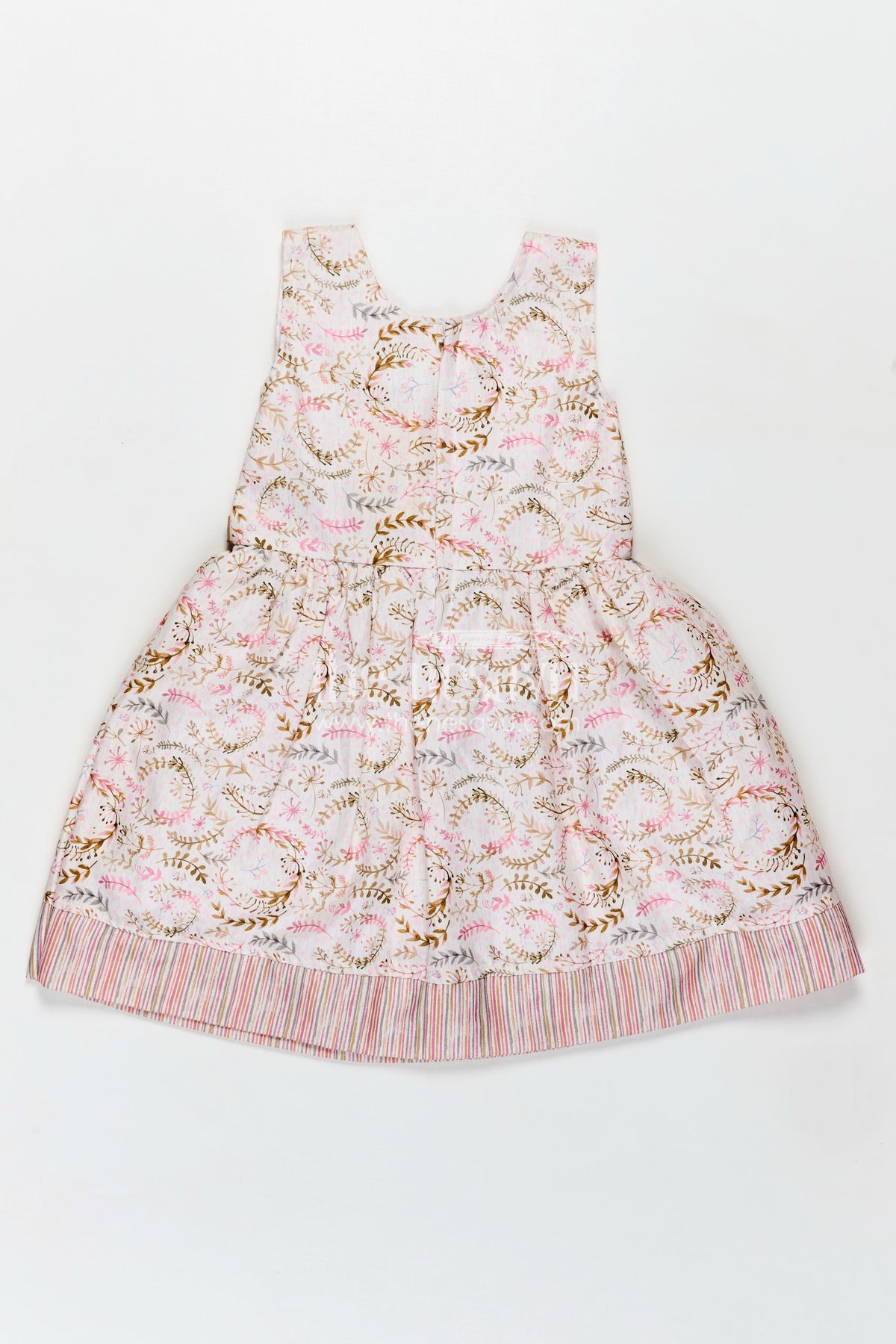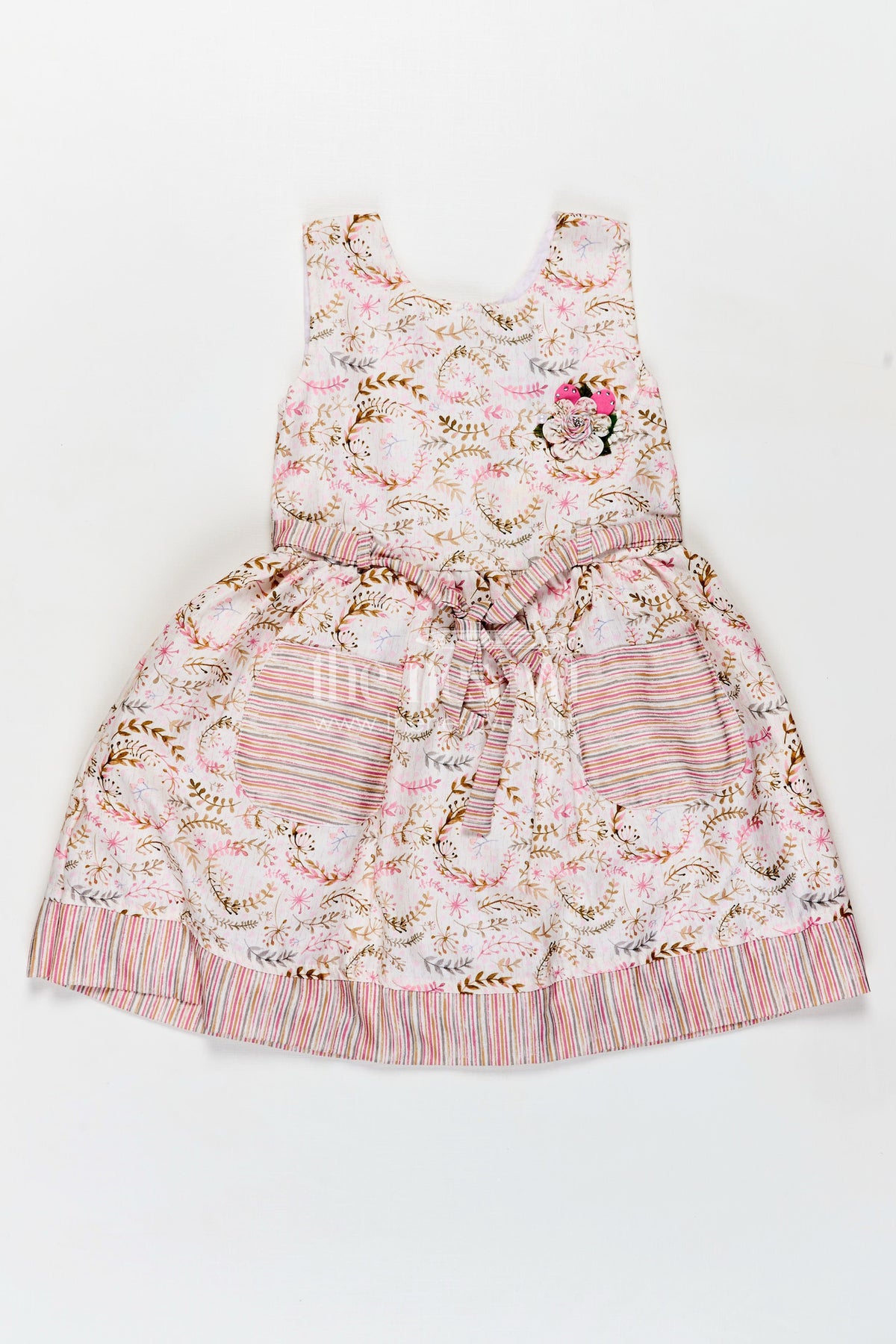 Girls Frock Belt Design in Flax Cotton with Pink Floral Digital Print and Striped Patch Pockets