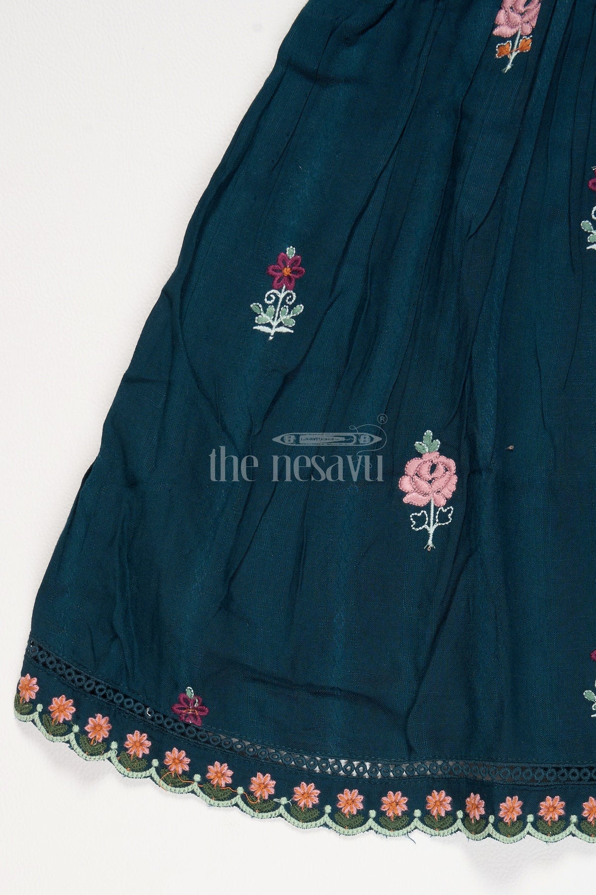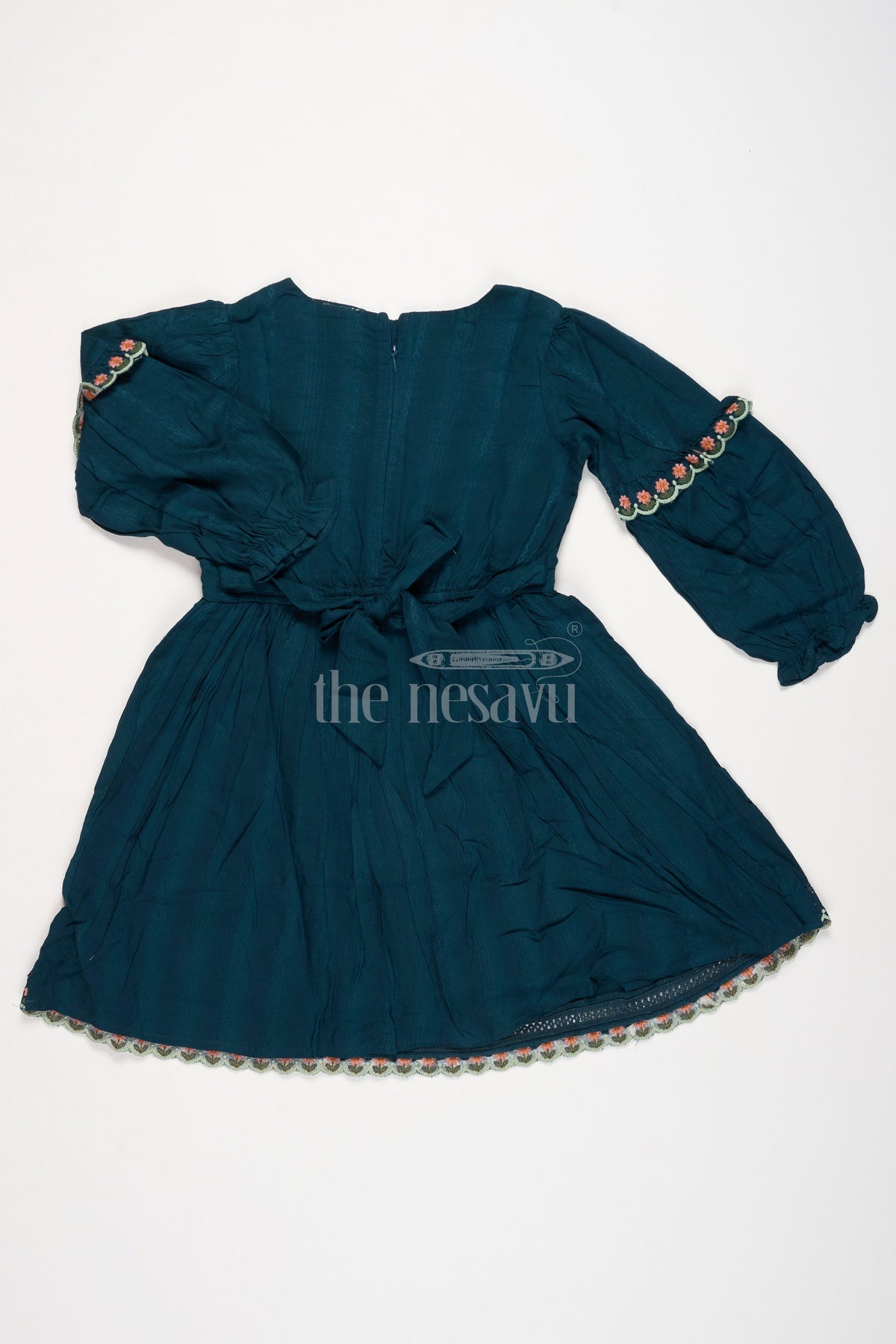 frock fancy design is elevated with intricate thread embroidery and classic charm in this girls green cotton frock. Designed with puff sleeves and a smocked bodice, the dress boasts detailed floral embroidery that stands out against the rich green base. The gathered skirt flows gently, offering both elegance and ease of movement, ideal for special gatherings or photo-worthy events. The comfortable cotton fabric makes it breathable for extended wear, while the scalloped hem adds a refined finishing touch. Whether paired with sandals or festive footwear, this frock brings sophistication to your little one’s style.