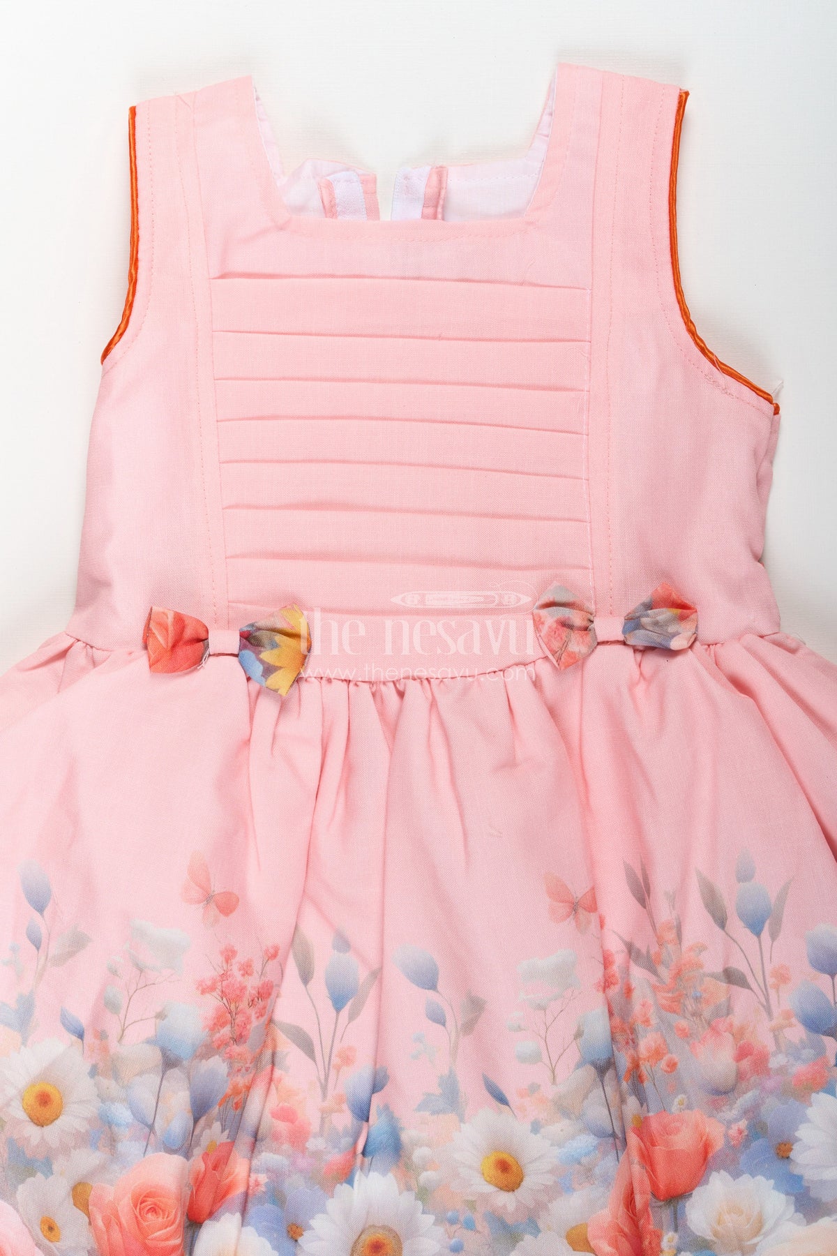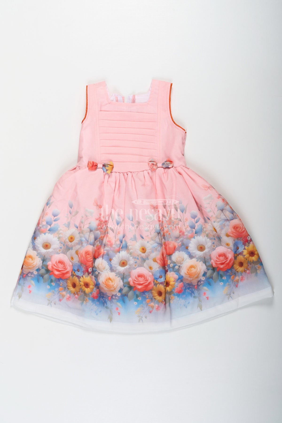 This light pink frock is a charming and stylish outfit designed for comfort and elegance. Made from a soft cotton blend, this sleeveless dress features a pleated bodice with a fitted waistline, ensuring a flattering silhouette. The floral digital print at the hem adds a touch of grace and vibrancy, making it a standout piece. The cute bow details at the waist enhance its playful appeal, while the flared skirt allows for easy movement, making it ideal for special occasions, casual outings, or festive celebrations.