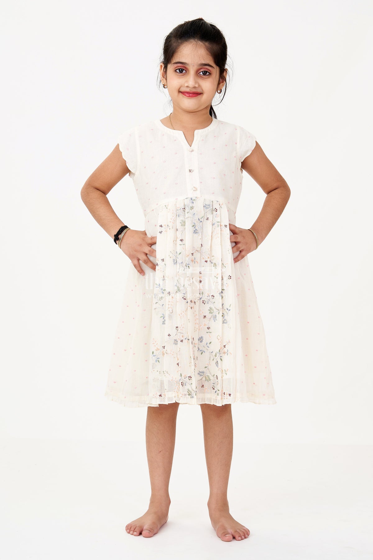 Designed for effortless style and comfort, this frock modern is a beautiful cream-toned piece made from a breathable cotton blend fabric. The frock features delicate sequin thread embroidery along the center and subtle dot patterns throughout the fabric. Its sleeveless silhouette and pleated bottom hem add a playful yet graceful flow, making it perfect for casual wear, day parties, or relaxed festive moments. The soft pastel tones, detailed front panel, and layered hem create a refined, modern look for stylish little girls.