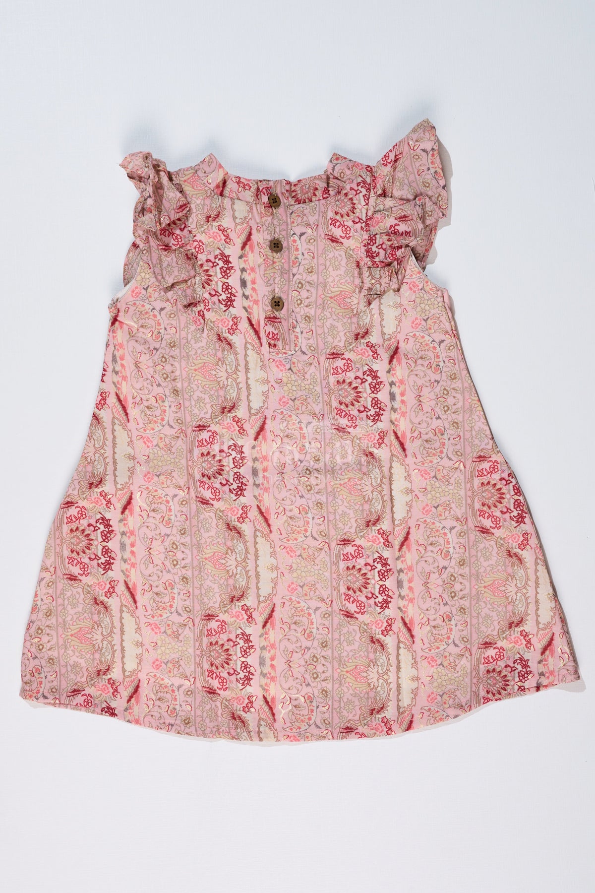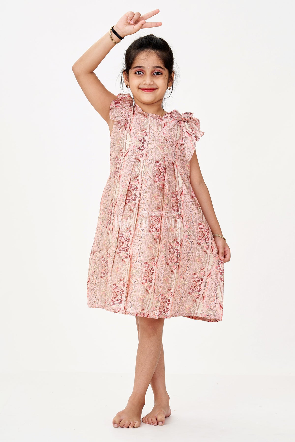 This readymade frock is designed for effortless style and comfort. Made from muslin silk printed fabric, it showcases a beautiful light pink and beige floral print, creating a graceful and trendy look. The pleated skirt gives it a structured yet flowy appearance, while the shoulder bow adds a touch of elegance. Whether for birthday parties, casual gatherings, or festive occasions, this dress is an easy-to-wear and stylish option for your little girl.