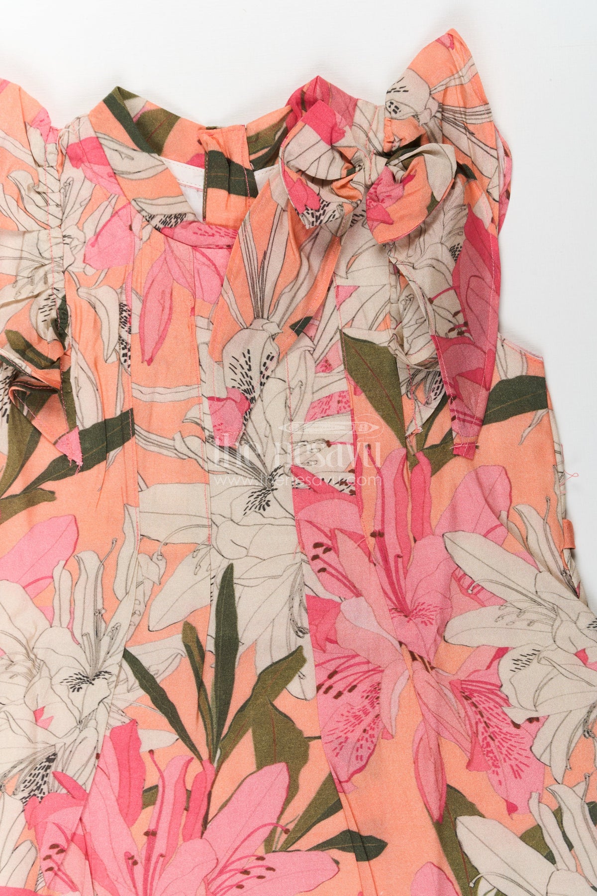 Let your little one's imagination take flight in this delightful fairy frock, designed for girls who love to twirl in style. Made from premium Viscose Silk Digital Print, this dress showcases an enchanting blend of soft peach, green, and pink floral patterns that feel both magical and elegant. The ruffled shoulder details and oversized neckline bow add a whimsical flair, while the lightweight silk blend ensures breathable comfort all day long. Whether she's spinning around the living room or stepping out for a casual day, this frock brings both beauty and functionality. Designed with pleats for a flowing fit and a convenient back zip closure, this frock is a charming blend of dreamy design and everyday practicality.