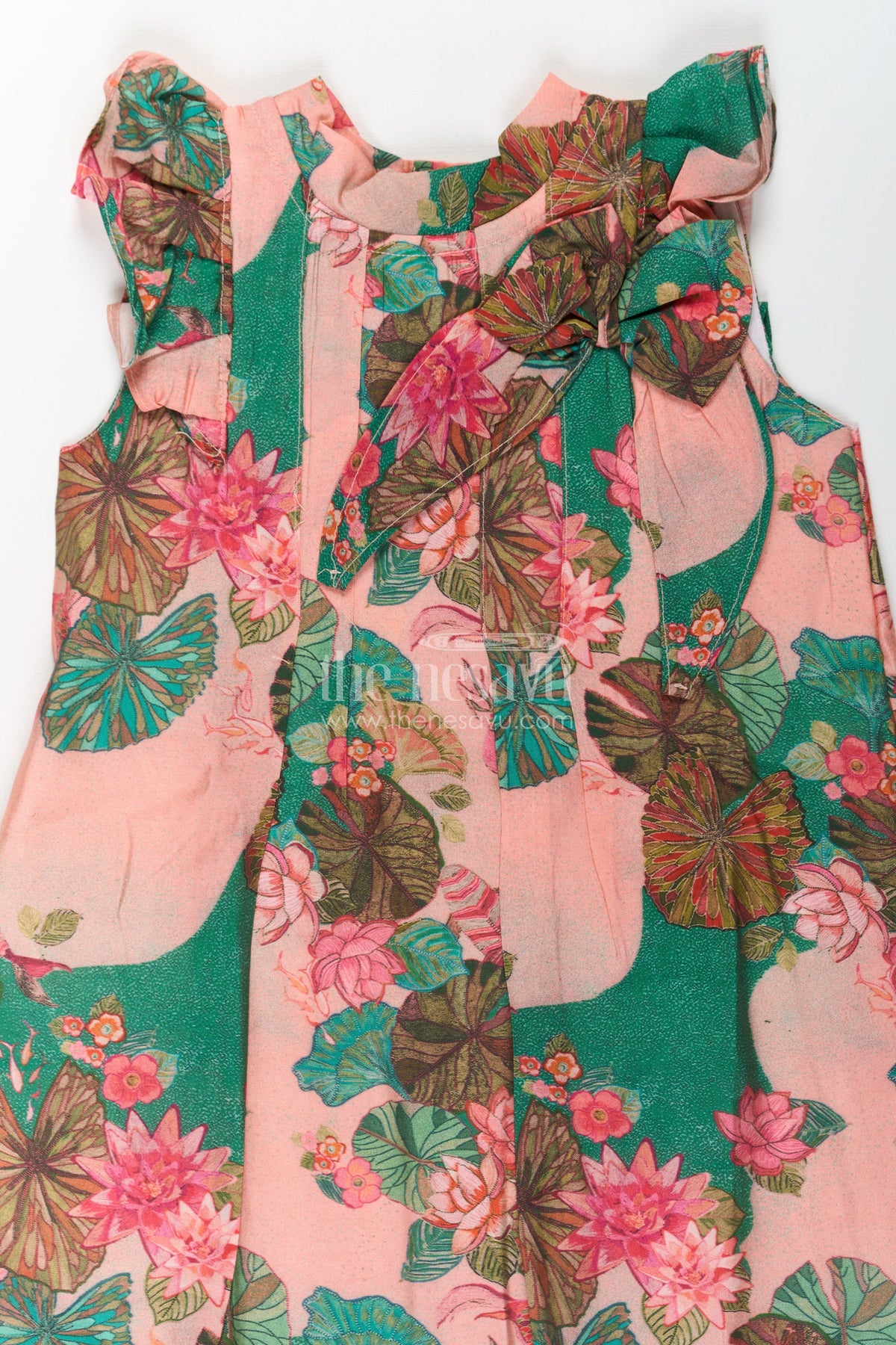 Celebrate the charm of nature with this frock floral piece, exquisitely crafted in Viscose Silk Digital Print for a soft and polished feel. With vibrant shades of green and pink, the lotus and leaf motifs give this dress a unique garden-inspired look that’s sure to stand out. Designed for young girls who love both color and comfort, the sleeveless silhouette with frilled shoulders and a statement bow at the neckline adds both character and cuteness. Lightweight and breathable, it’s perfect for sunny days, weekend outings, or casual gatherings. Its gentle pleating provides freedom of movement, while the back zip makes dressing up effortless. A true blend of function and floral flair.