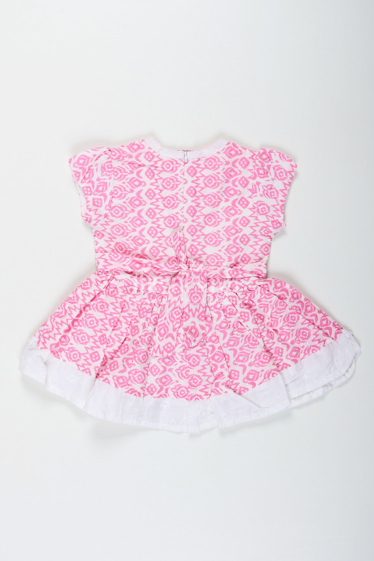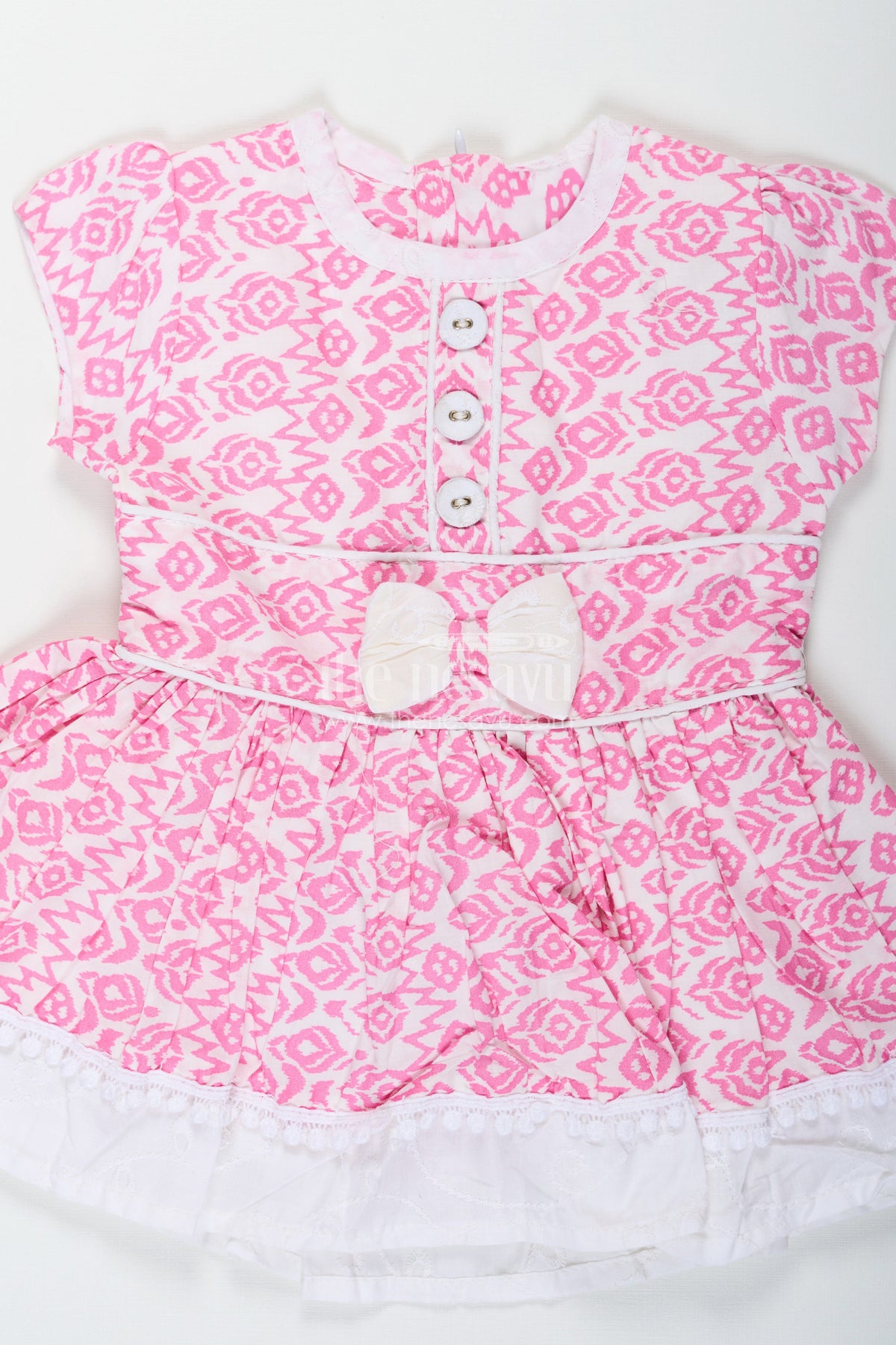 Light pink frock suit combines cute patterns and practicality in this adorable everyday dress for young girls. Crafted from breathable rayon, the dress features a vibrant pink and white digital print, a buttoned front placket, and a bow at the waist. The flared skirt is trimmed with white embroidered lace and pom-pom edging, adding a fun and festive finish. Complete with a matching hairband, this set offers a stylish look for casual wear, playdates, or mini celebrations while ensuring maximum comfort throughout the day.