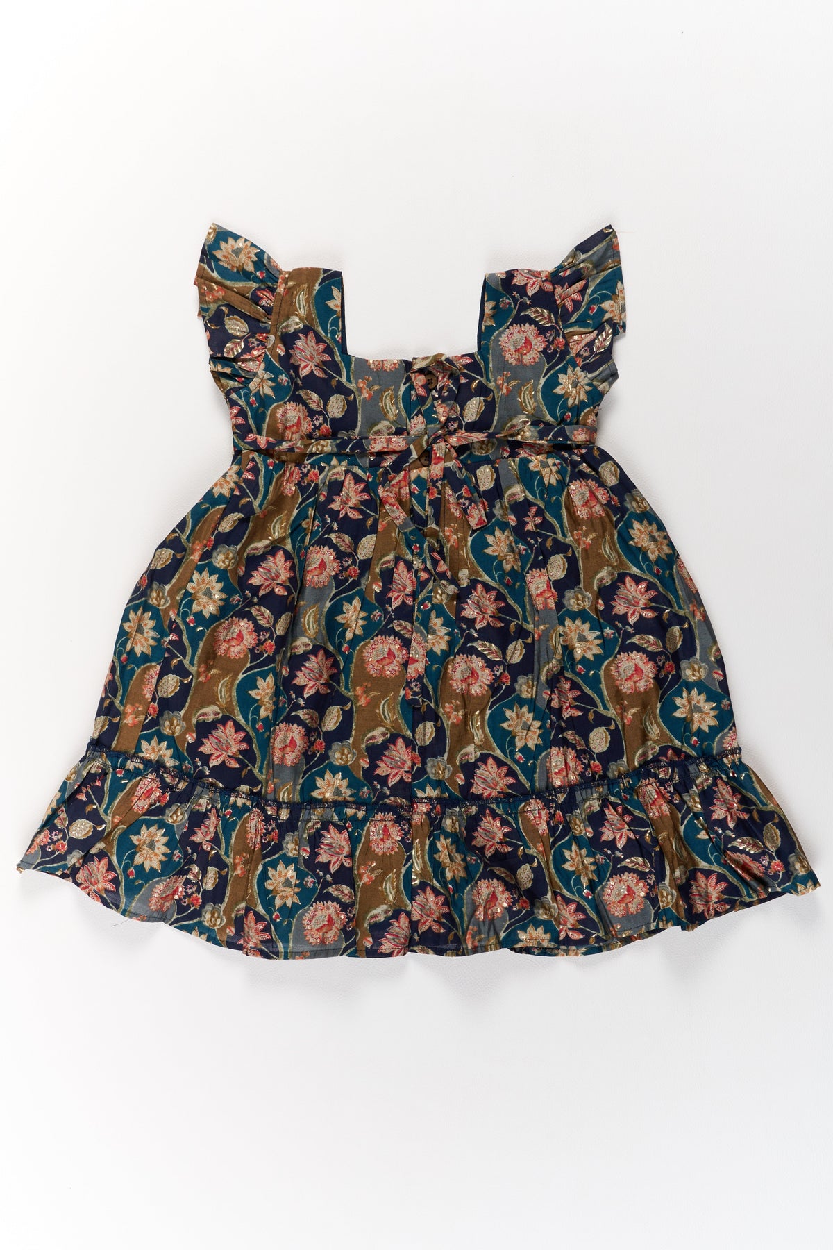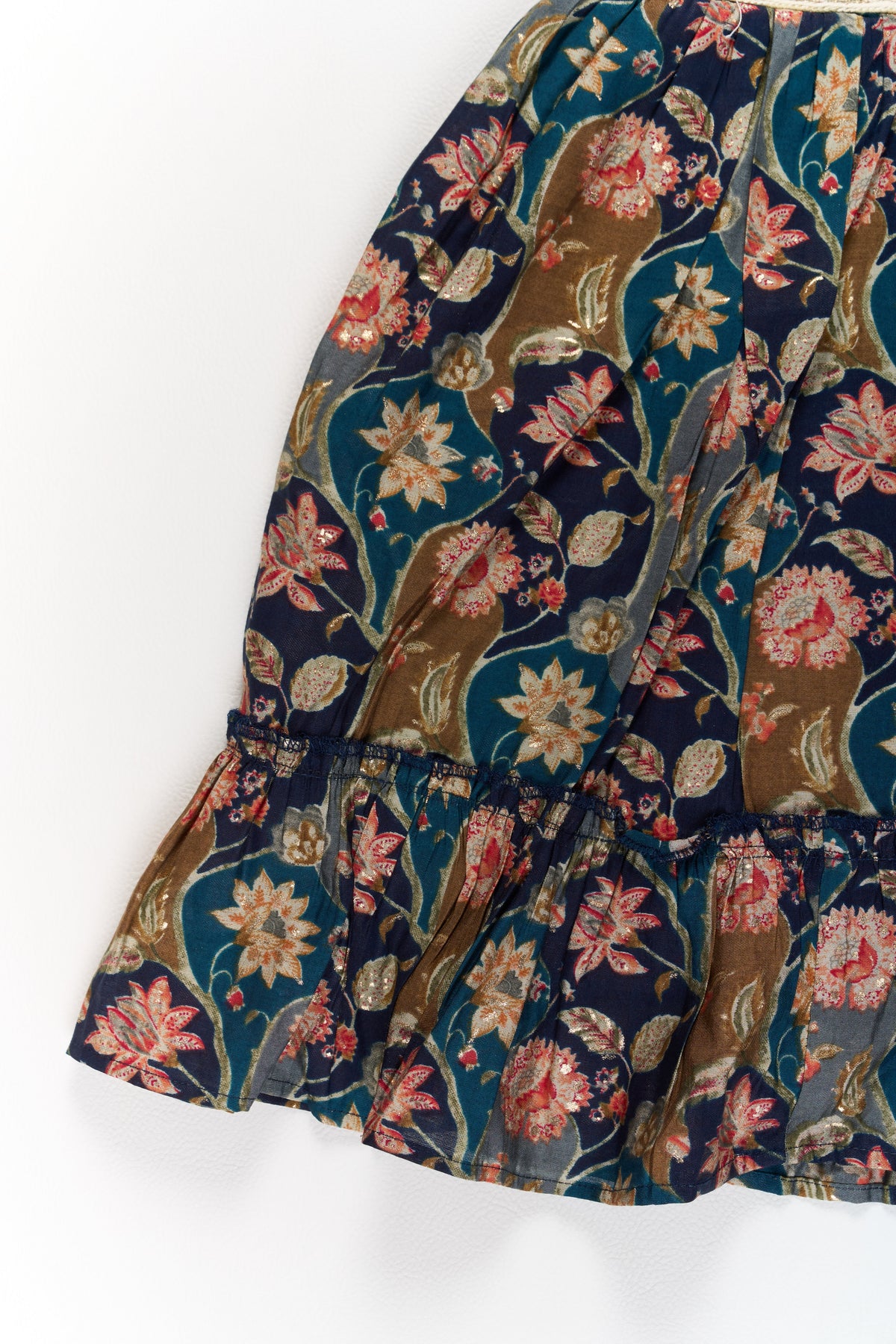 This long party wear gown for girls in a sophisticated black floral print is designed to make your little one stand out on any special occasion. The flutter sleeves and lace detailing at the waist add a graceful charm, while the ruffled hem enhances its elegant silhouette. Made from a comfortable cotton blend fabric, this gown offers breathability and ease of movement, making it perfect for birthday parties, festive celebrations, or weddings. Pair it with matching accessories for a complete stylish look.