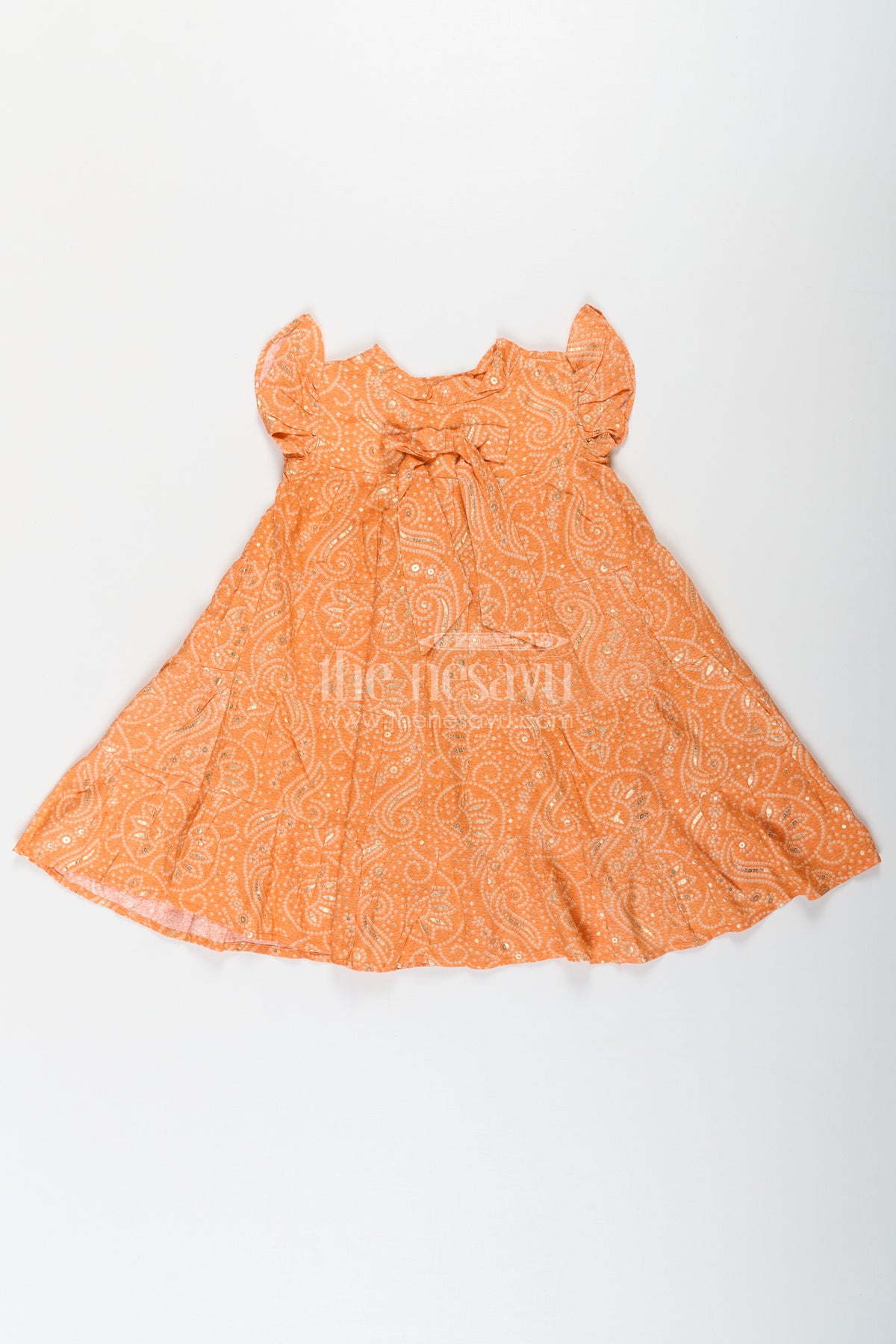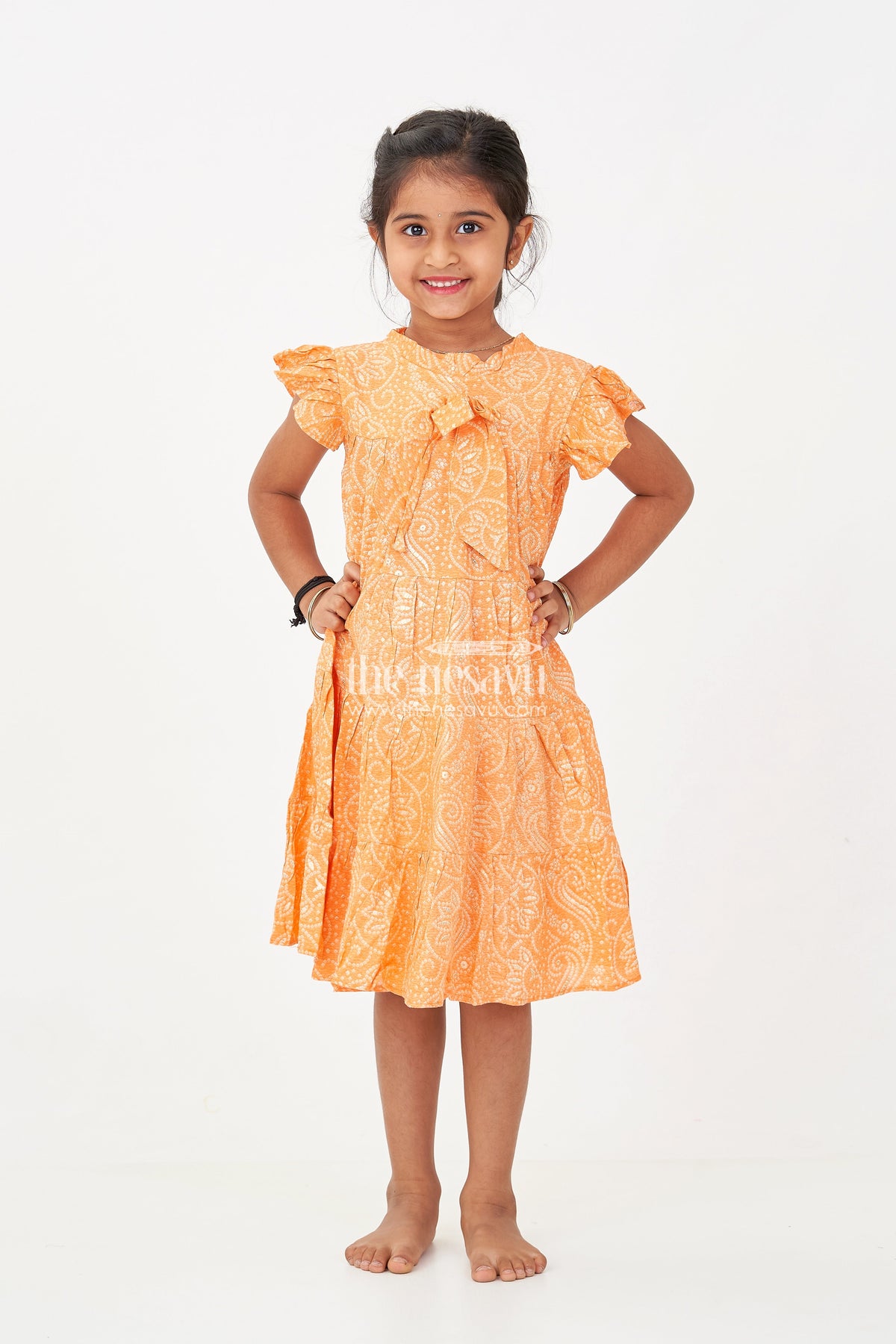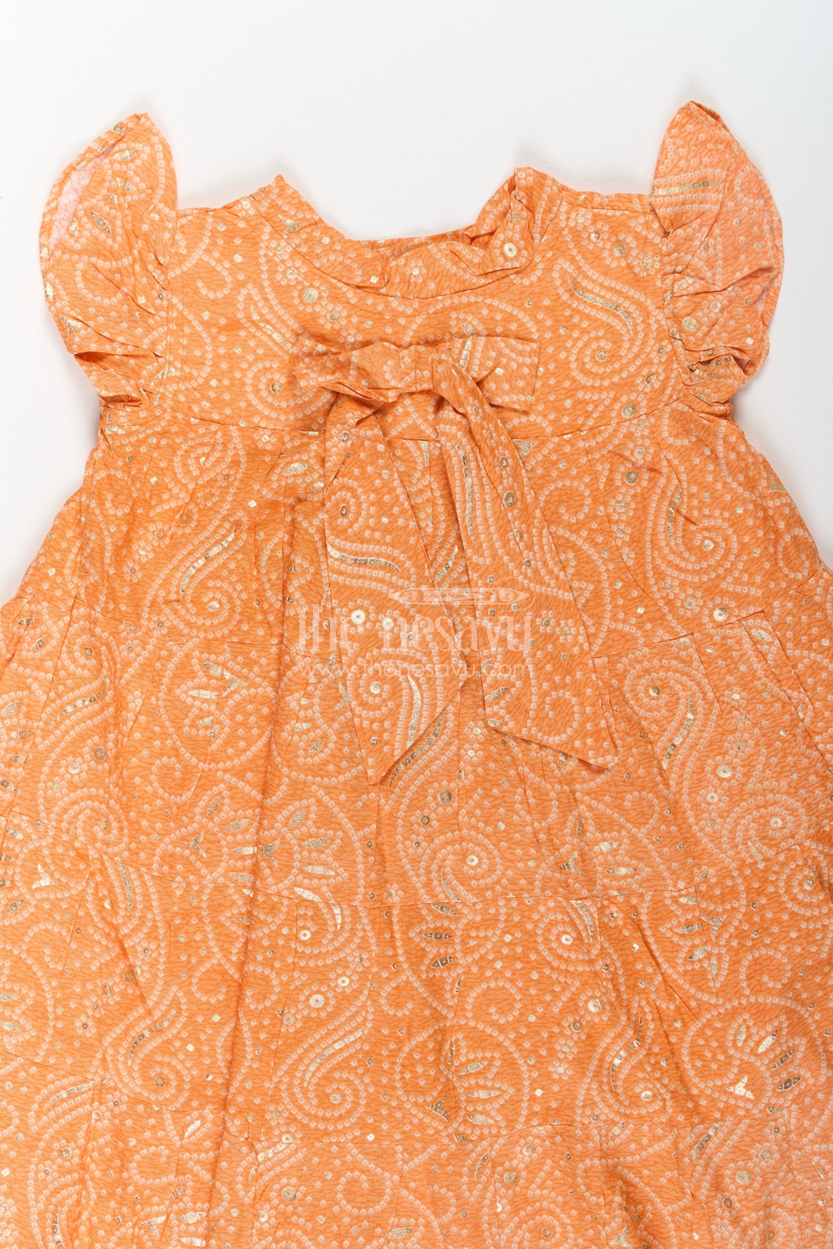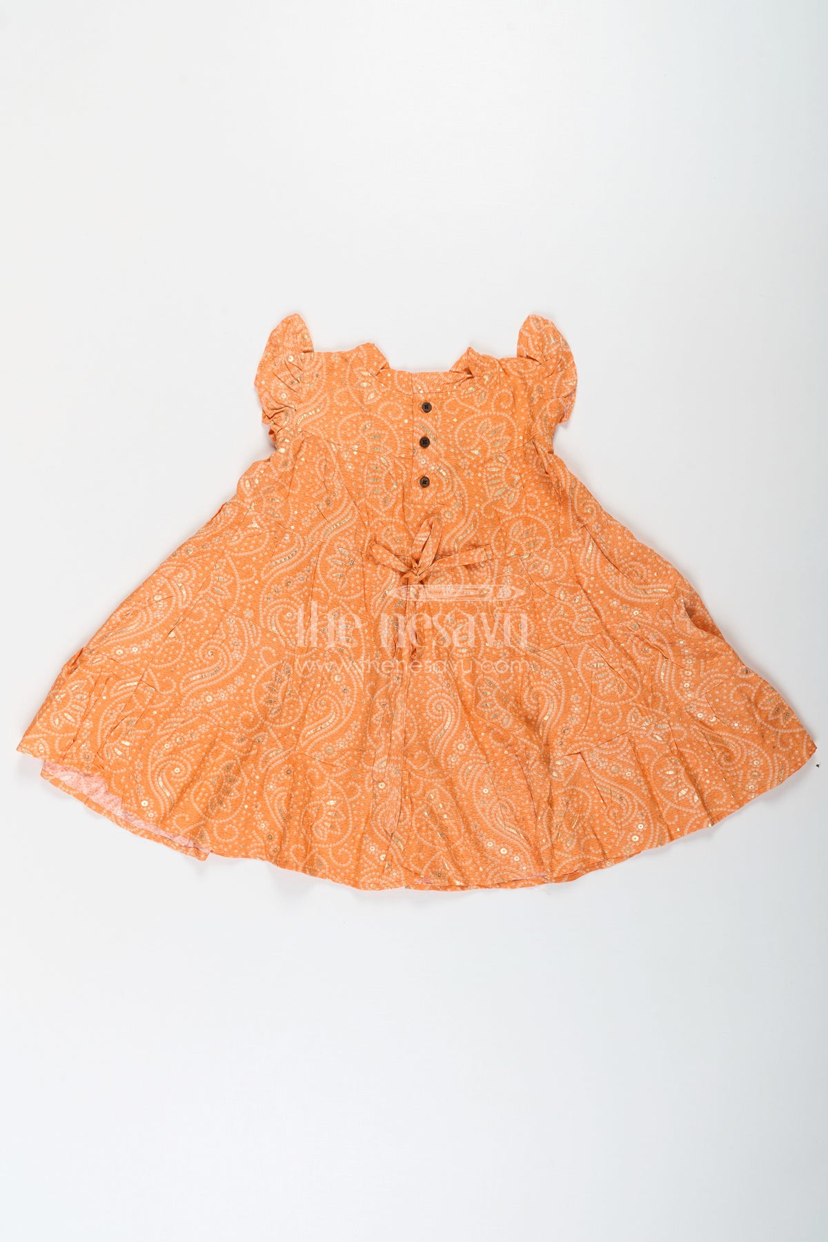 Bright, breezy, and full of charm, this Casual Cotton Frocks for Girls piece brings together traditional bandhani motifs with a fresh orange hue. The soft rayon fabric is gentle on the skin, making it ideal for everyday play or festive family functions. Gold foil detailing adds a subtle sparkle, while the tiered structure and ruffled sleeves bring movement and a playful edge. A neat bow at the chest completes the adorable look.