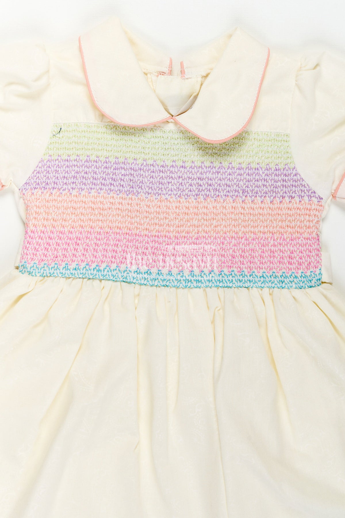 Girls Short Frock White Colour with Smocked Rainbow Yoke and Peter Pan Collar in Soft Cotton Blend
