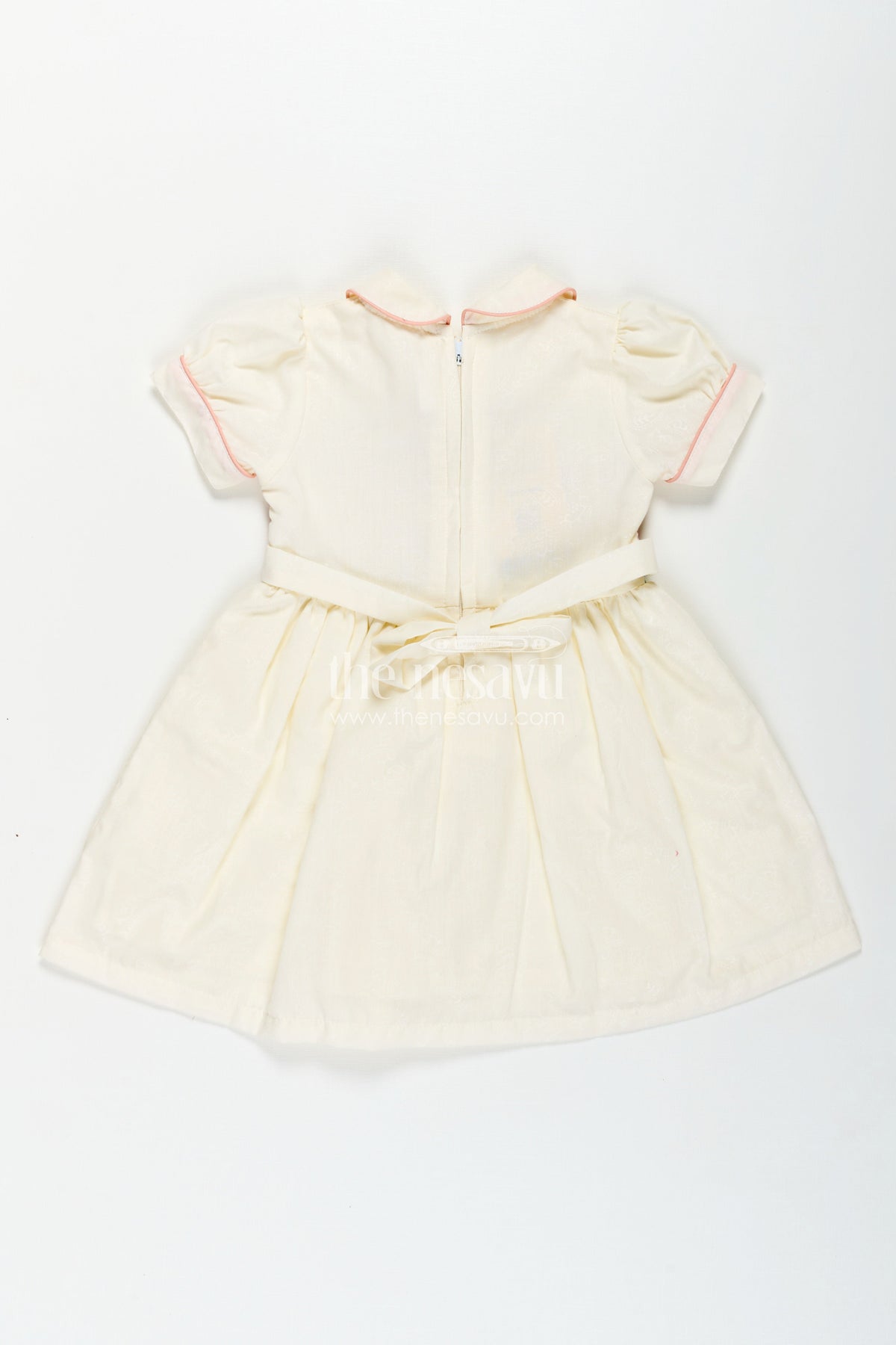 Brighten up everyday dressing with this short frock white colour made from a comfortable cotton blend that combines elegance with playful detailing. The frock features a creamy white base complemented by a colorful smocked yoke in rainbow hues lavender, coral, peach, and mint giving it a textured and vibrant appeal. The Peter Pan collar and puff sleeves are trimmed with pink piping for added charm. Its gathered waistline adds volume and flow, making it ideal for infants and toddlers alike. Lightweight, breathable, and easy to maintain, this dress makes a sweet addition to casual and semi-formal wardrobes.