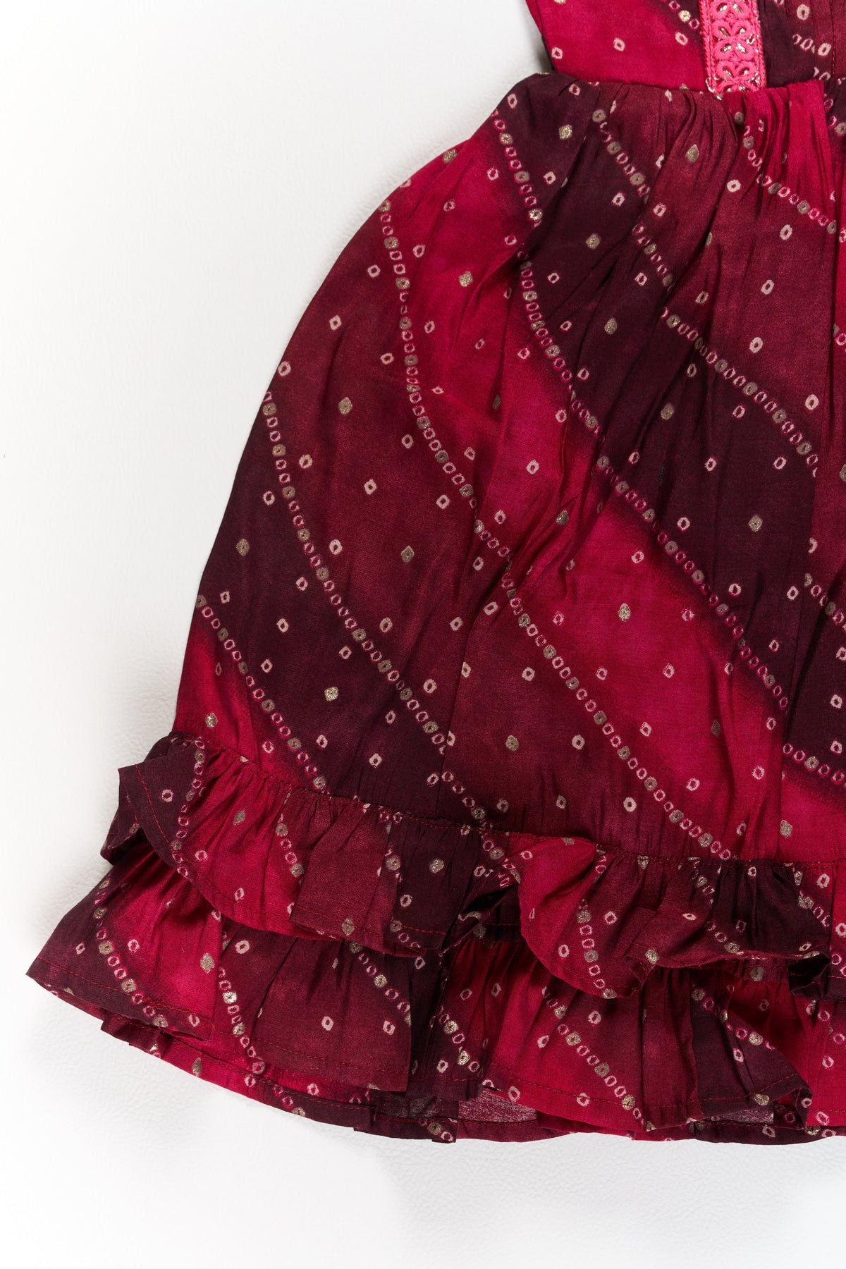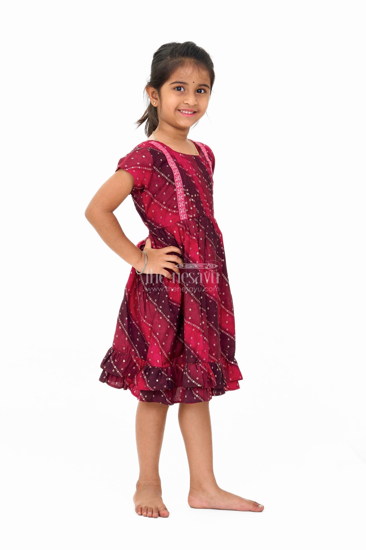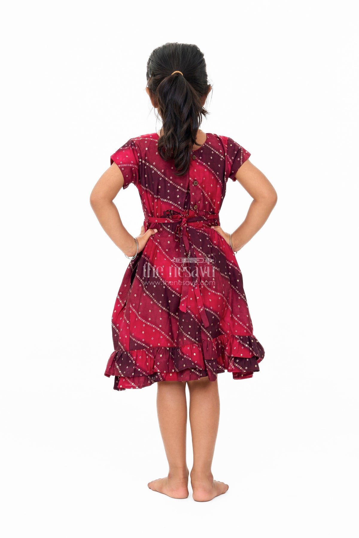 This stunning pink cotton frock is designed to add a touch of elegance to your little girl’s wardrobe. Featuring a beautiful Bandhani-inspired print with delicate gold accents, this dress is perfect for festive occasions and casual outings alike. The soft cotton fabric ensures breathability and comfort, making it ideal for all-day wear. The layered ruffle hem enhances its twirl-worthy charm, while the lace detailing on the bodice adds an extra touch of sophistication. Whether styled with traditional footwear for festive gatherings or paired with casual sandals for an everyday look, this frock is a must-have.