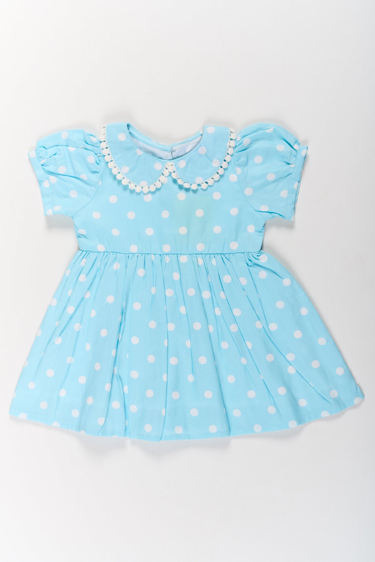 Give your little girl a classic and timeless look with this traditional blue attire featuring a cheerful polka dot print. This dress is adorned with a delicate Peter Pan collar trimmed with lace, short puff sleeves, and pleats that flow into a charming flared skirt. Made from a soft cotton-blend fabric, this outfit ensures both comfort and style. Perfect for festive gatherings, family functions, or traditional celebrations, this dress is a versatile addition to your child’s wardrobe.