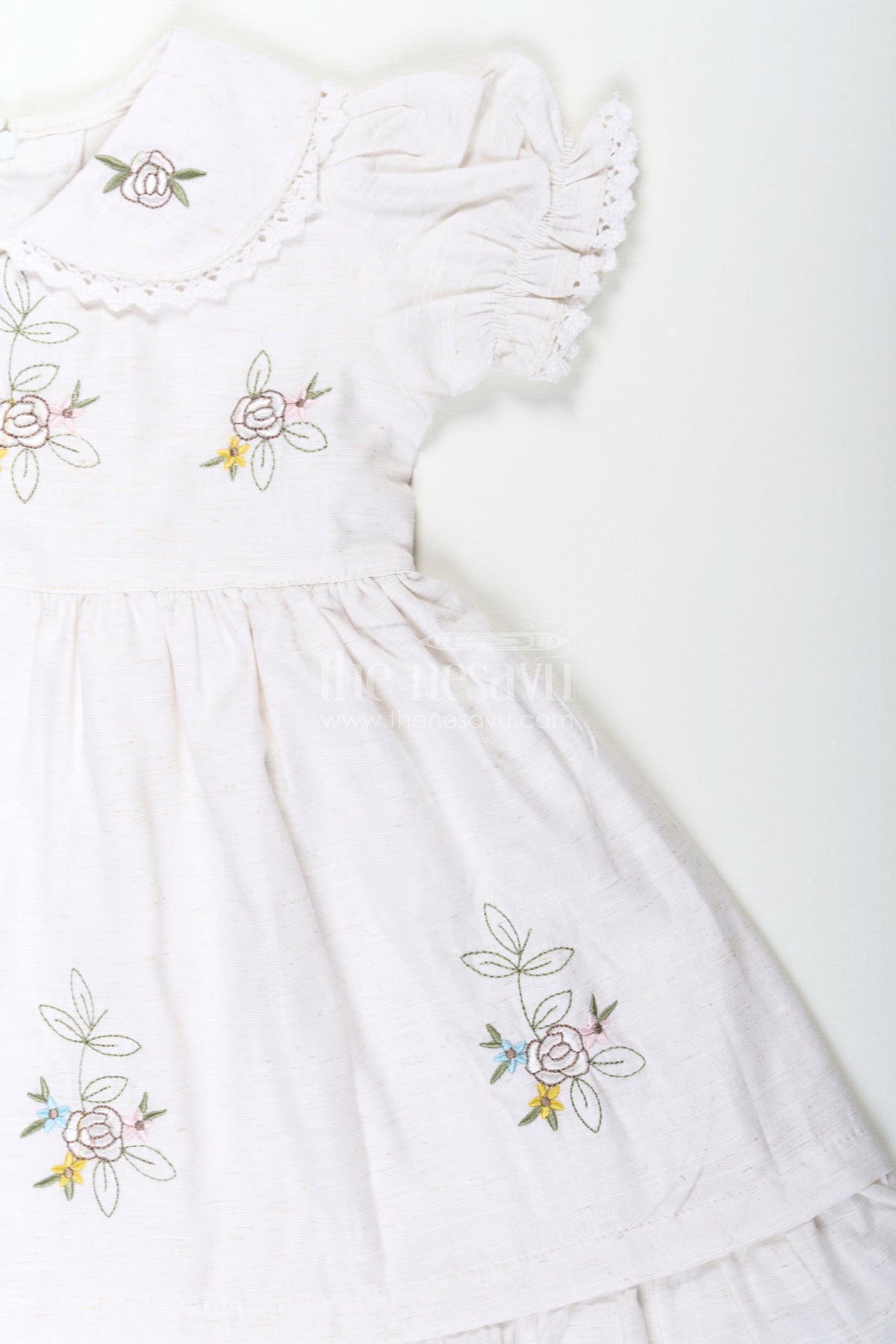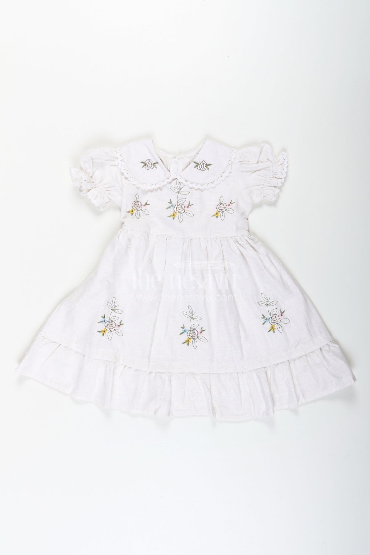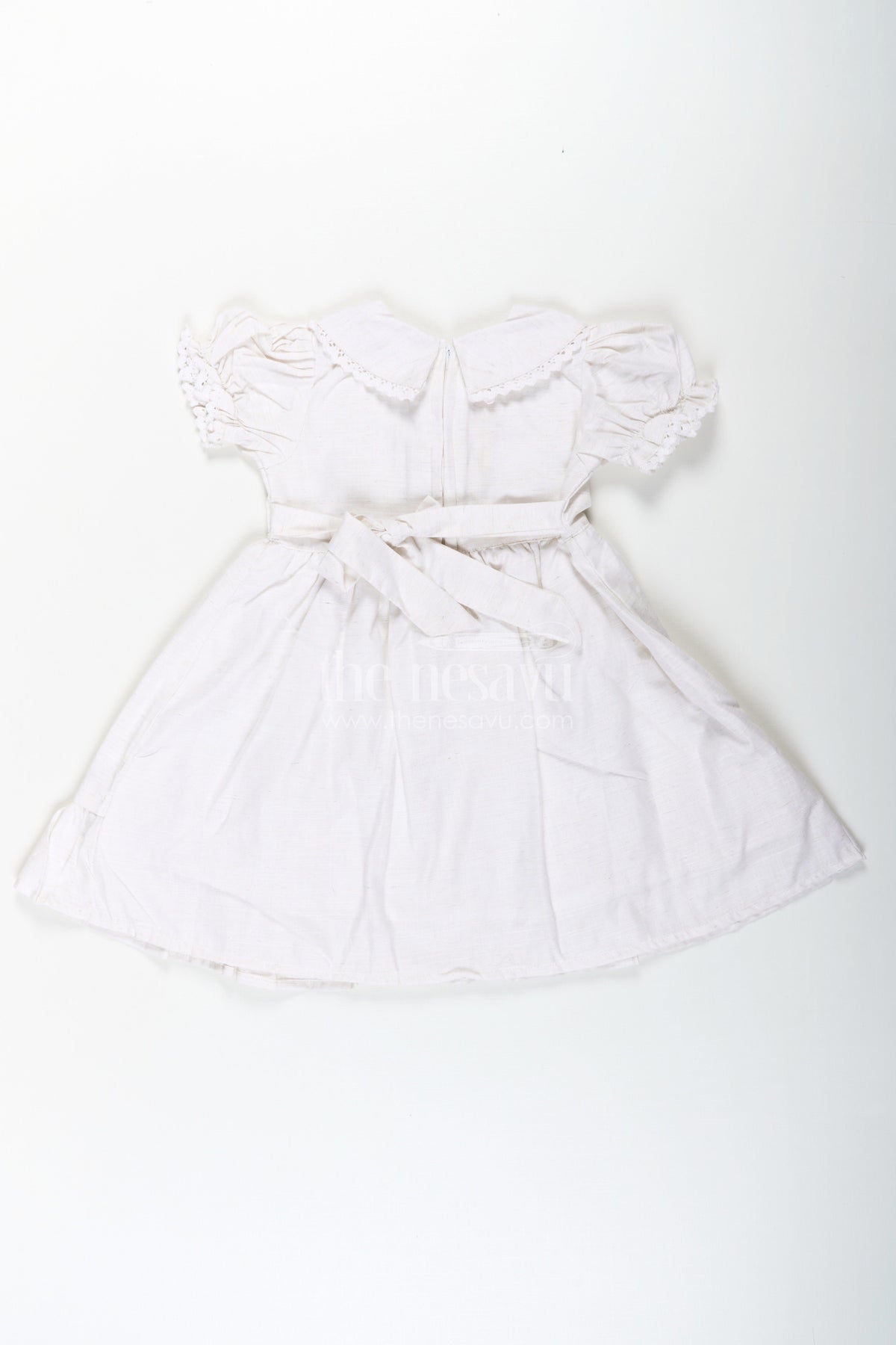 White cotton frocks get a delicate upgrade in this Nesavu piece featuring sweet floral embroidery on lightweight cotton. The frock includes puff sleeves, a peter pan collar with lace trim, and a soft flared hemline for a girlish, vintage-inspired look. The breathable cotton fabric ensures all-day comfort, making it perfect for daily wear, outings, or casual gatherings. A classic white dress with playful details that makes every moment feel special.