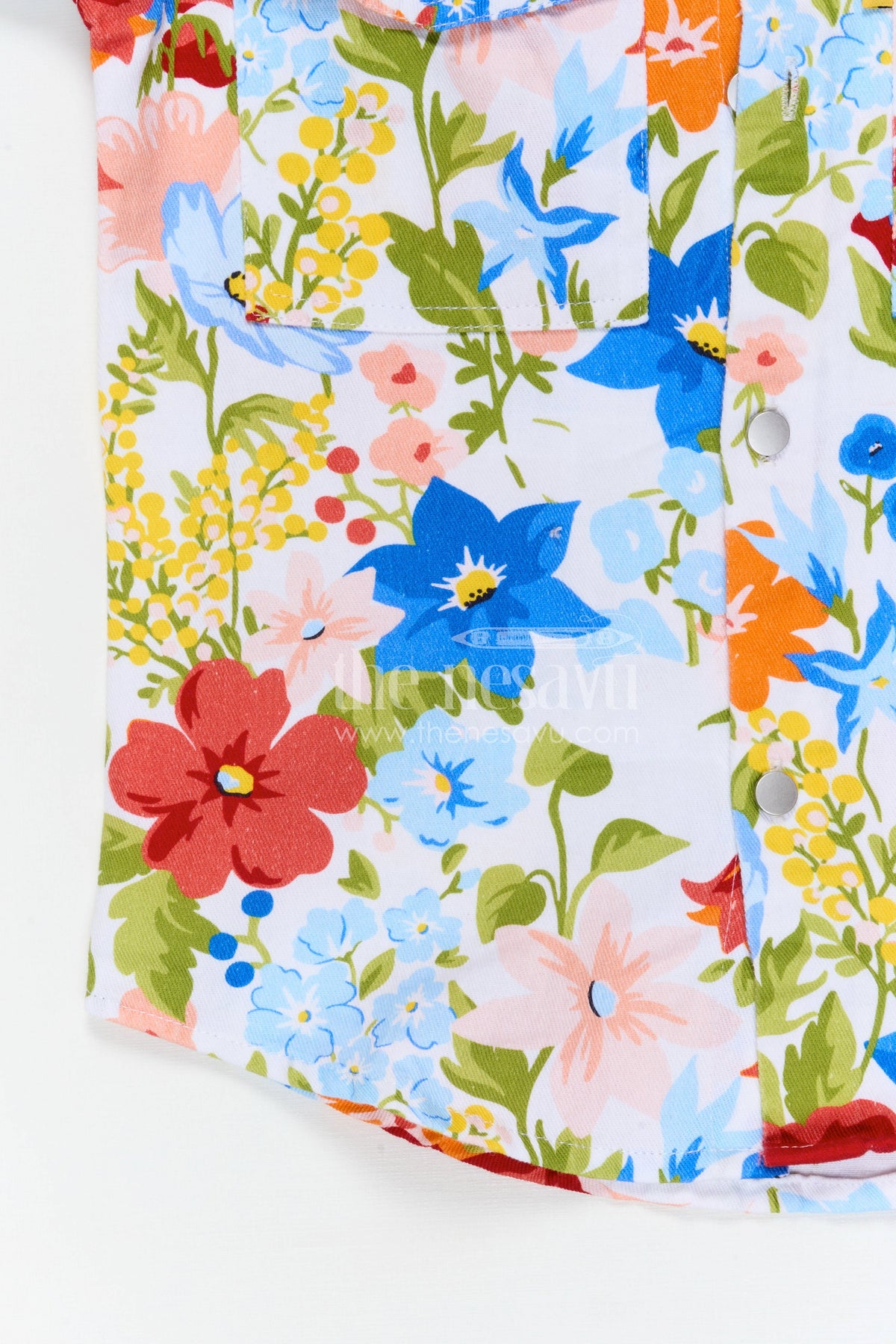 - The shirt features vibrant floral digital prints that create a lively and playful appearance