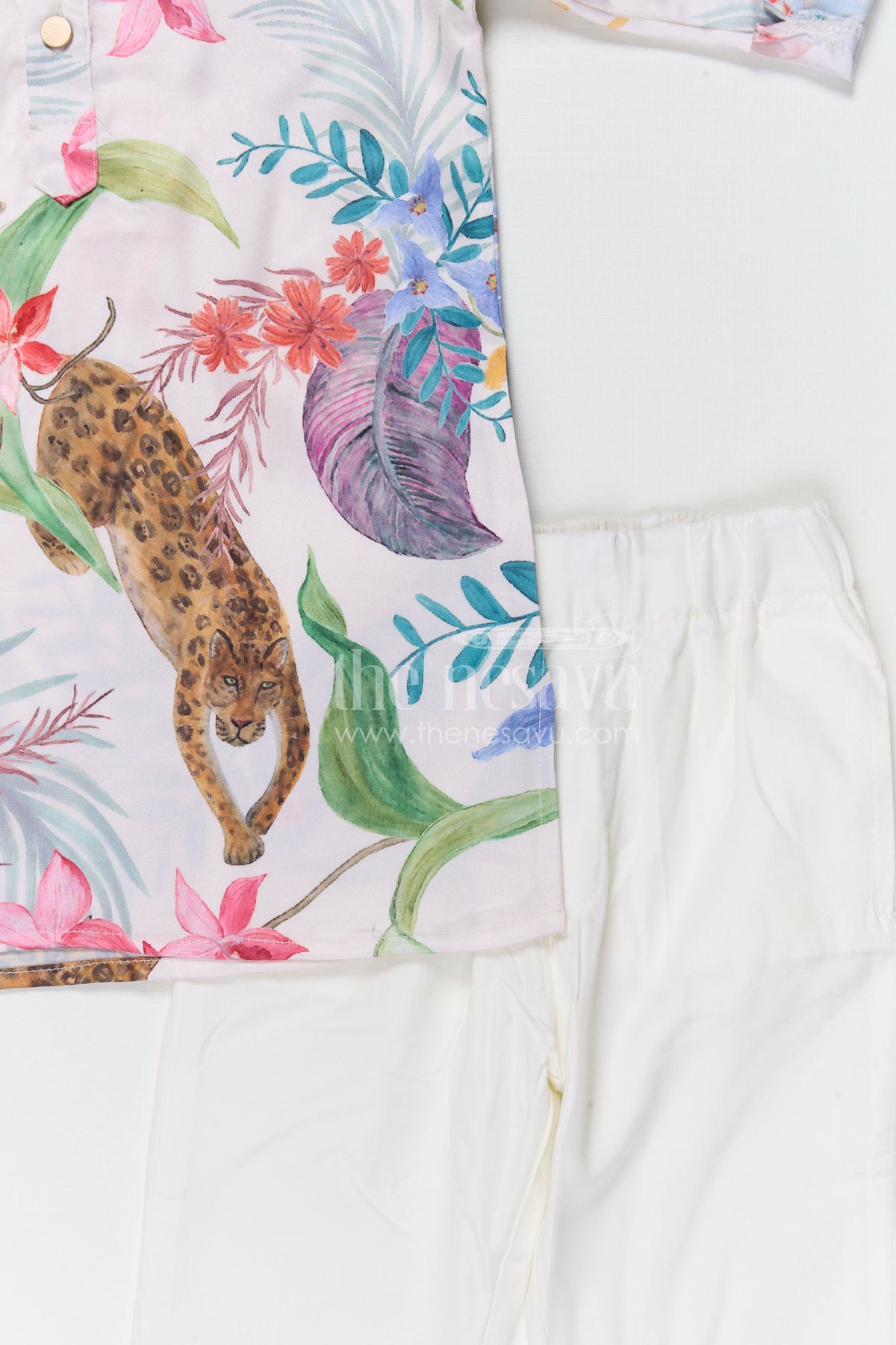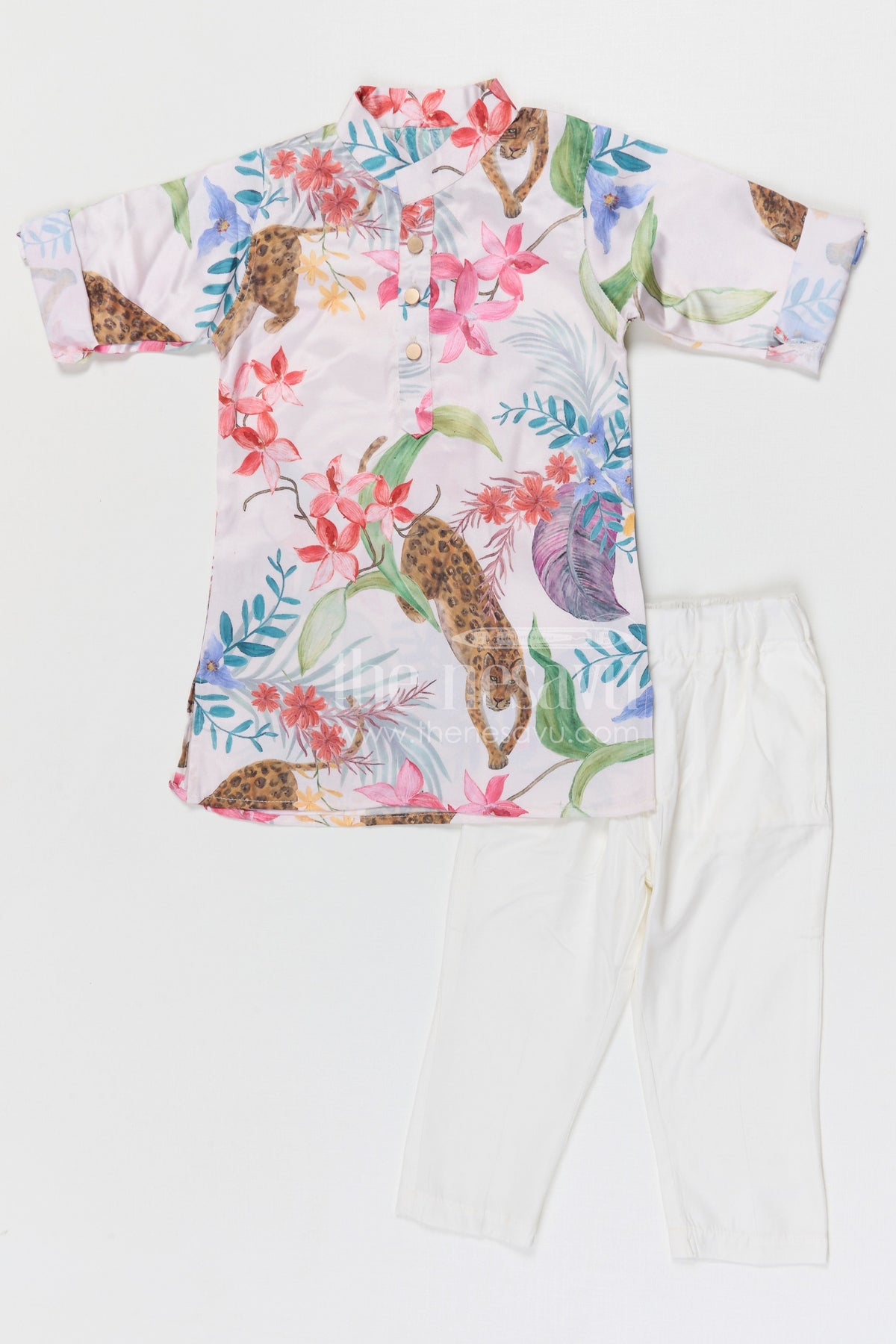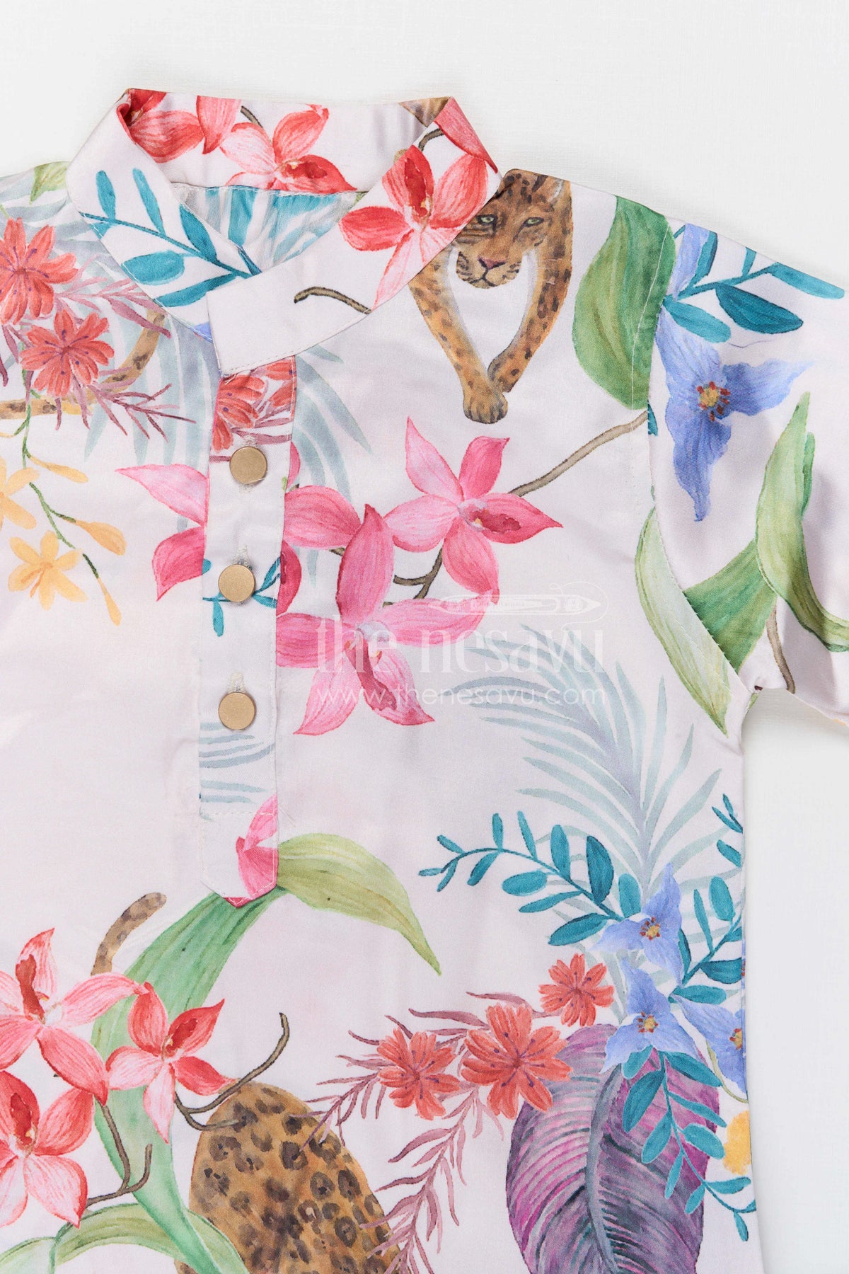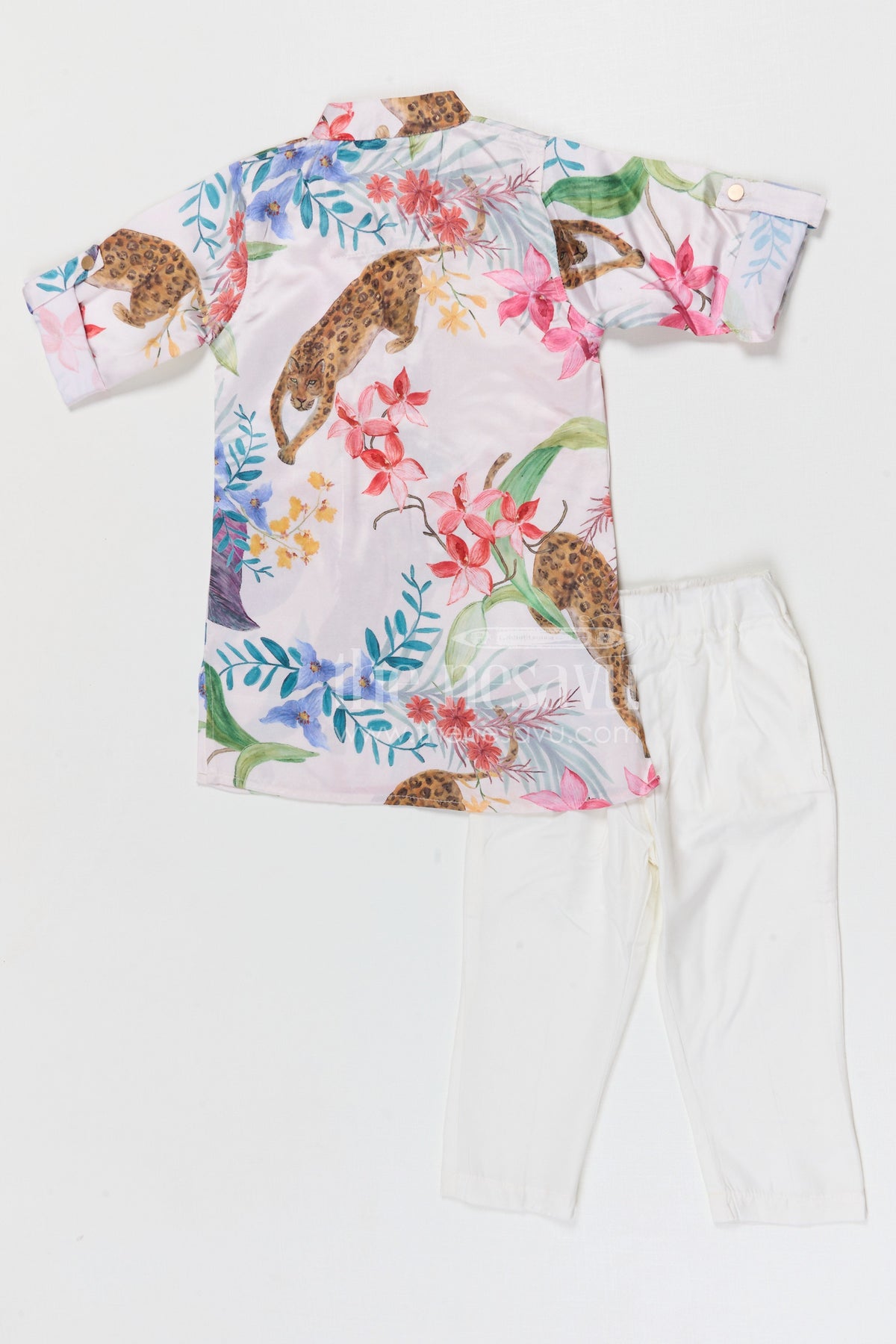 - The kurta features vibrant digital prints with floral and wildlife motifs that give the outfit a unique festive character