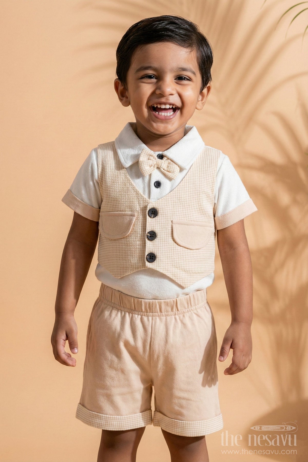 This charming two-piece cotton outfit is the perfect pick for new born clothes on sale. The set includes a soft white shirt with beige accents, featuring a checkered vest-style design and an adorable bowtie for a dapper touch. Paired with beige elasticated shorts, this outfit offers a blend of style and comfort. Designed with soft, breathable cotton, it’s gentle on your baby’s delicate skin, making it suitable for family gatherings, photoshoots, or casual outings.
