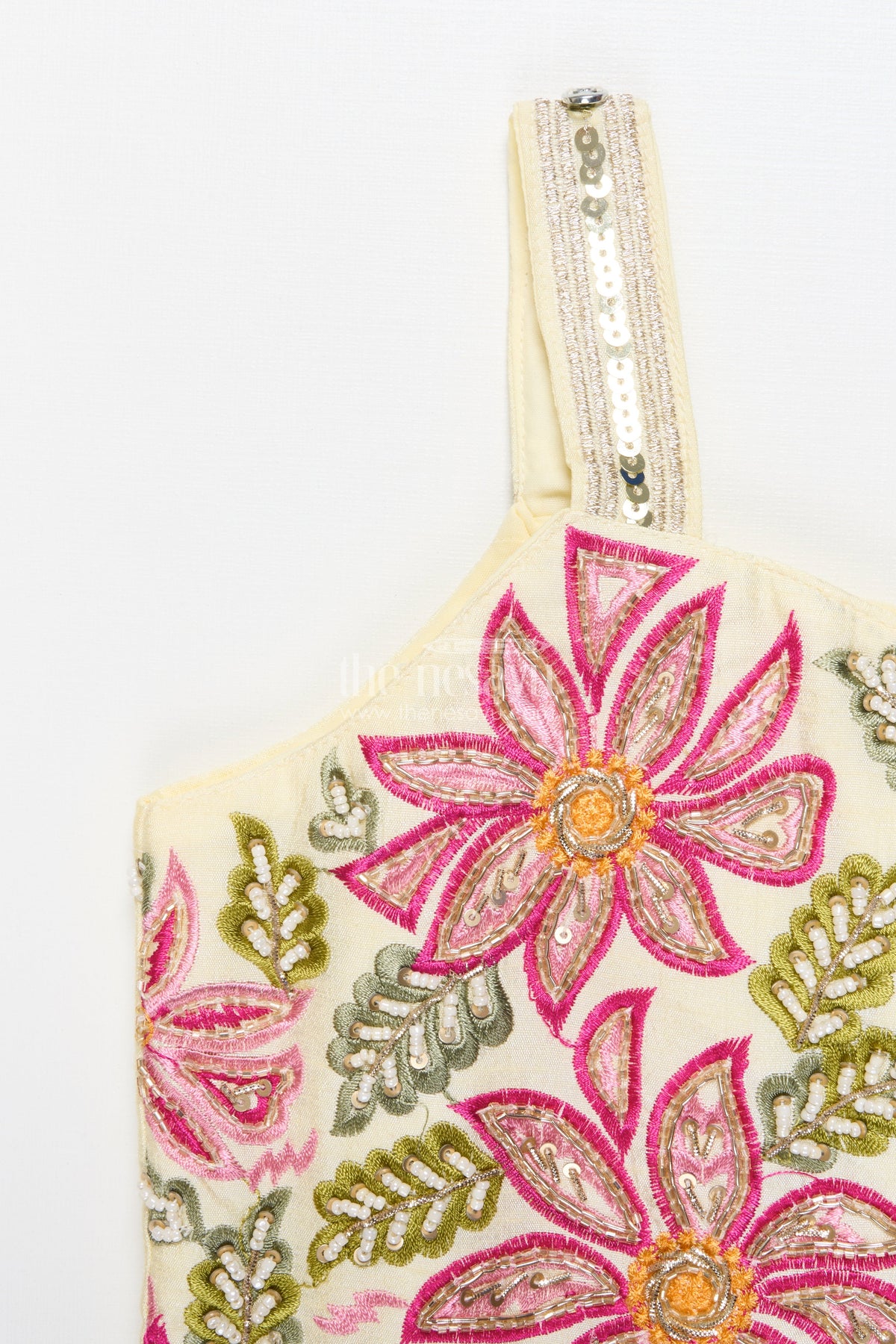 • This floral embroidered lehenga choli for girls is crafted from soft muslin silk for a smooth feel