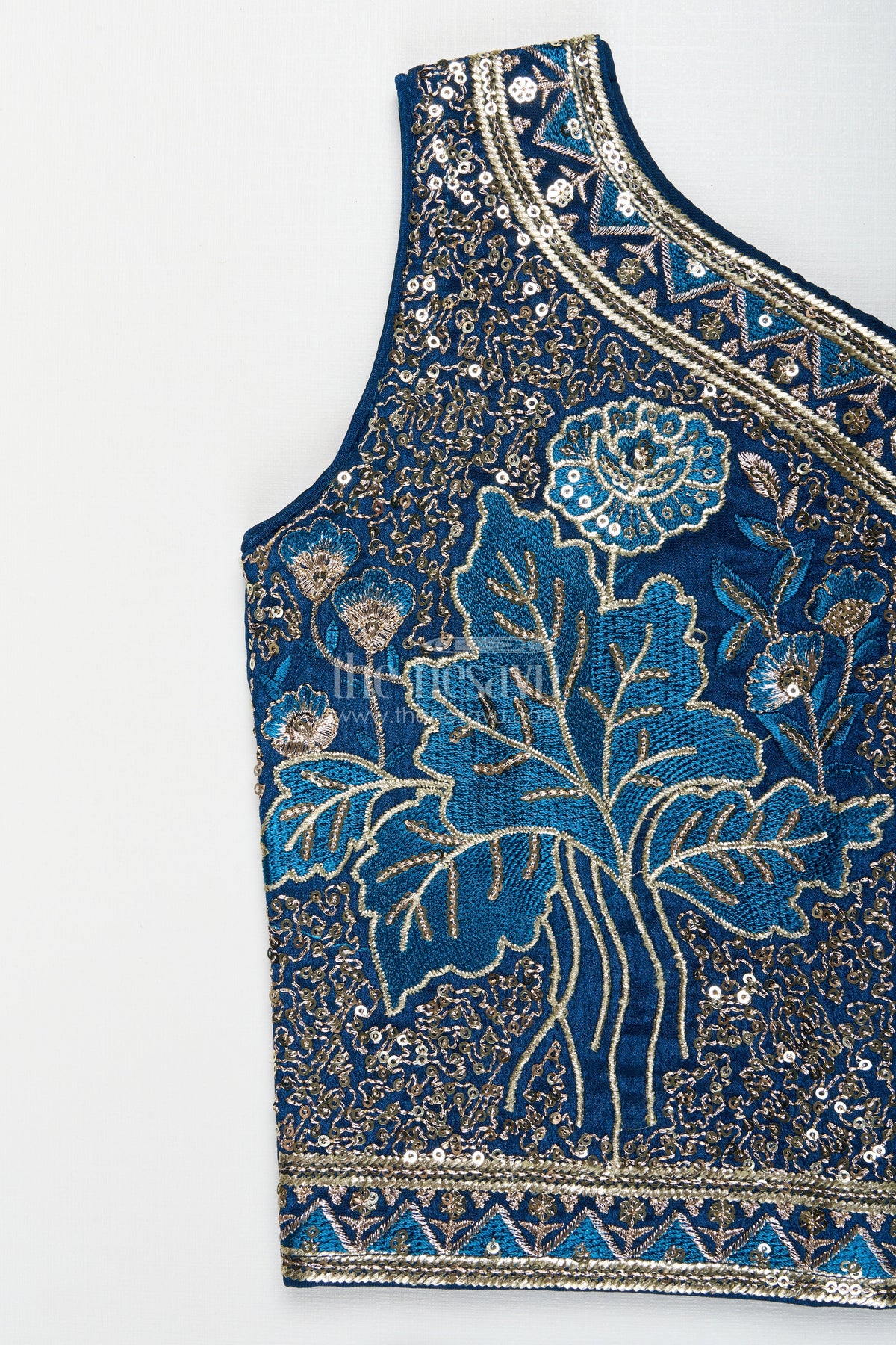 • The blouse showcases detailed floral and foliage embroidery with sequins and zari