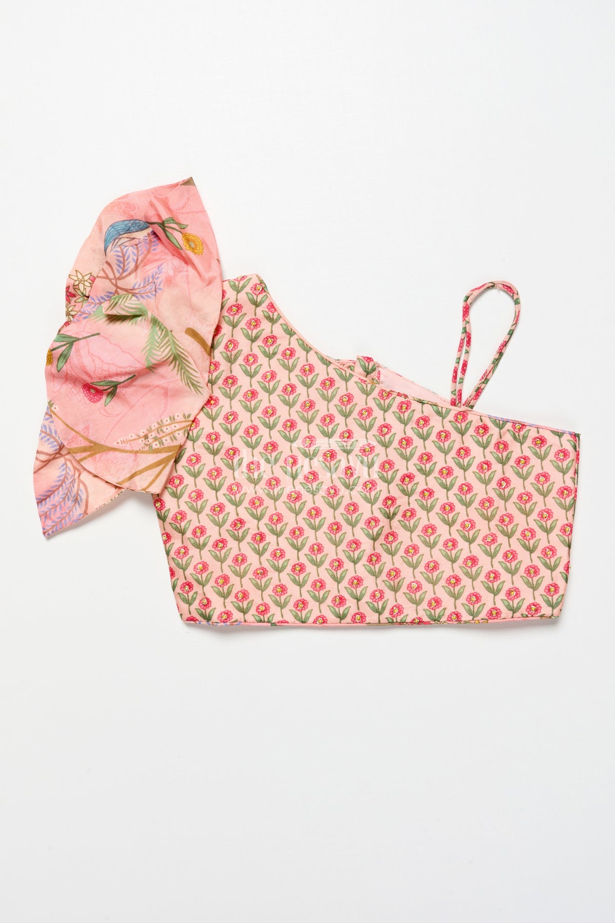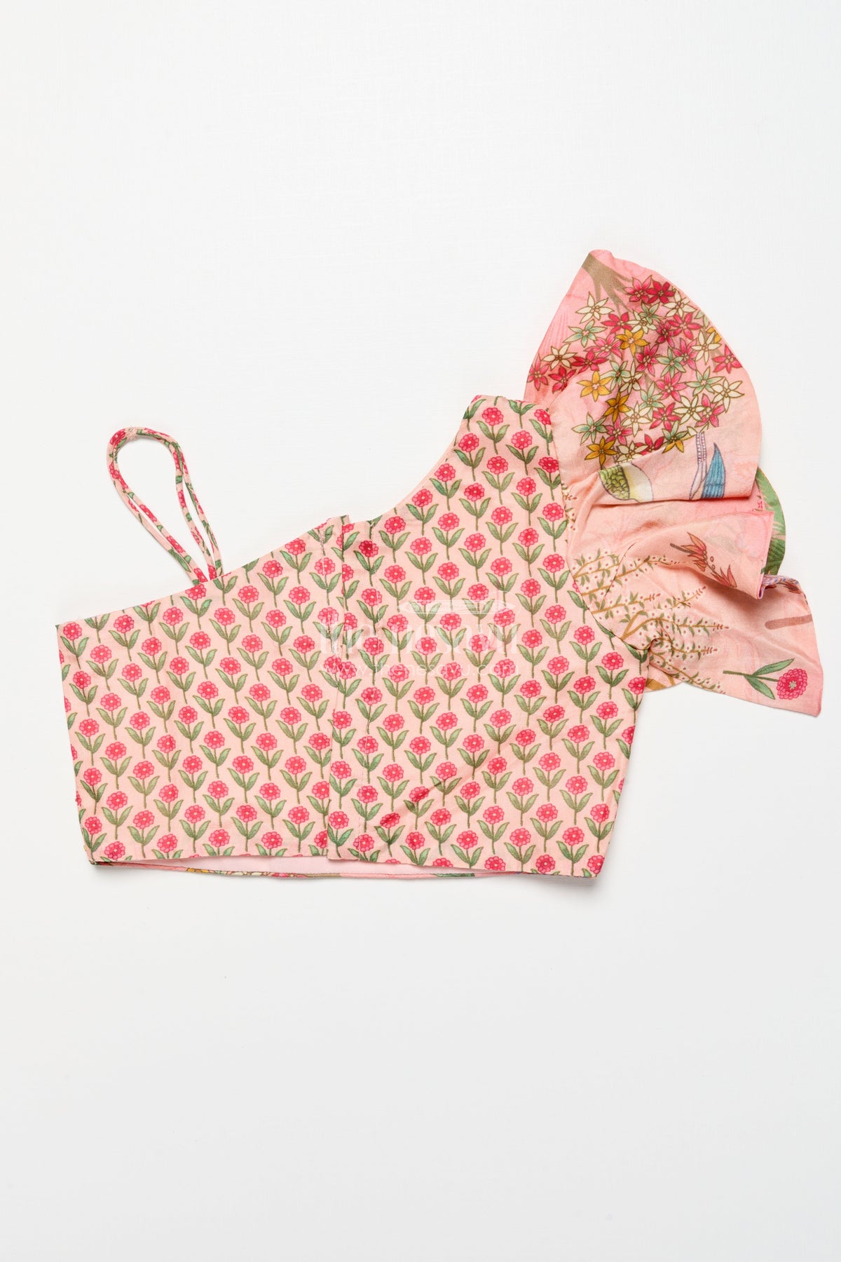 - One-shoulder blouse with stylish ruffle sleeve adds a modern, trendy touch