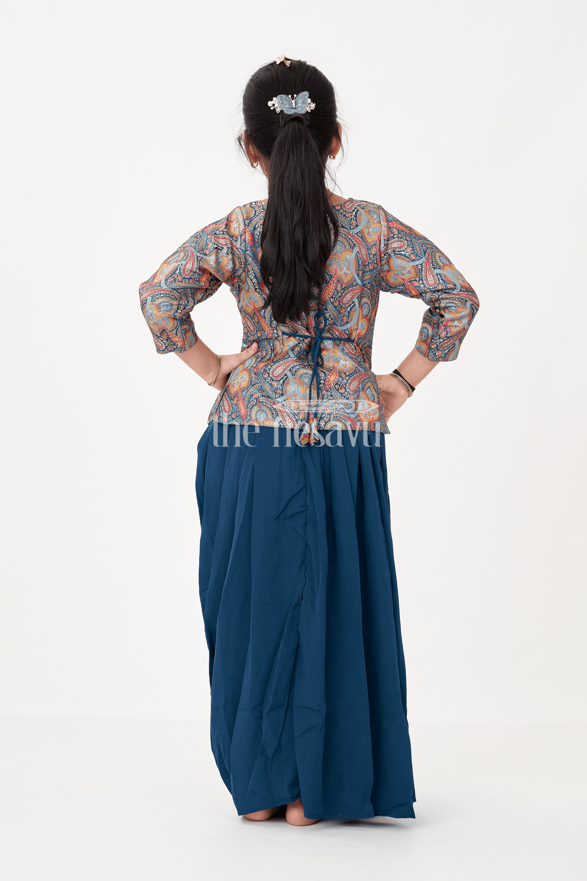 Blue colour lehenga takes a refined turn in this Nesavu girls’ sharara set crafted from smooth glaze organza. The top features vibrant paisley digital prints in multicolor hues while the deep blue pleated sharara bottom adds a graceful contrast. Full sleeves and a structured cut lend a formal touch, making it ideal for weddings, poojas, or celebratory occasions. Lightweight yet elegant, this set merges traditional prints with a modern silhouette, ensuring comfort without compromising on style.