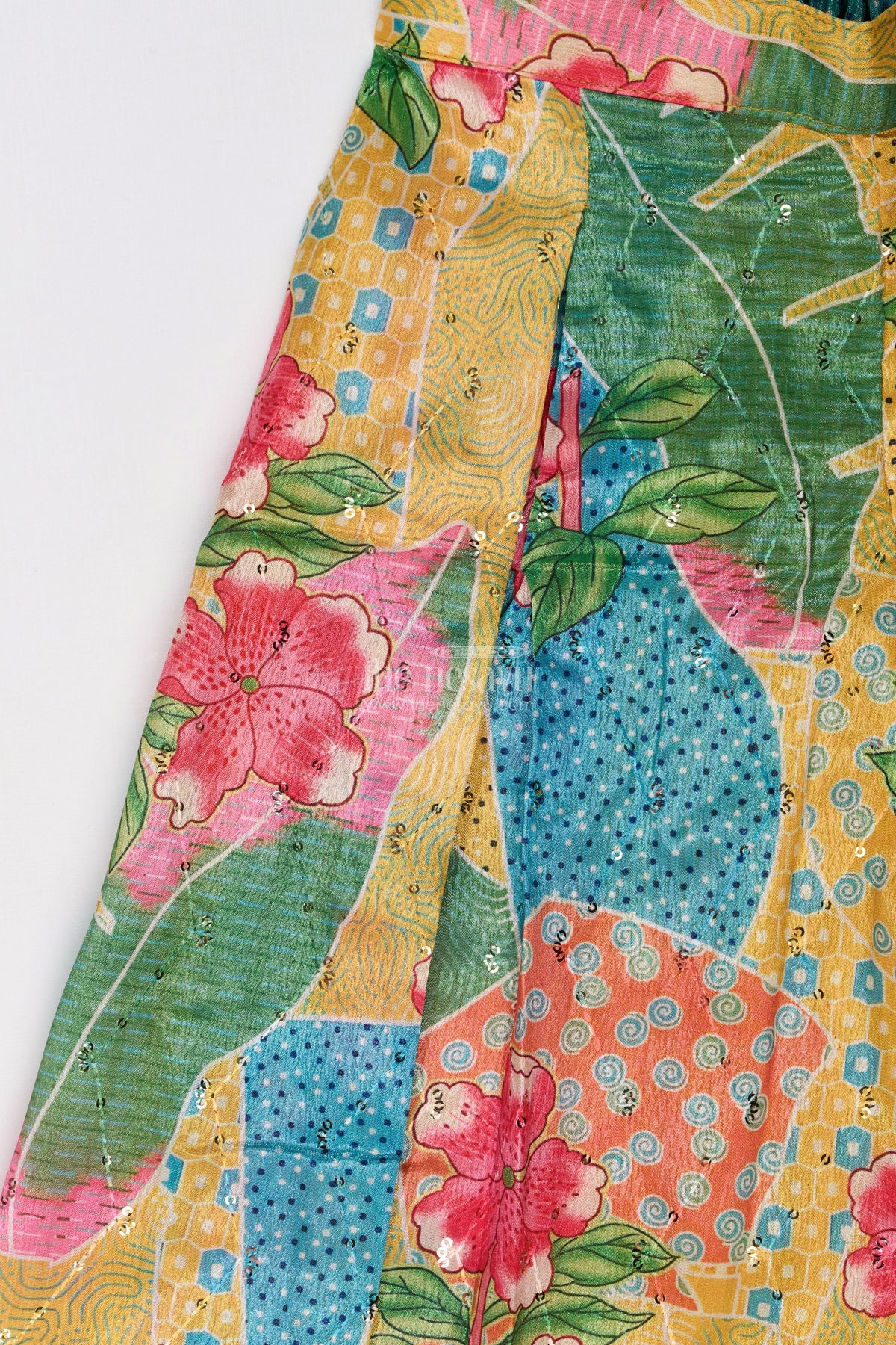 Let your little one shine in this vibrant choli plazo suit, crafted from soft Chinon silk digital print fabric. The floral-printed plazo pants feature a flared silhouette, ensuring comfort and style. The sleeveless choli top is intricately embellished with embroidery and mirror work, adding a touch of festive elegance. Paired with a matching sheer dupatta, this set is a perfect choice for weddings, traditional events, and festive celebrations. The breathable fabric ensures all-day comfort, while the stylish detailing makes it a standout ensemble.