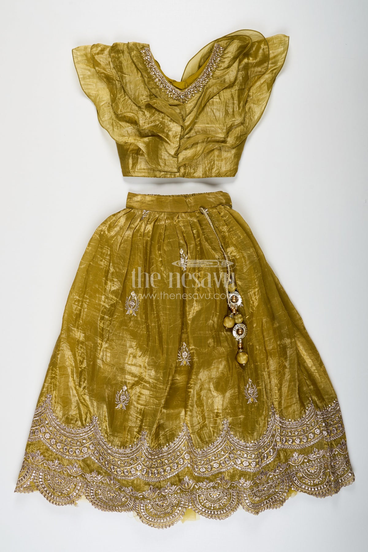 Indian traditional wear meets timeless style in this elegant olive green lehenga choli crafted from a rich organza blend. The ensemble features a heavily zari-embroidered lehenga with an ornate scalloped hem and matching motifs throughout the skirt. The top stands out with its layered ruffle design and embellished neckline, blending comfort and sophistication effortlessly. A matching dupatta with zari trim completes the set, offering a refined and festive appeal. Lightweight and breathable, this outfit ensures all-day ease for little girls during cultural events and family celebrations. The tie-up tassels with bead detailing add a playful traditional charm to this graceful attire.
