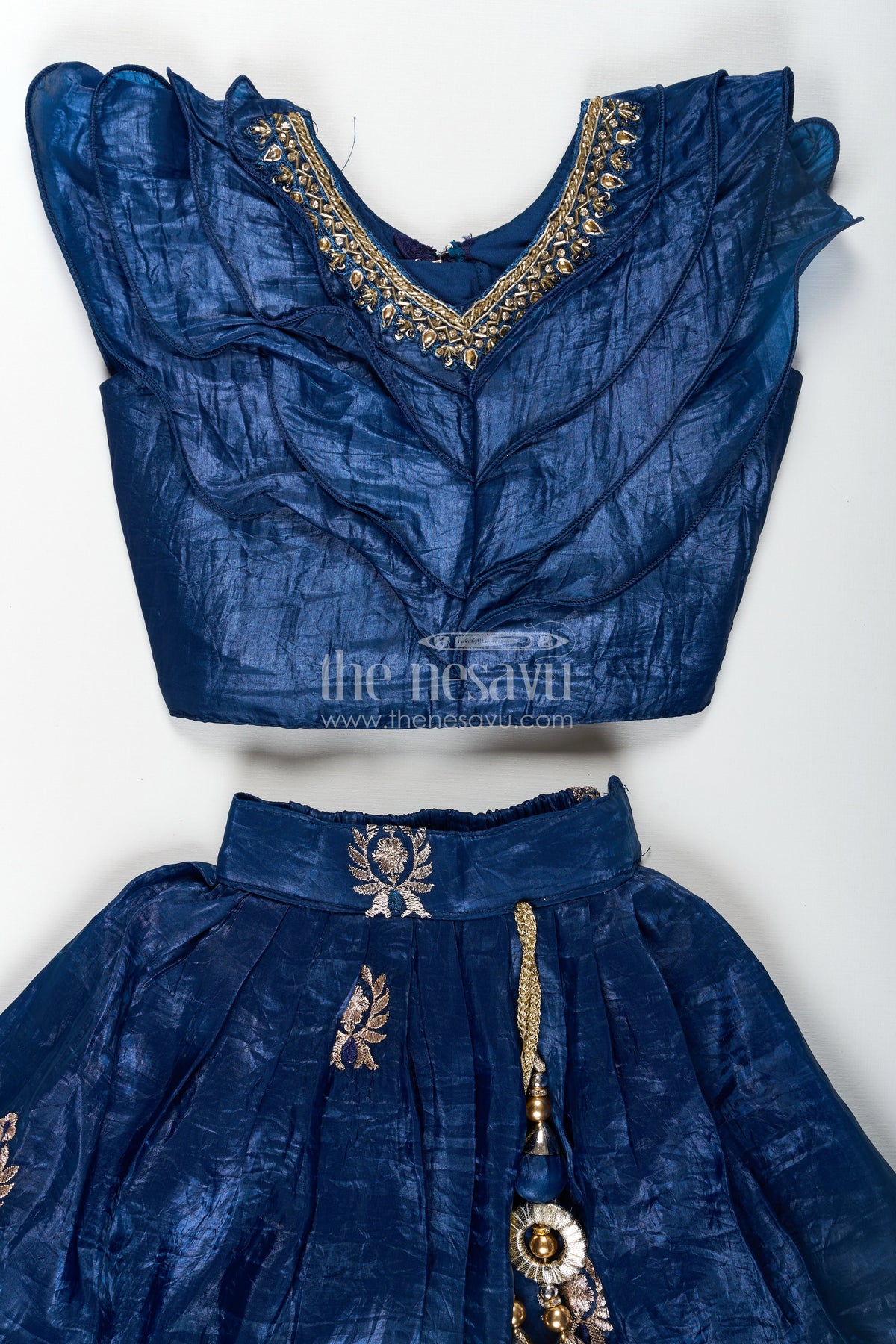 Girl Party Dress made for memorable occasions, this navy blue lehenga choli is a sophisticated blend of traditional embroidery and contemporary silhouette. The outfit features an organza lehenga richly adorned with golden zari motifs and an intricately bordered hemline. The blouse includes cascading ruffle layers with a gently embroidered neckline, adding flair to the design. Coordinated with a soft dupatta trimmed in gold, the set is a head-turning ensemble for weddings and festive celebrations. Lightweight and airy, this outfit balances festive grandeur with comfort—perfect for twirls and giggles all day long.