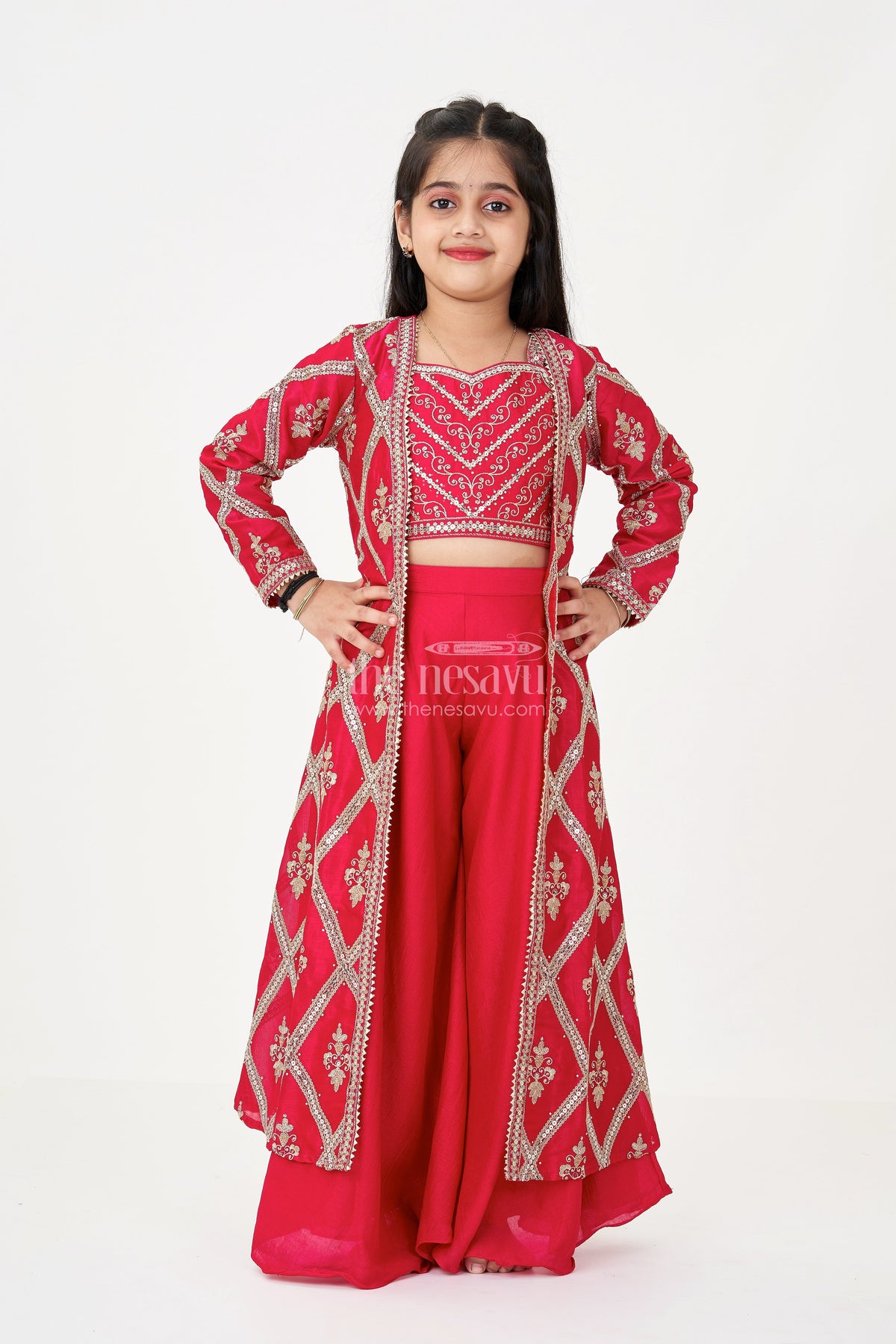 The Nesavu Girls Sharara / Plazo Set Girls Readymade Sharara Set in Maroon Georgette with Embroidered Jacket and Spaghetti Top Nesavu 22 (4Y) / Pink GPS574A-22 Nesavu Girls Maroon Readymade Sharara Set Georgette Embroidered Jacket Mirror Work