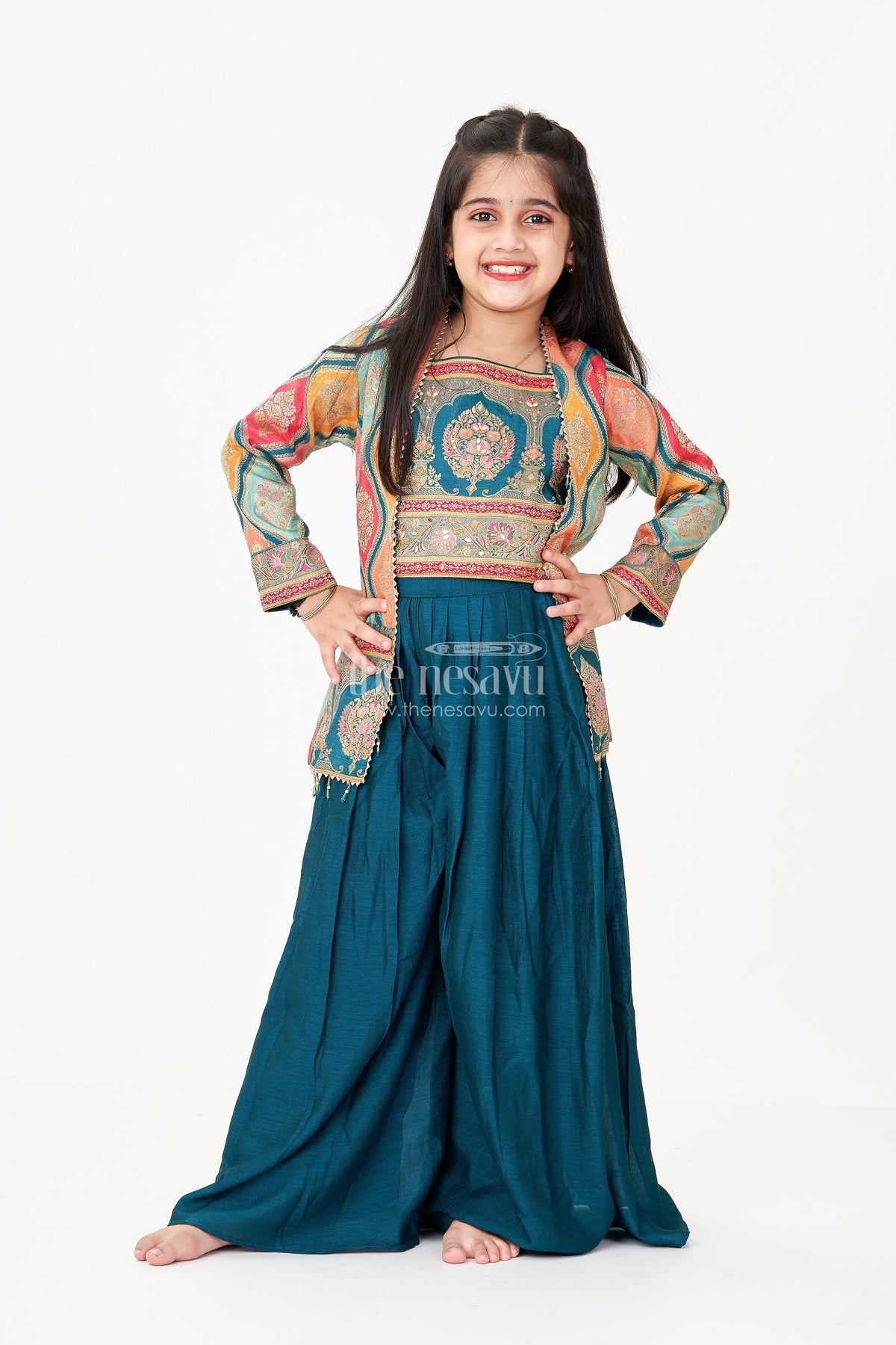 The Nesavu Girls Sharara / Plazo Set Sharara Suit for Girls in Pure Viscose Silk with Digital Print Jacket and Sleeveless Top Nesavu Nesavu Sharara Suit Girls Viscose Silk Multicolor Digital Print Jacket Sharara Pant